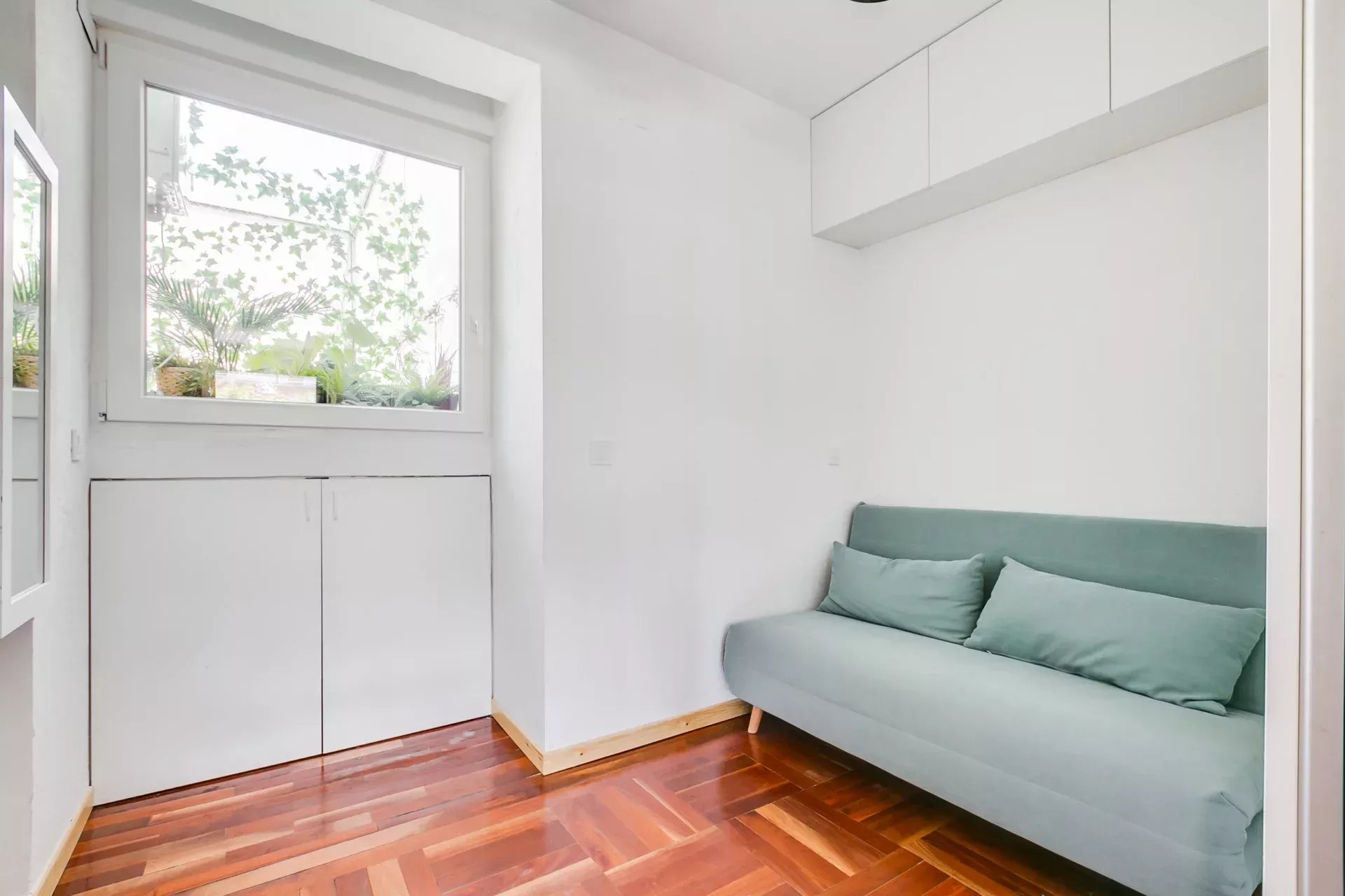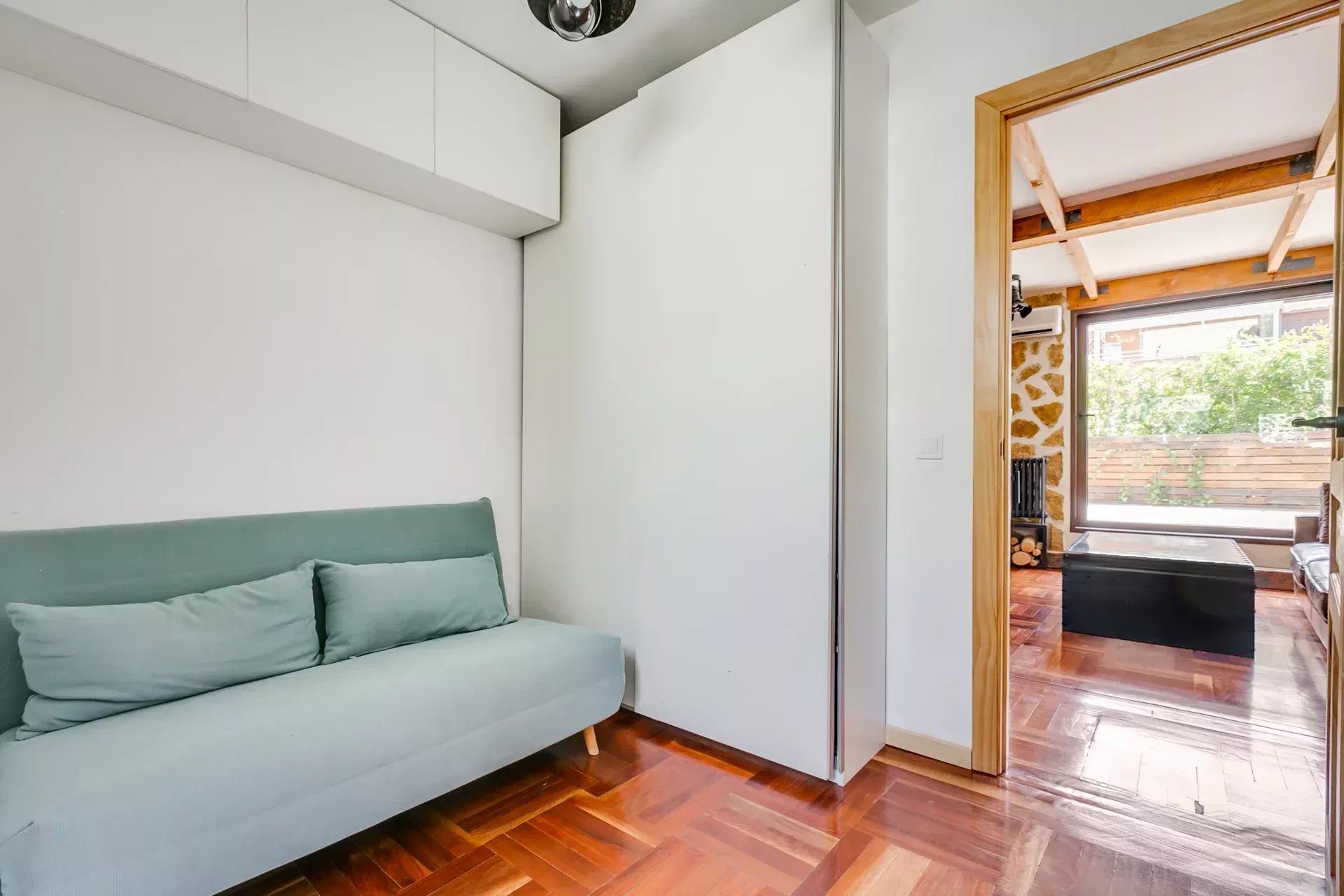Trois fenêtres PVC double vitrage rétractables permettent une connexion directe avec l’extérieur et inondent la pièce de lumière naturelle grâce à une excellente orientation sud-ouest.