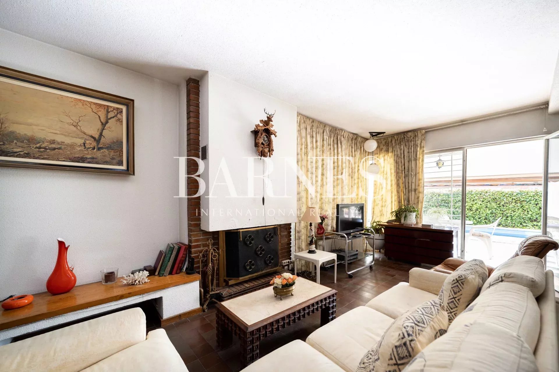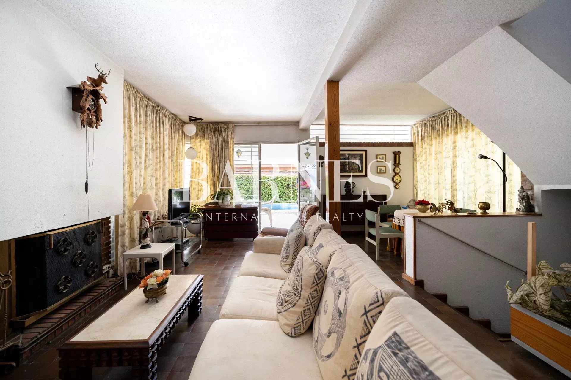 Le rez-de-chaussée et l'extérieur se composent d'un petit jardin, d'un porche, d'une piscine et d'un garage. On accède à la maison par l'entrée principale, le porche et le garage, où l'on trouve un grand salon avec cheminée, une salle à manger, une cuisine indépendante et un petit salon.
