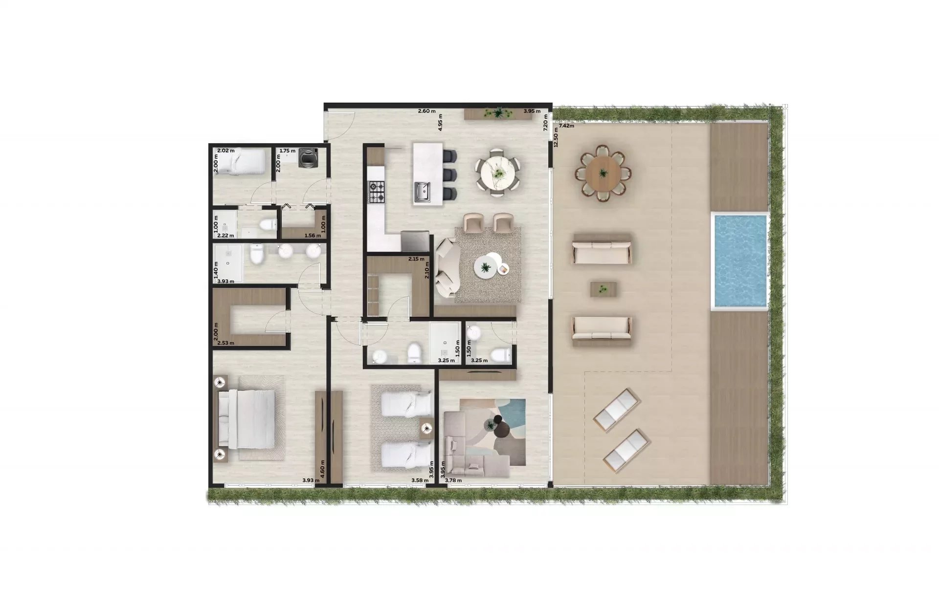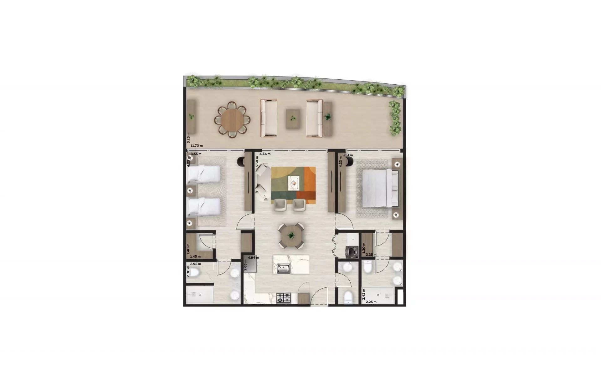 Les logements du rez-de-chaussée disposent d’un jardin privé ou d’un jacuzzi, tandis que les étages supérieurs offrent des vues panoramiques spectaculaires.