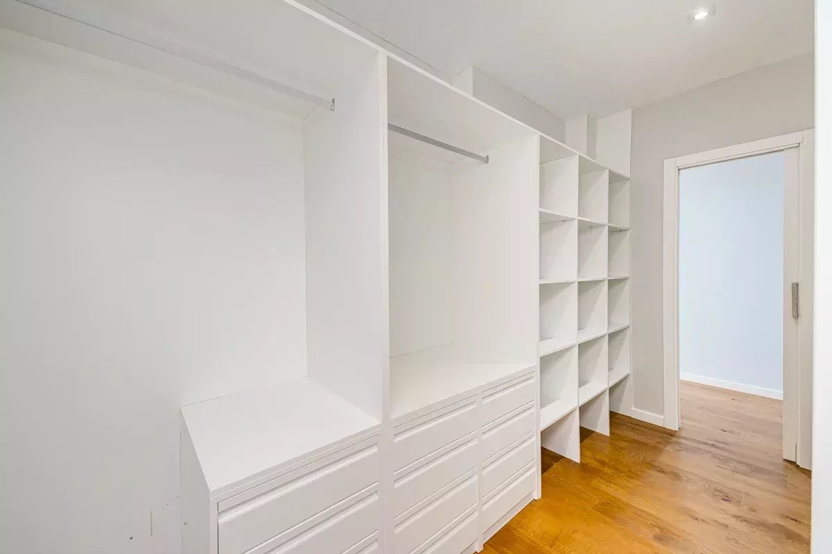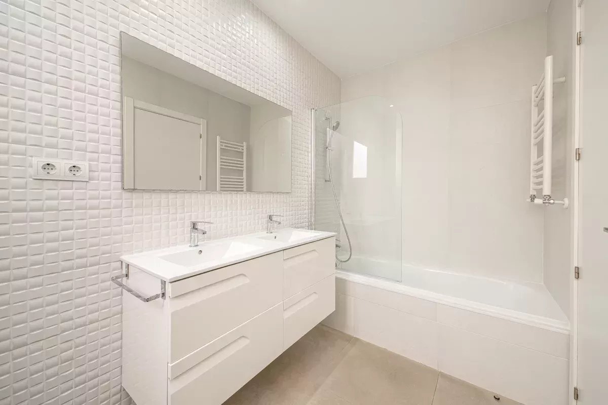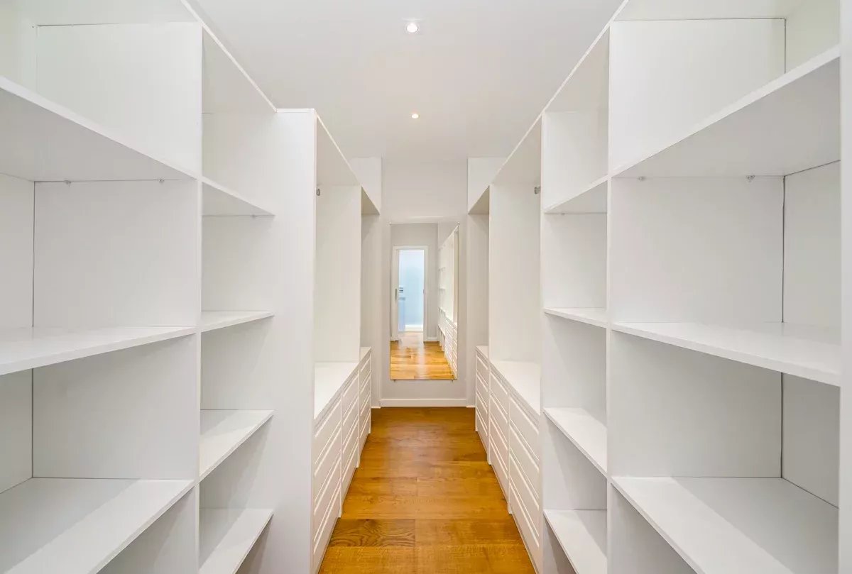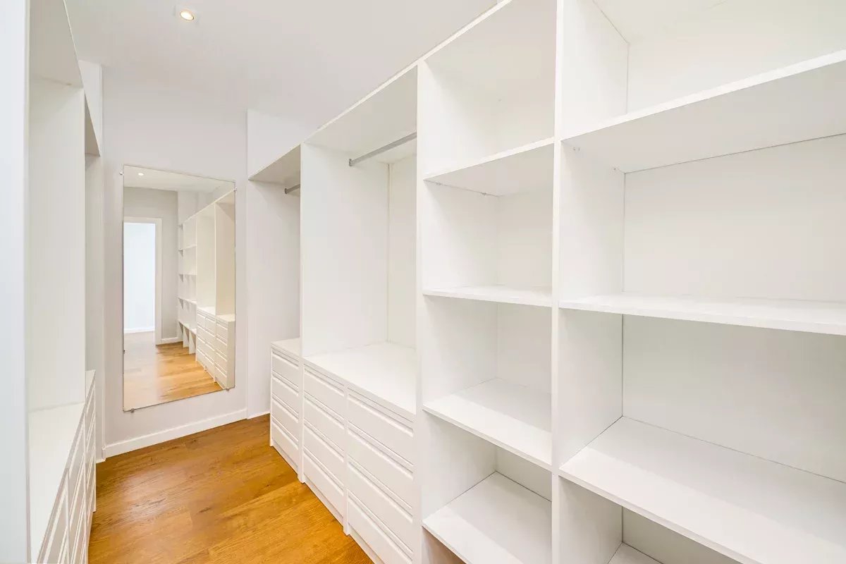 The private quarters comprise two bedrooms. The first, located near the entrance, is served by a stylish independent full bathroom. At the far end of the apartment, the principal suite offers an intimate and luminous retreat, complete with a generous walk-in wardrobe crafted in white-lacquered wood and a well-appointed en-suite bathroom.