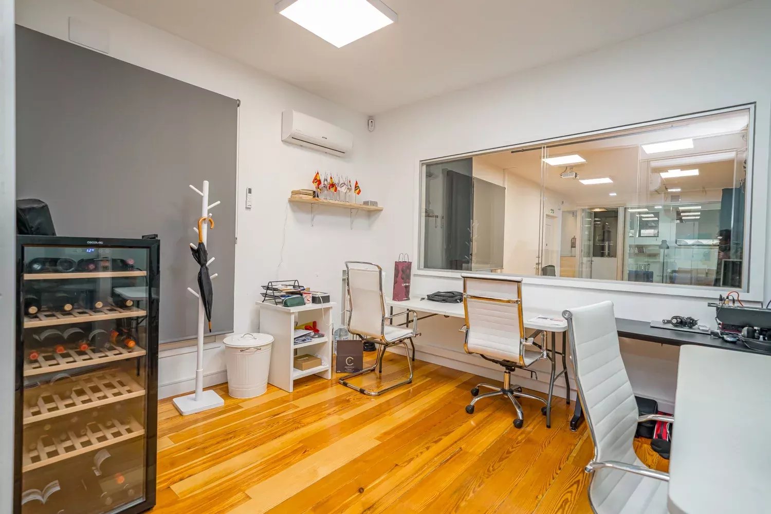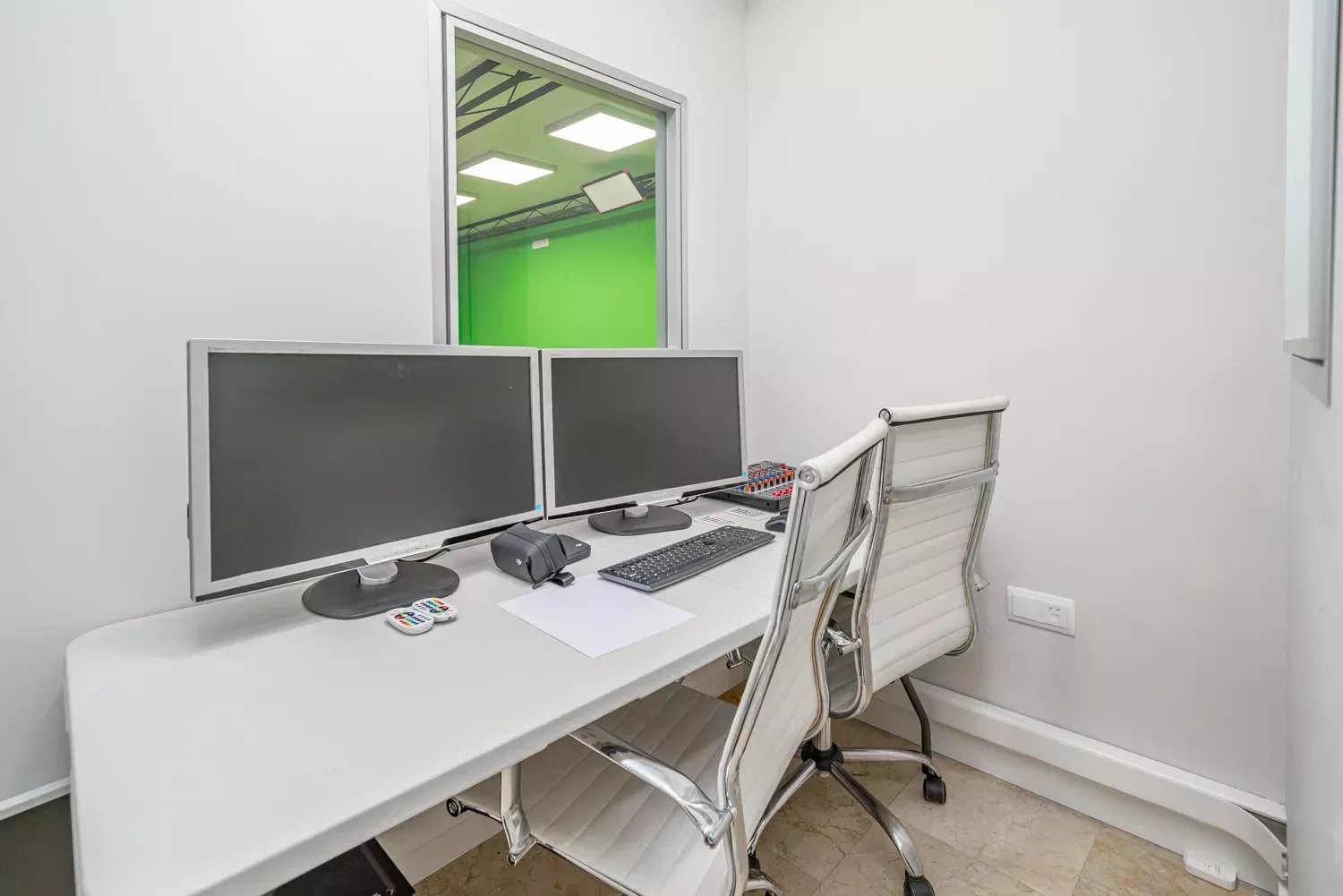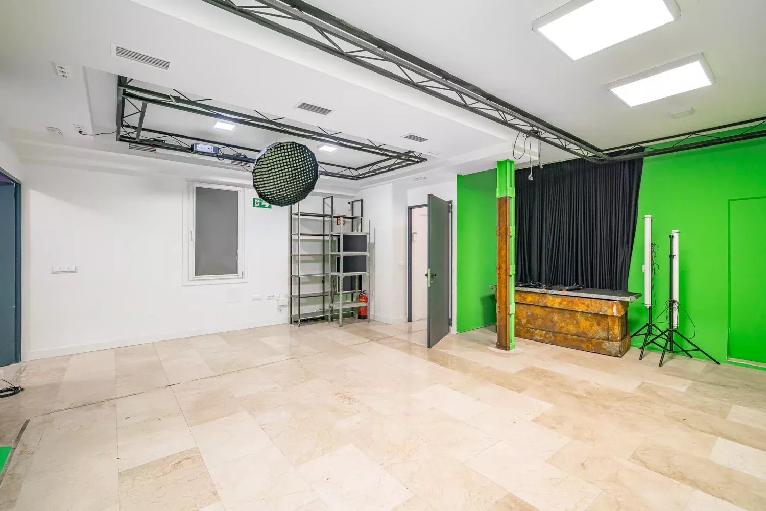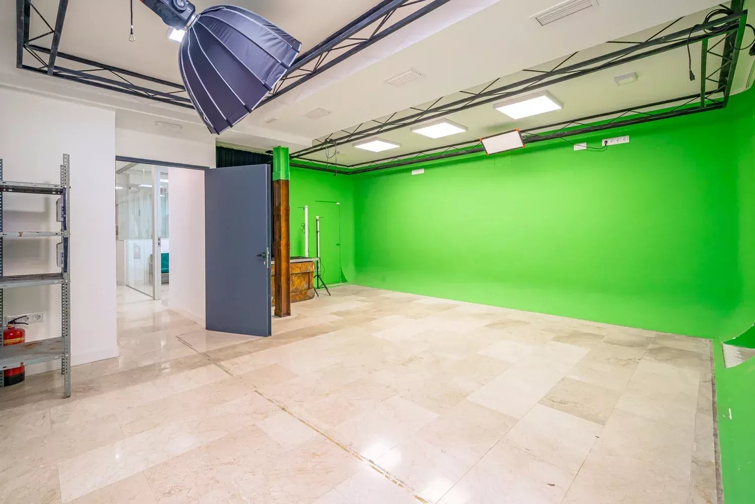 Here there is a main room with three soundproof booths, a green recording studio, a recording room, and a soundproof studio, as well as a small kitchen and bathrooms. The premises are specially designed for activities related to TV recording, reporting, or audiovisual productions that require professional soundproofing.
