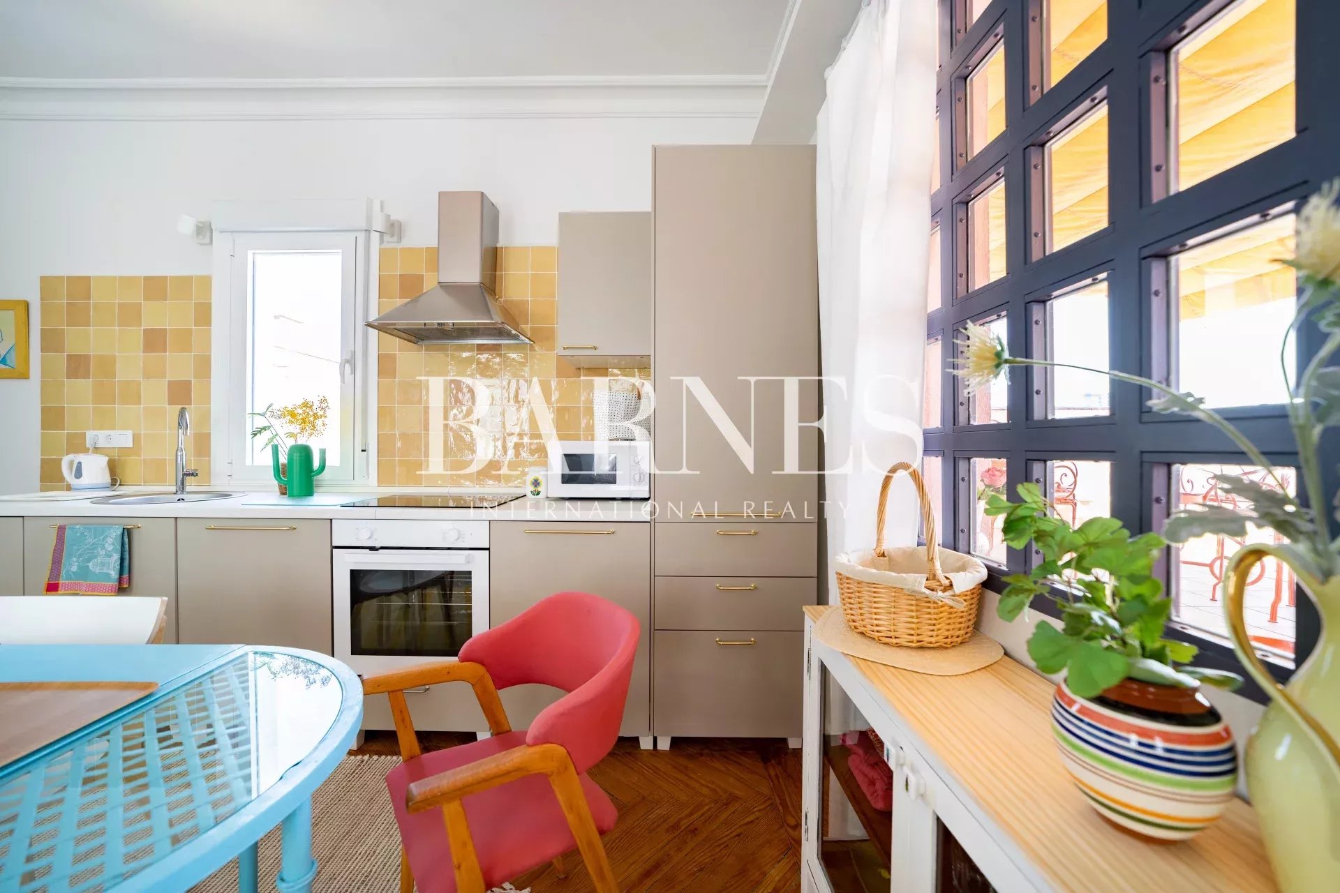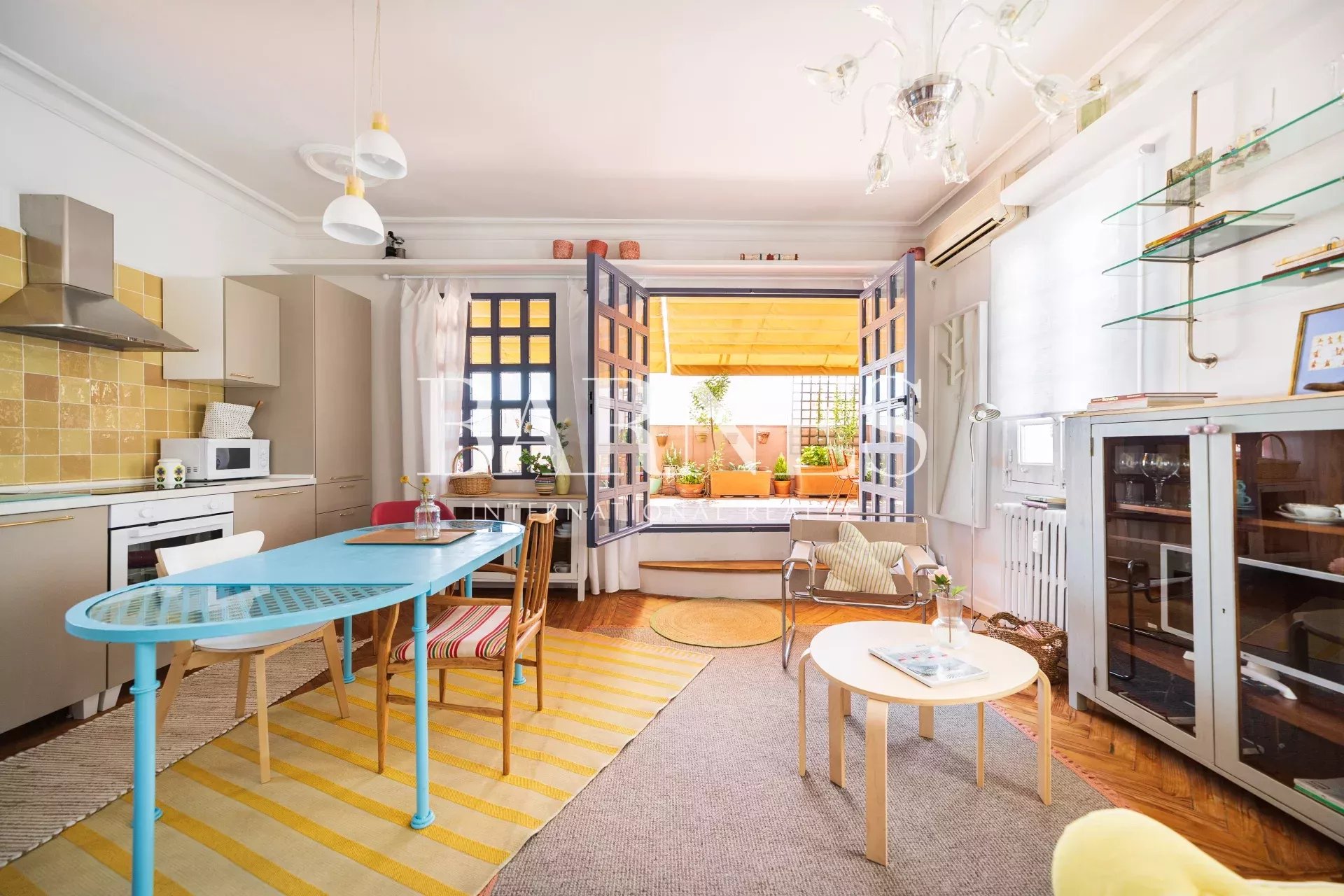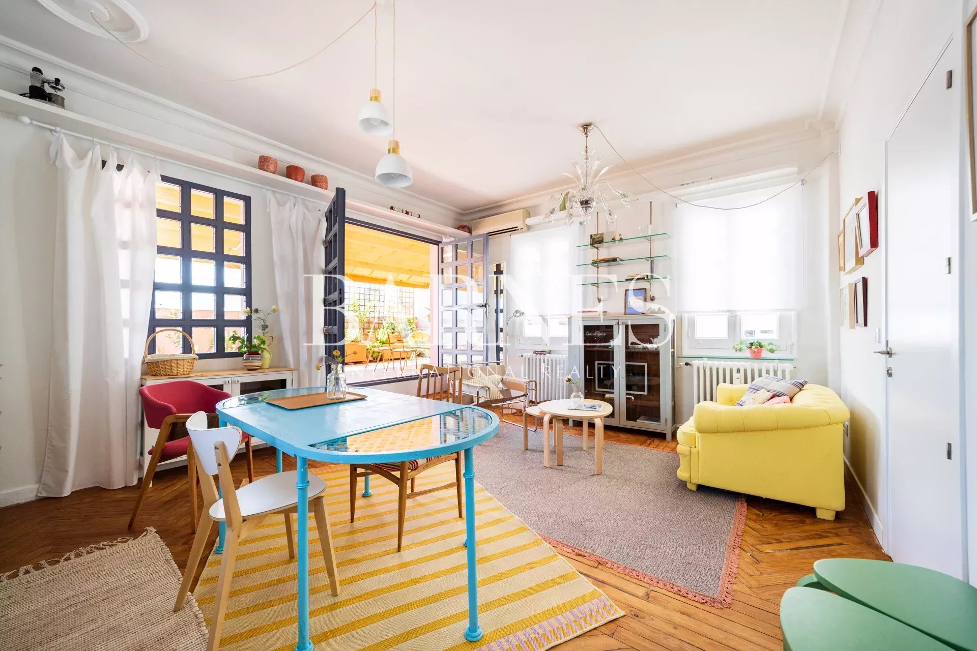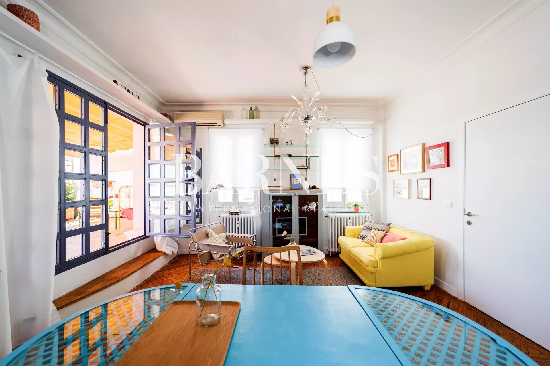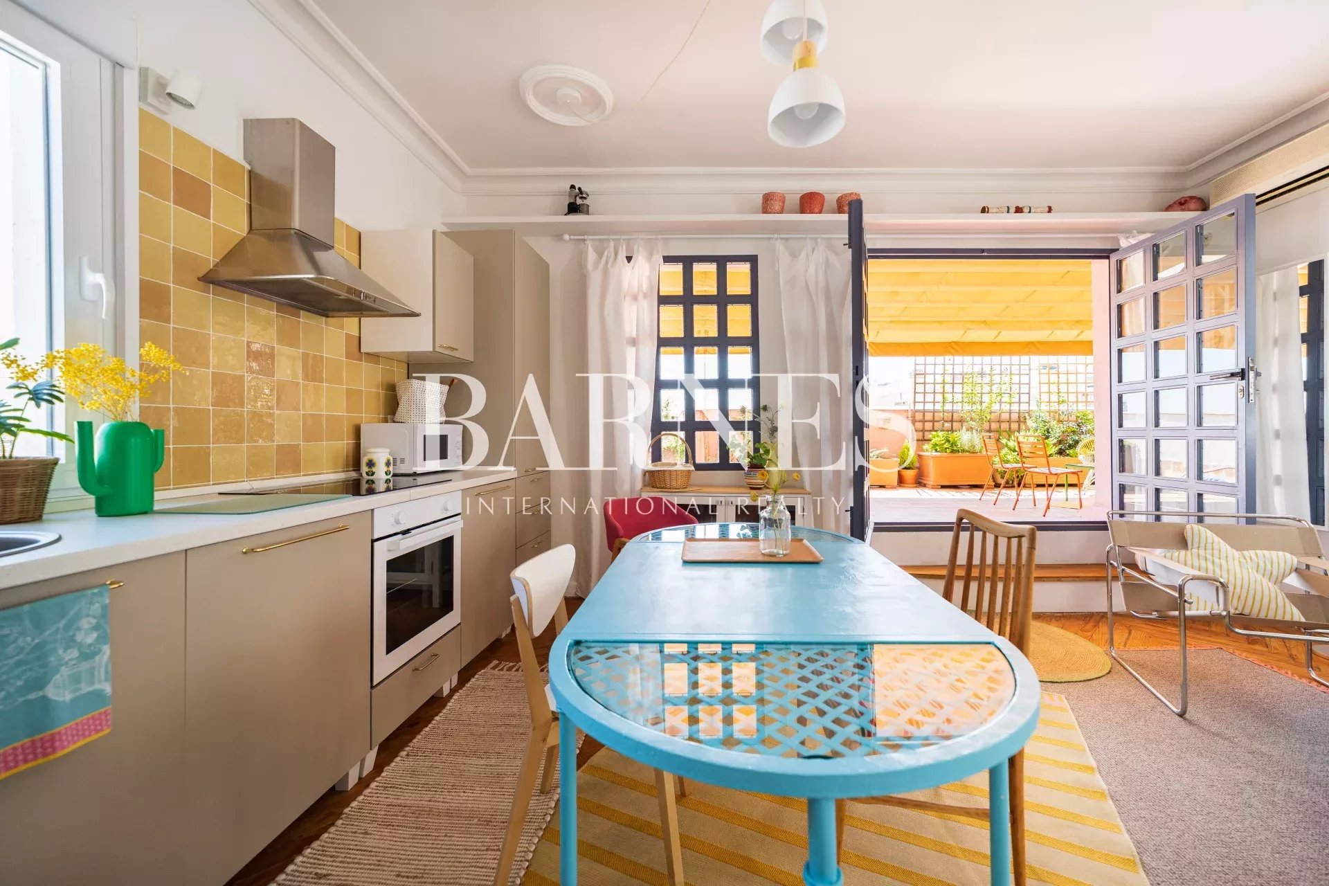 The living room / kitchen / dining area exudes a cozy and comfortable "cozy" style, eclectic with colorful and original furniture. If necessary, the sofa can be converted into a bed. With windows on three of its four walls and the terrace as an extension of the interior, it's ideal for relaxing, reading, gathering, or chatting... The interconnected spaces create a pleasant sense of spaciousness, intimacy, and connection.