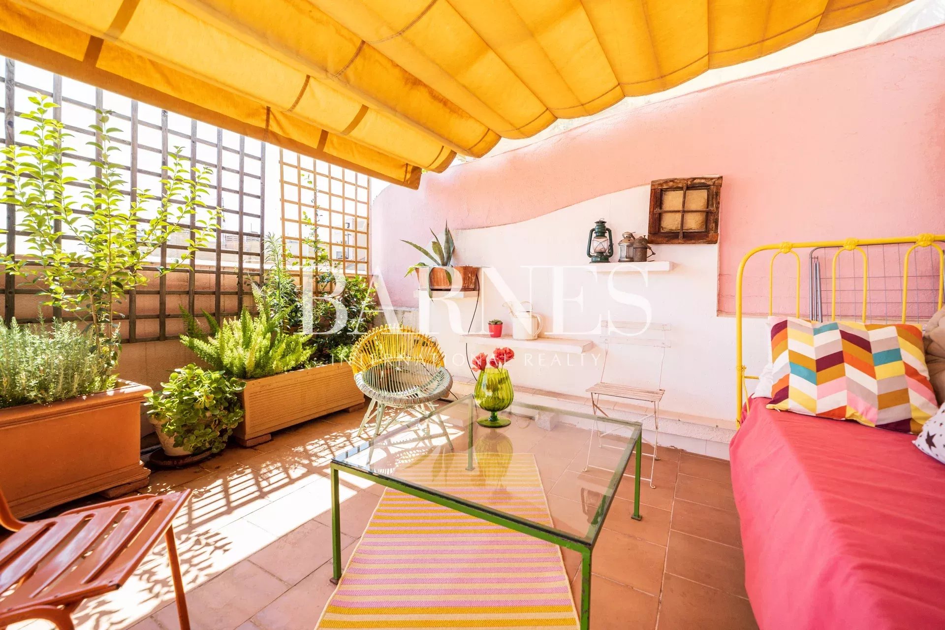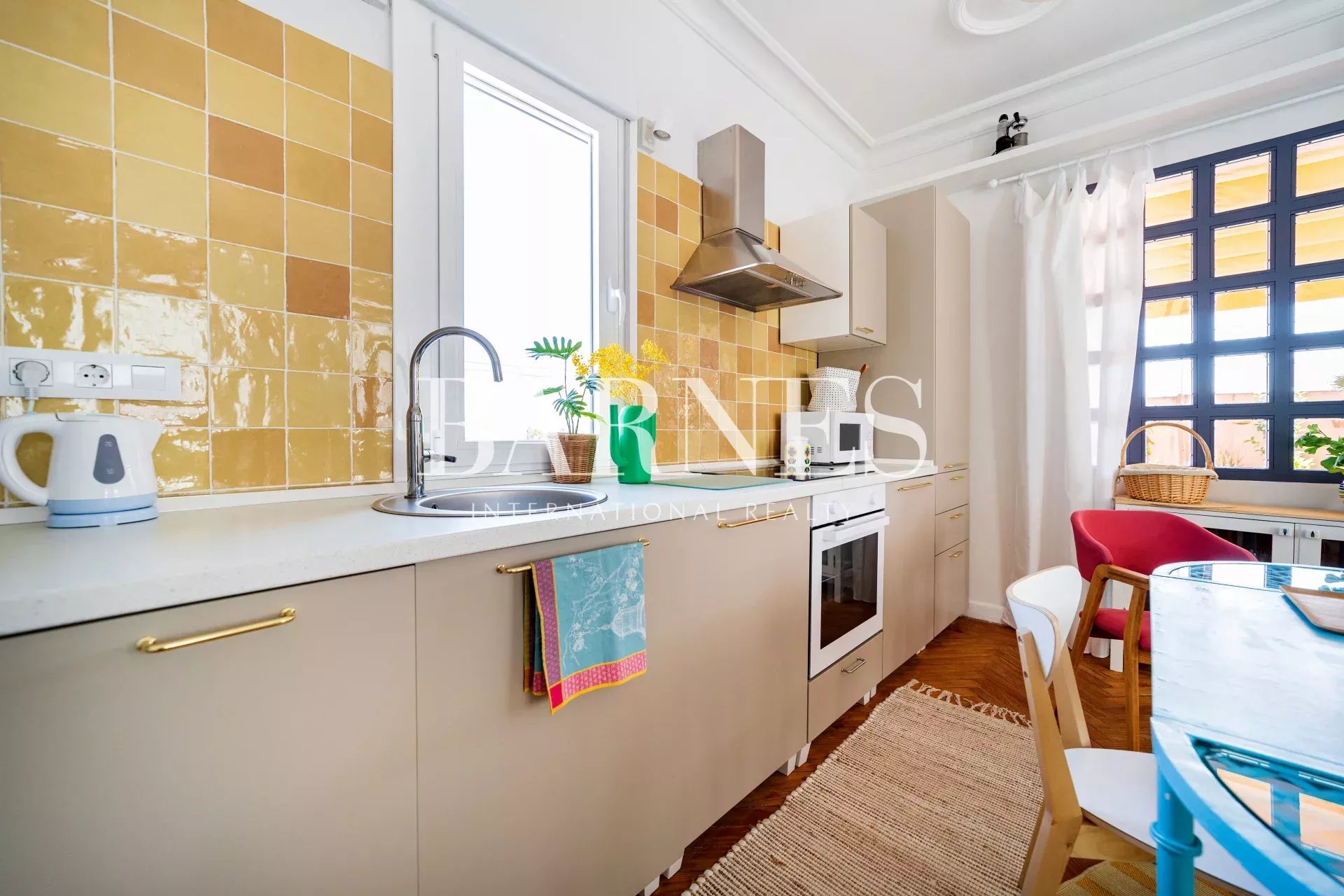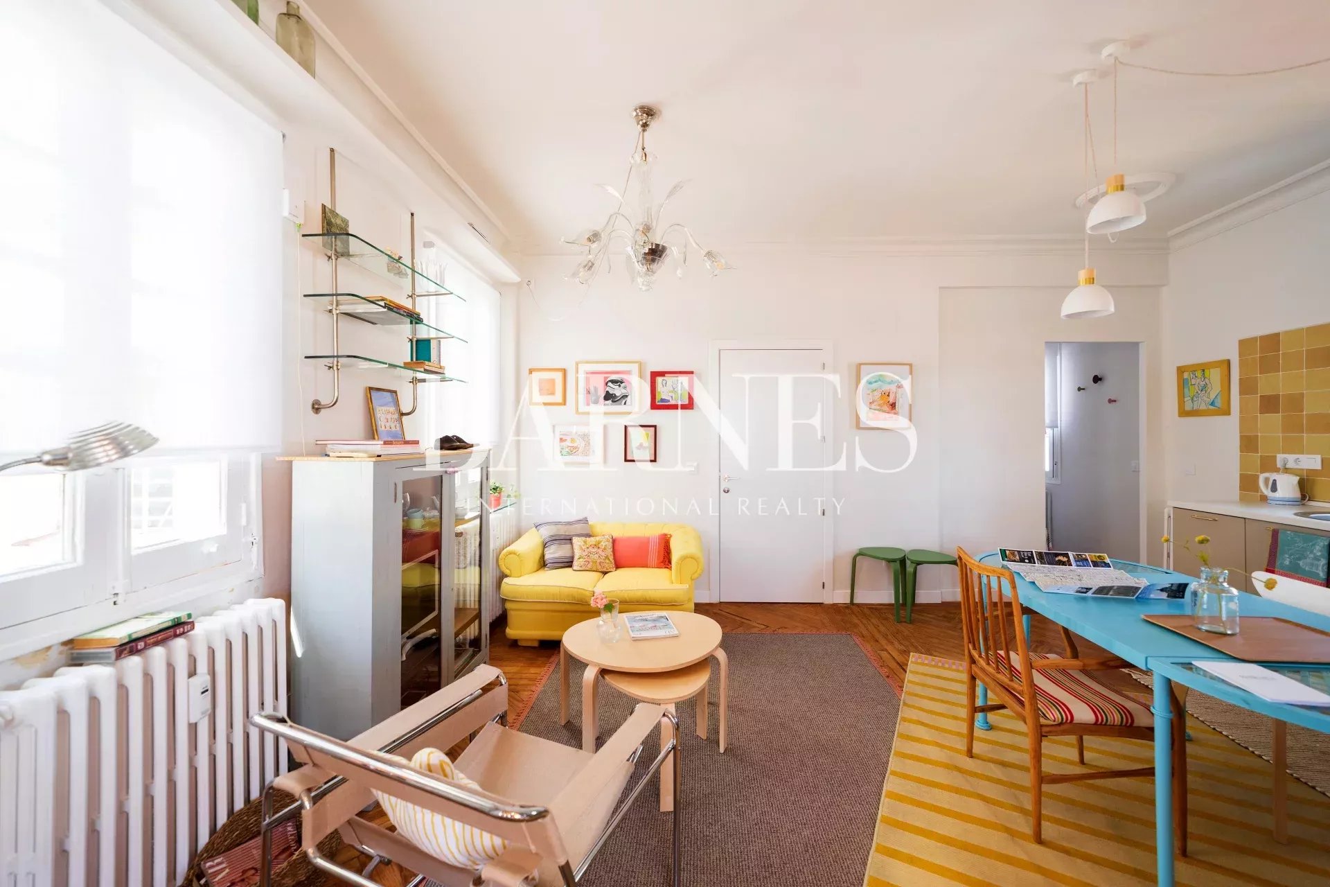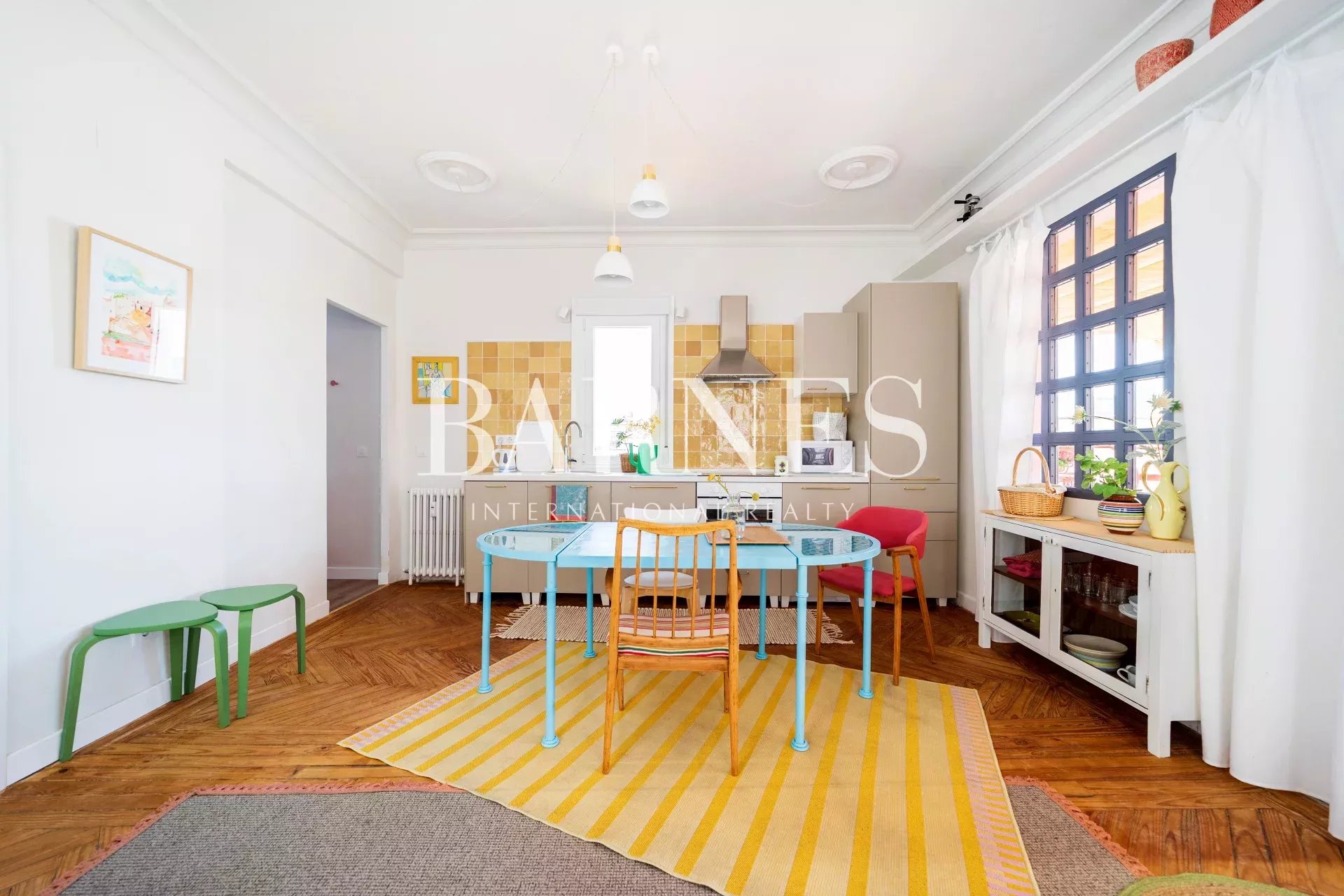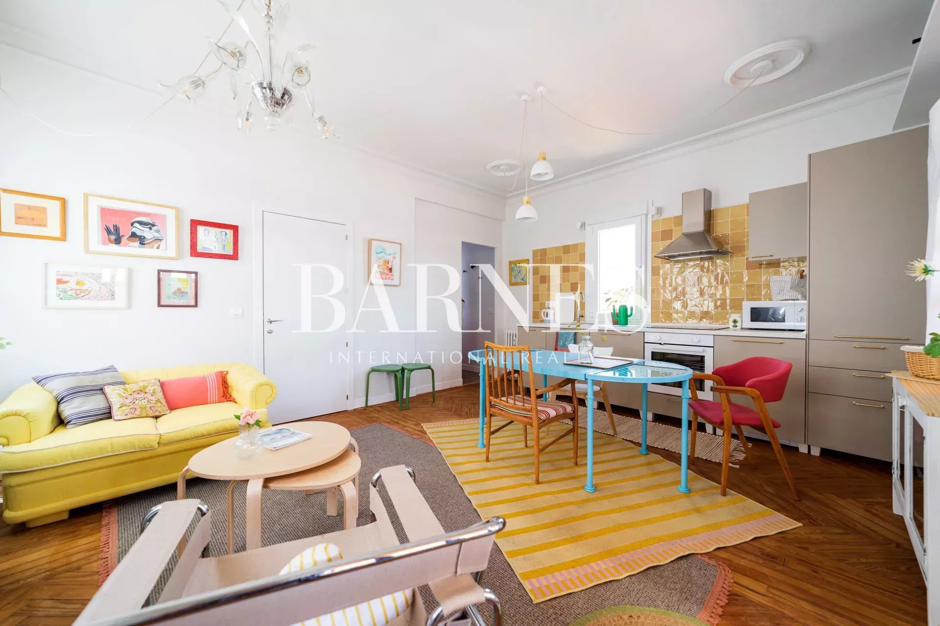 The living room / kitchen / dining area exudes a cozy and comfortable "cozy" style, eclectic with colorful and original furniture. If necessary, the sofa can be converted into a bed. With windows on three of its four walls and the terrace as an extension of the interior, it's ideal for relaxing, reading, gathering, or chatting... The interconnected spaces create a pleasant sense of spaciousness, intimacy, and connection.