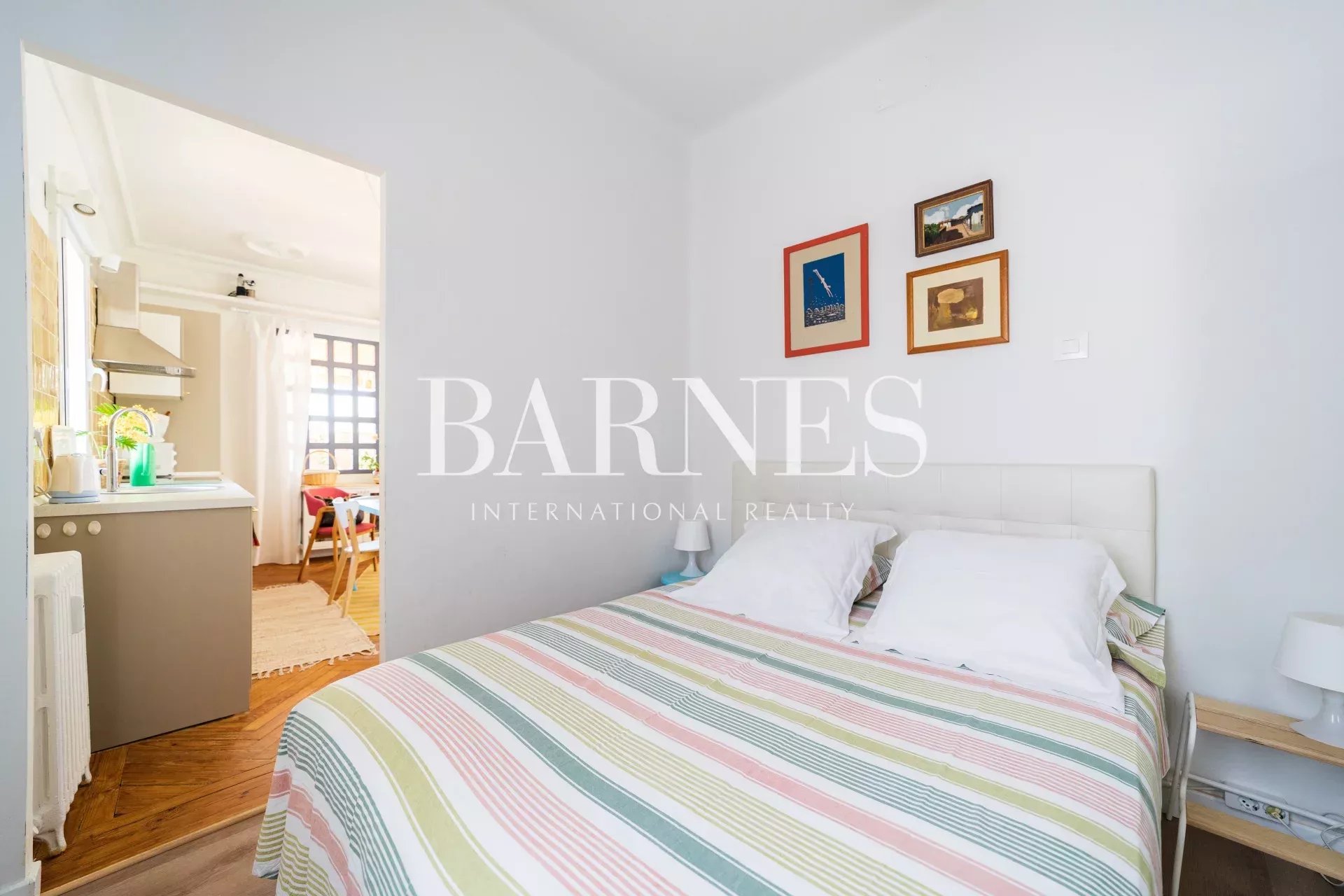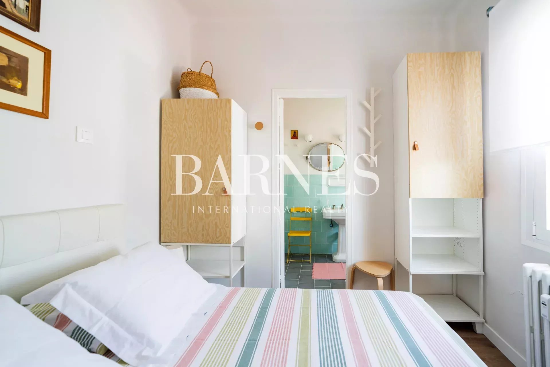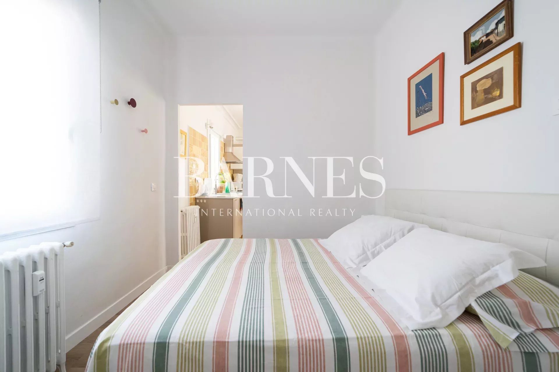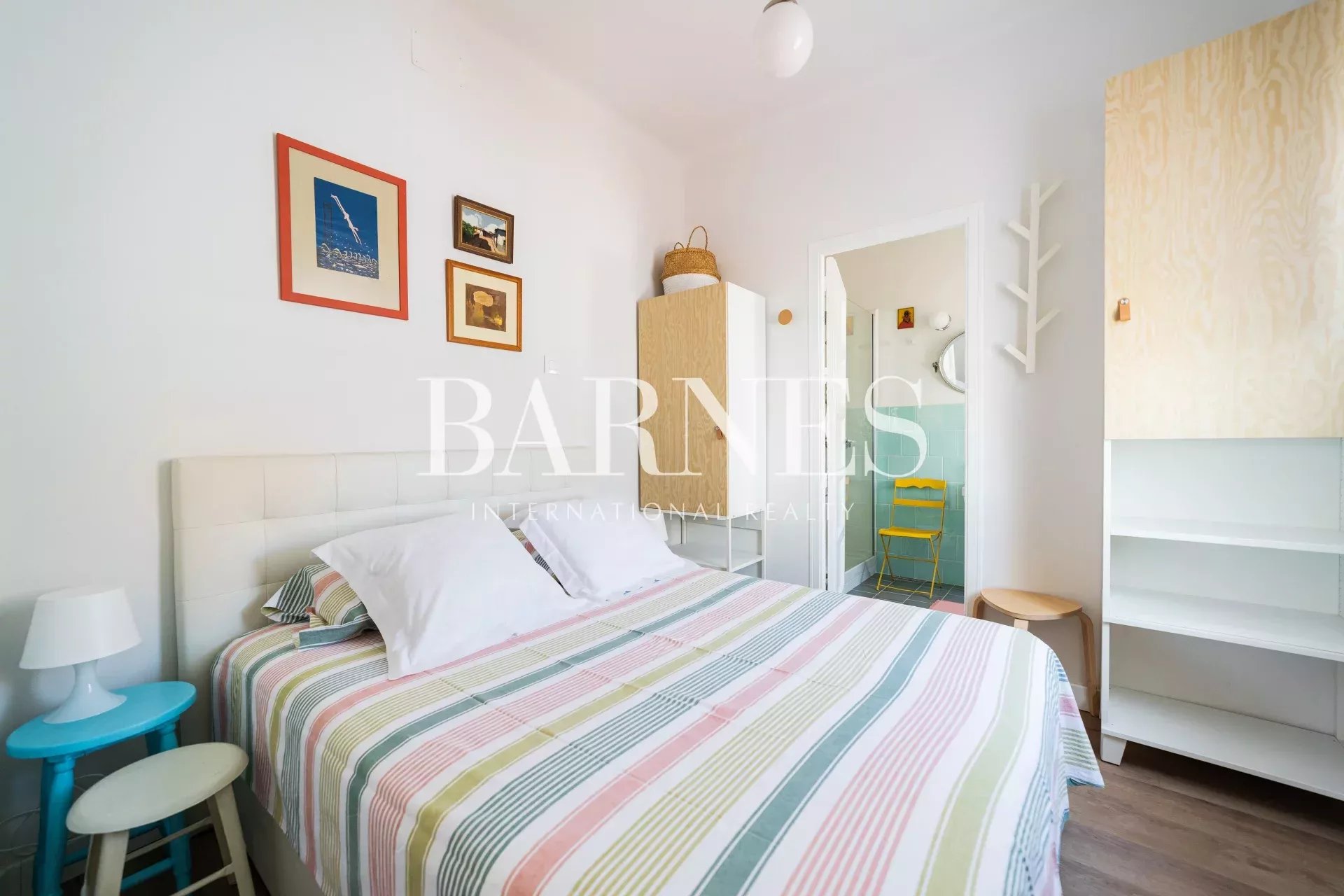 The bedroom, accessed through a sliding door from the living room, is very cozy, with a very comfortable queen-size bed (1.50m) with storage under the mattress, a wall dedicated to storage with a wardrobe and hanger... It connects to a bright bathroom with a practical and modern shower (1.40m), recently renovated.