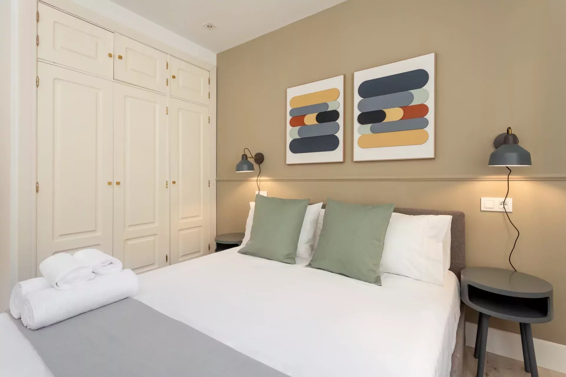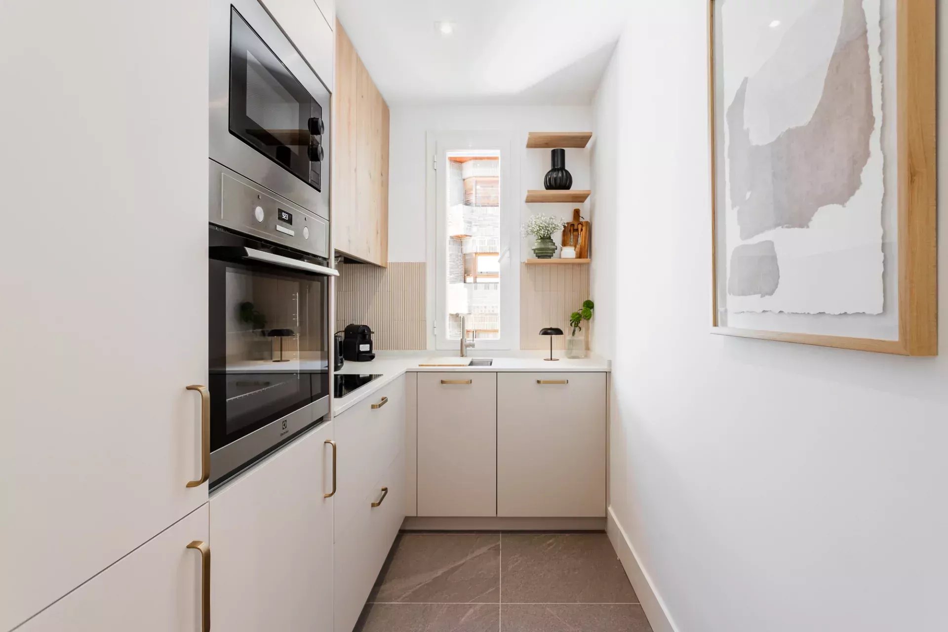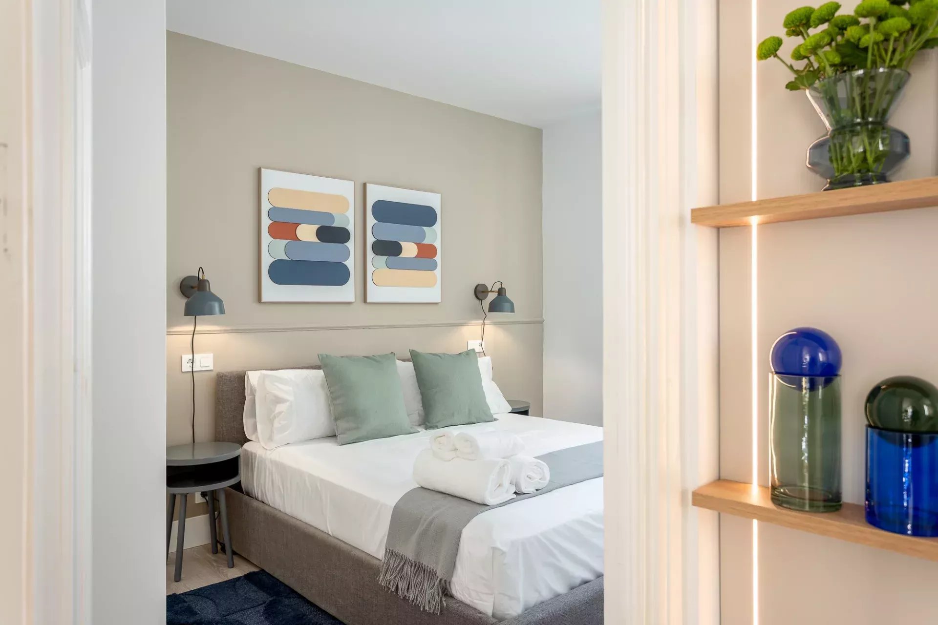 With a carefully planned layout and bespoke interior design, the apartment is fully furnished with high-end pieces. It features two spacious bedrooms, both with double beds and built-in wardrobes, a full bathroom with a shower, and an open-plan kitchen fully equipped with appliances, kitchenware, bed linen, and towels — ensuring a comfortable and sophisticated stay.