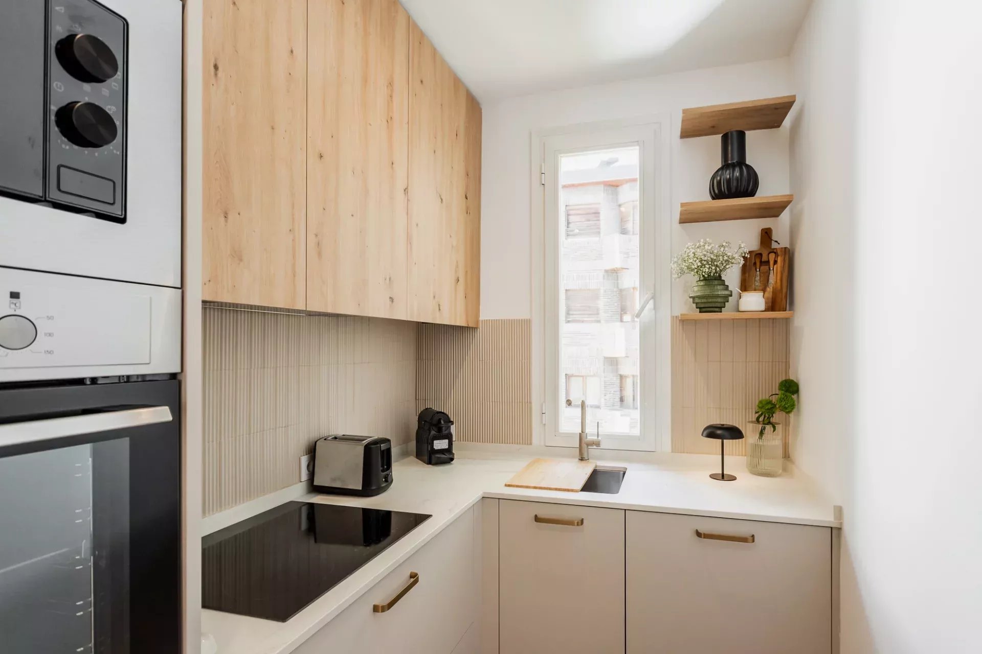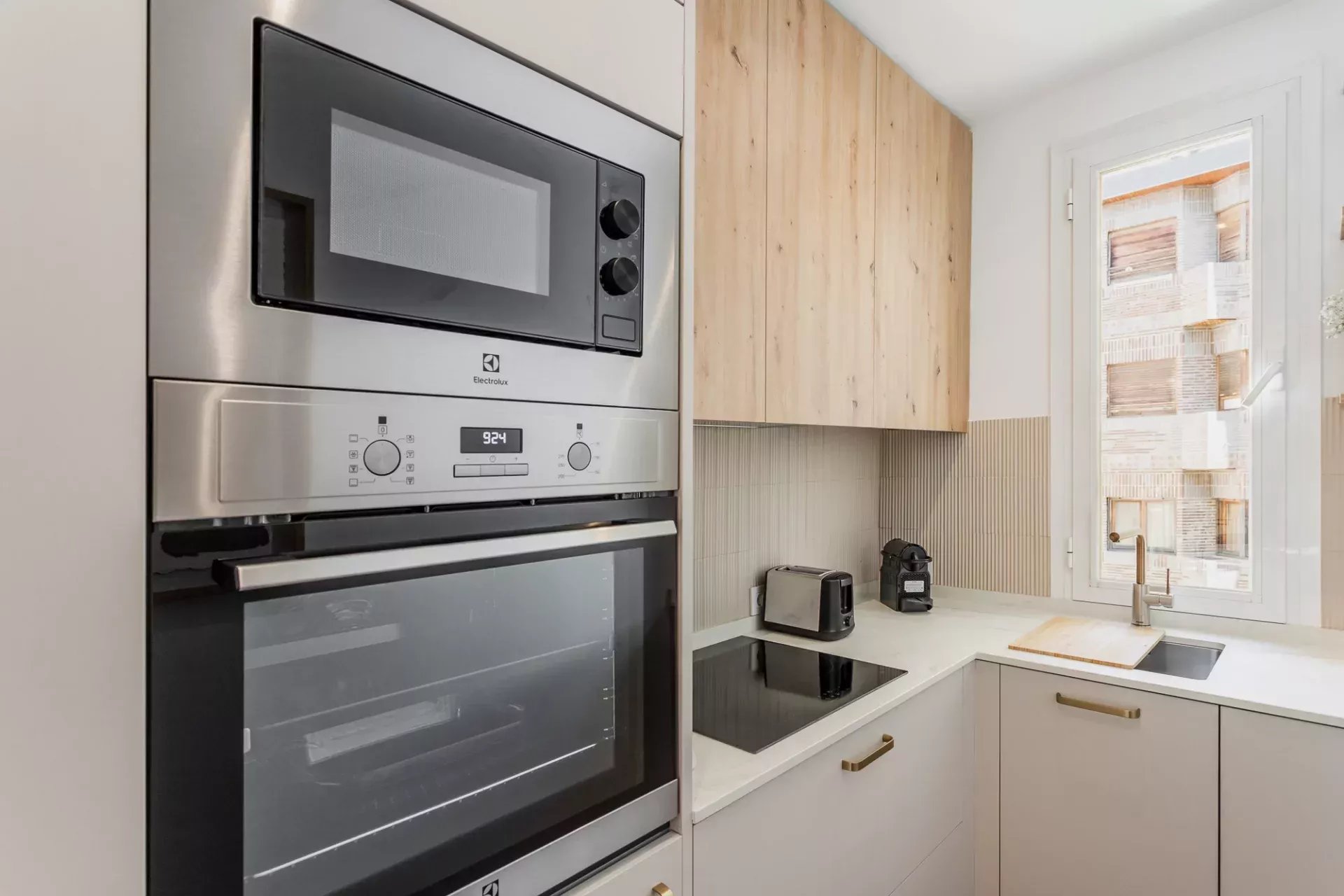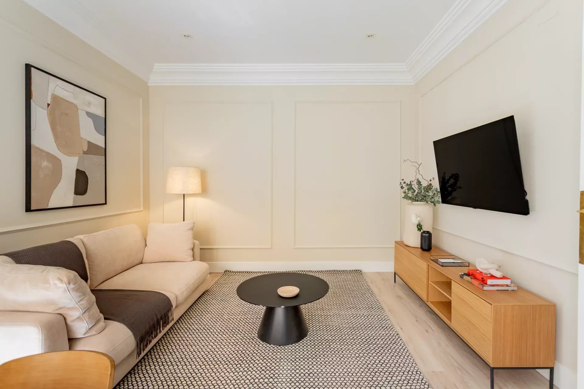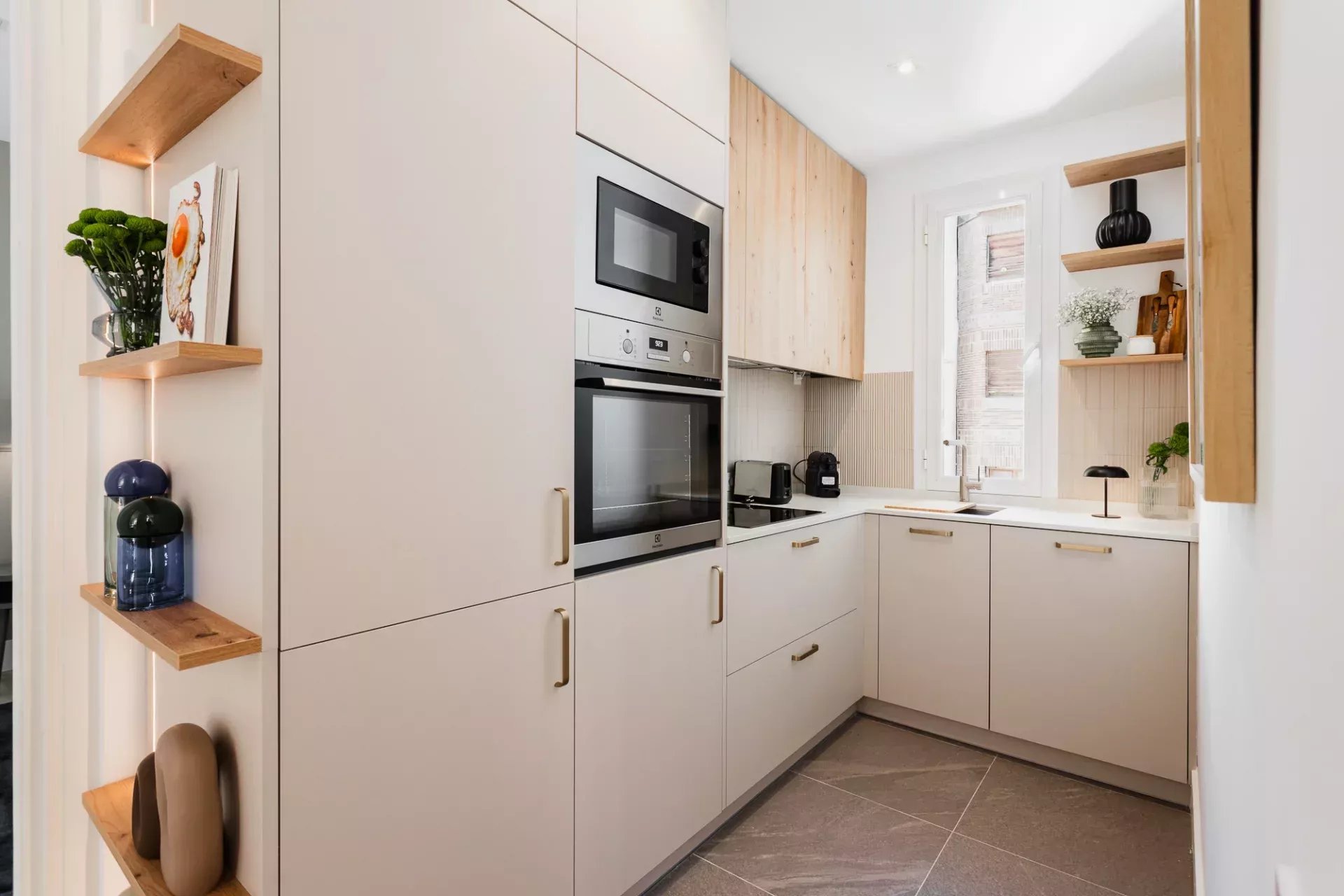 With a carefully planned layout and bespoke interior design, the apartment is fully furnished with high-end pieces. It features two spacious bedrooms, both with double beds and built-in wardrobes, a full bathroom with a shower, and an open-plan kitchen fully equipped with appliances, kitchenware, bed linen, and towels — ensuring a comfortable and sophisticated stay.