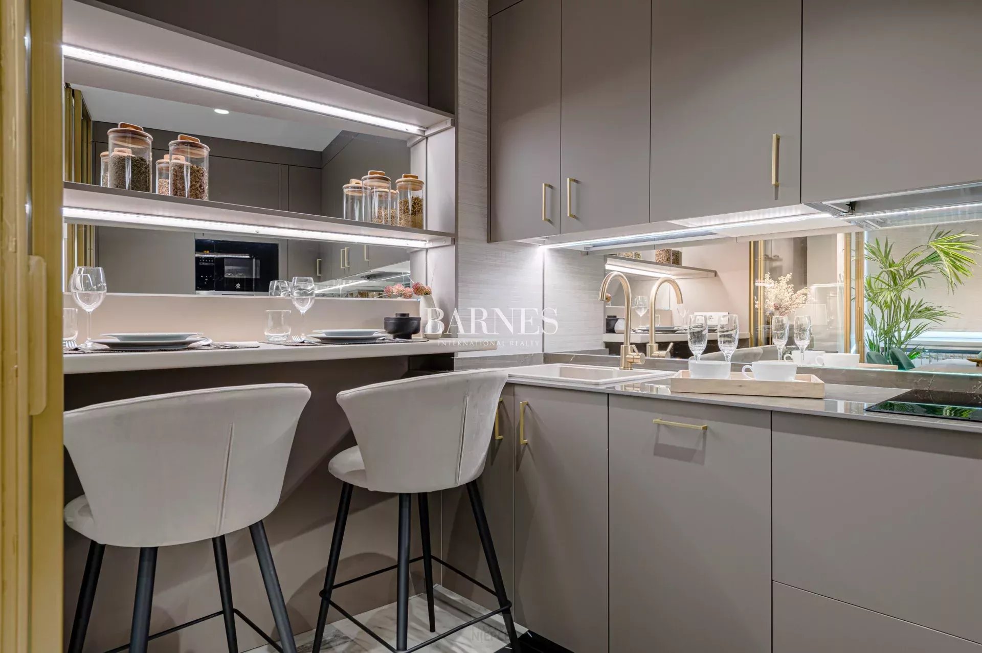 Modern open kitchen, fully equipped with integrated appliances, breakfast bar, and complete kitchenware.