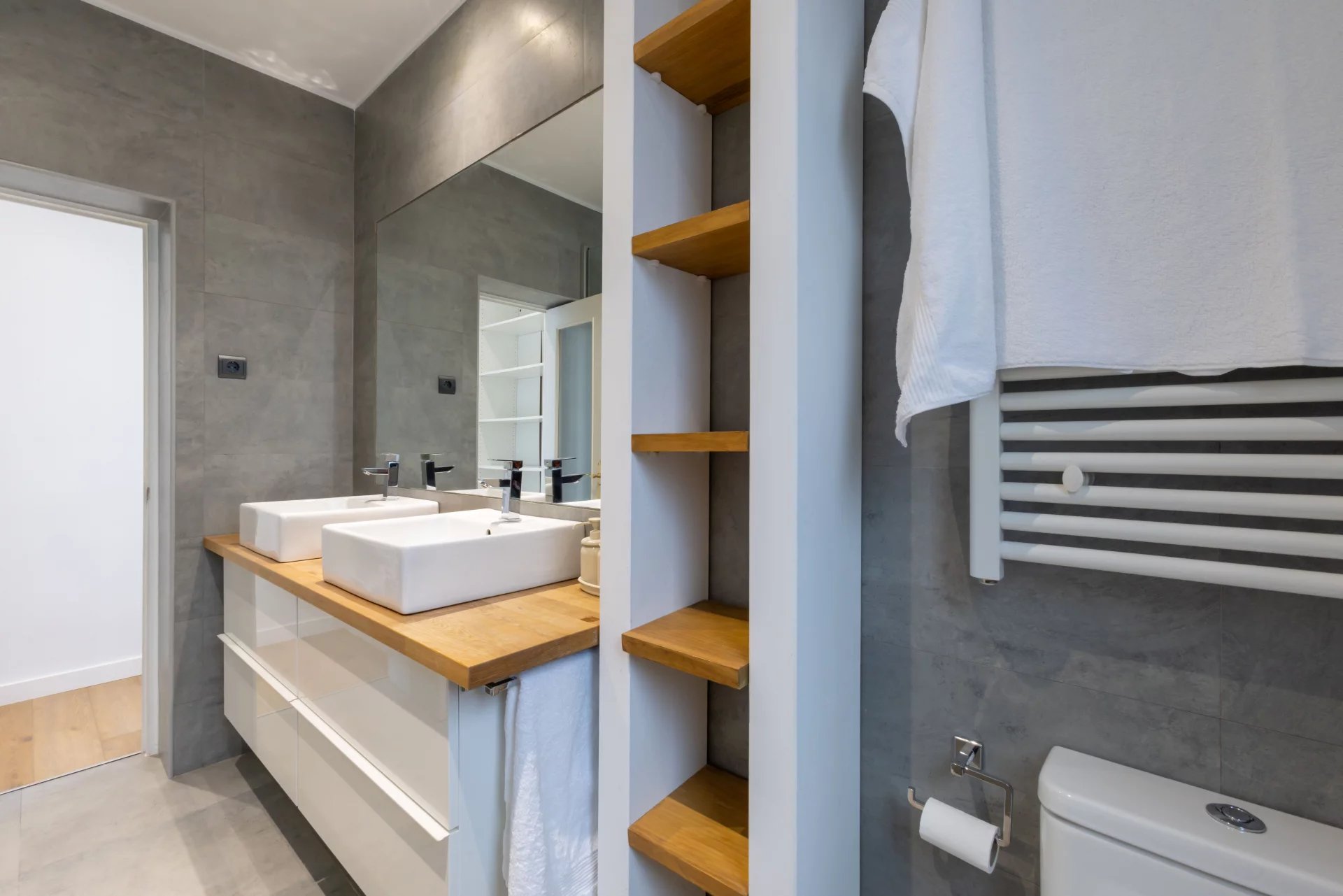 Both bedrooms, filled with natural light, offer direct access to the terrace, enhancing the sense of spaciousness and connection with the outdoors. The master bedroom features an elegant en-suite bathroom with a bathtub and shower. The second bedroom, equipped with a trundle bed, is practical and functional, offering built-in wardrobes and additional storage space. A second full bathroom with a shower is conveniently located in the hallway.