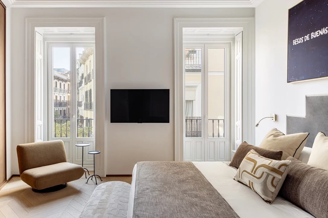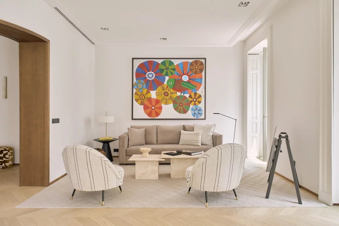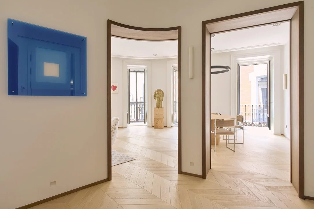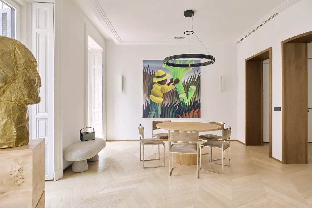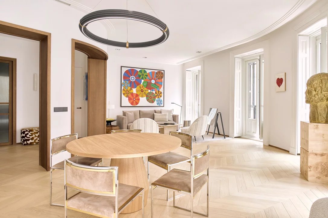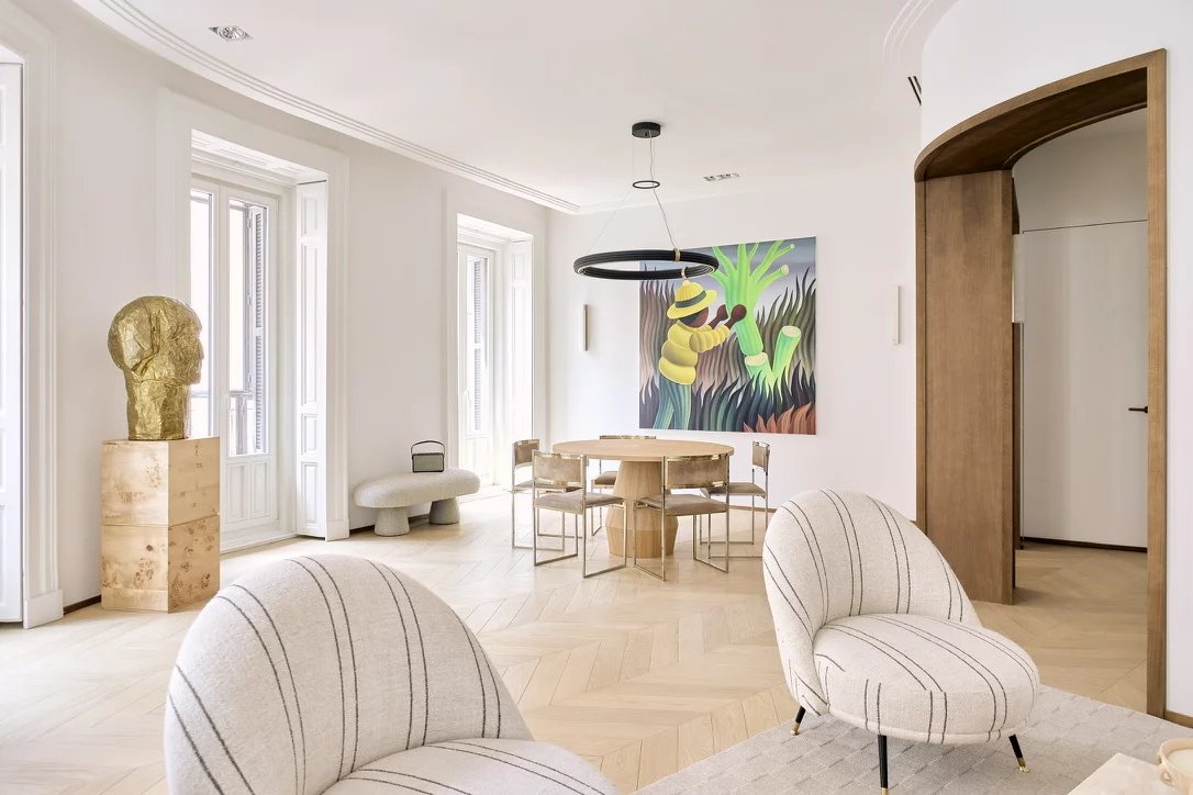 In the heart of the emblematic Cortes district, this exceptional 200 sqm apartment perfectly embodies contemporary luxury within a fully renovated 1905 Madrid-style classical building.