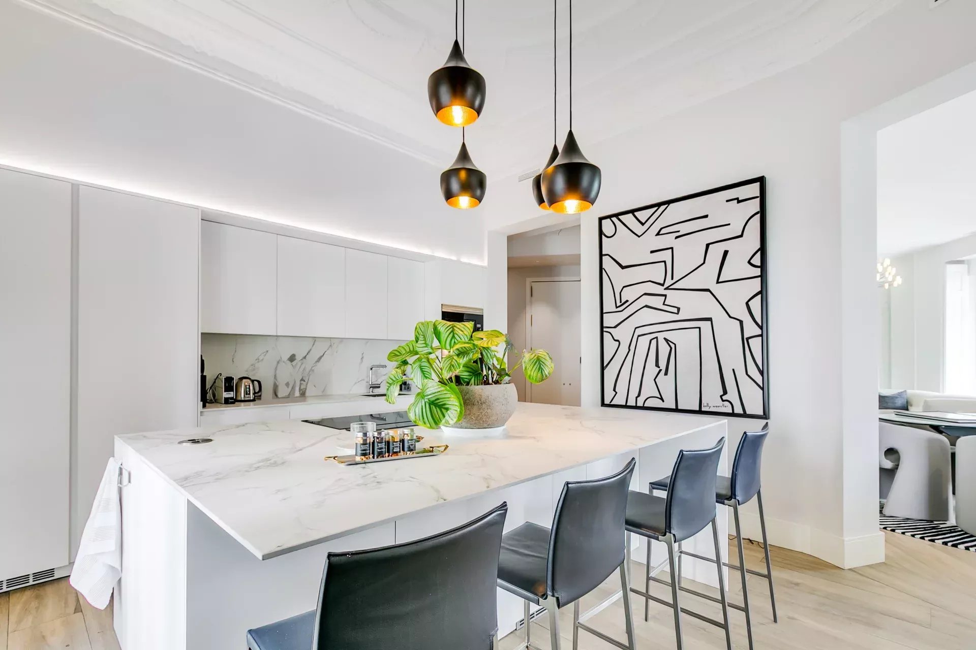From the spacious entrance hall, one is immediately struck by the 3.20-meter-high ceilings adorned with original moldings and indirect lighting that allows for different atmospheres. The living room, facing south, opens onto two balconies, while the dining room is bathed in natural light through the bay window. The kitchen, equipped with top-of-the-line appliances and a large island, blends style and functionality.