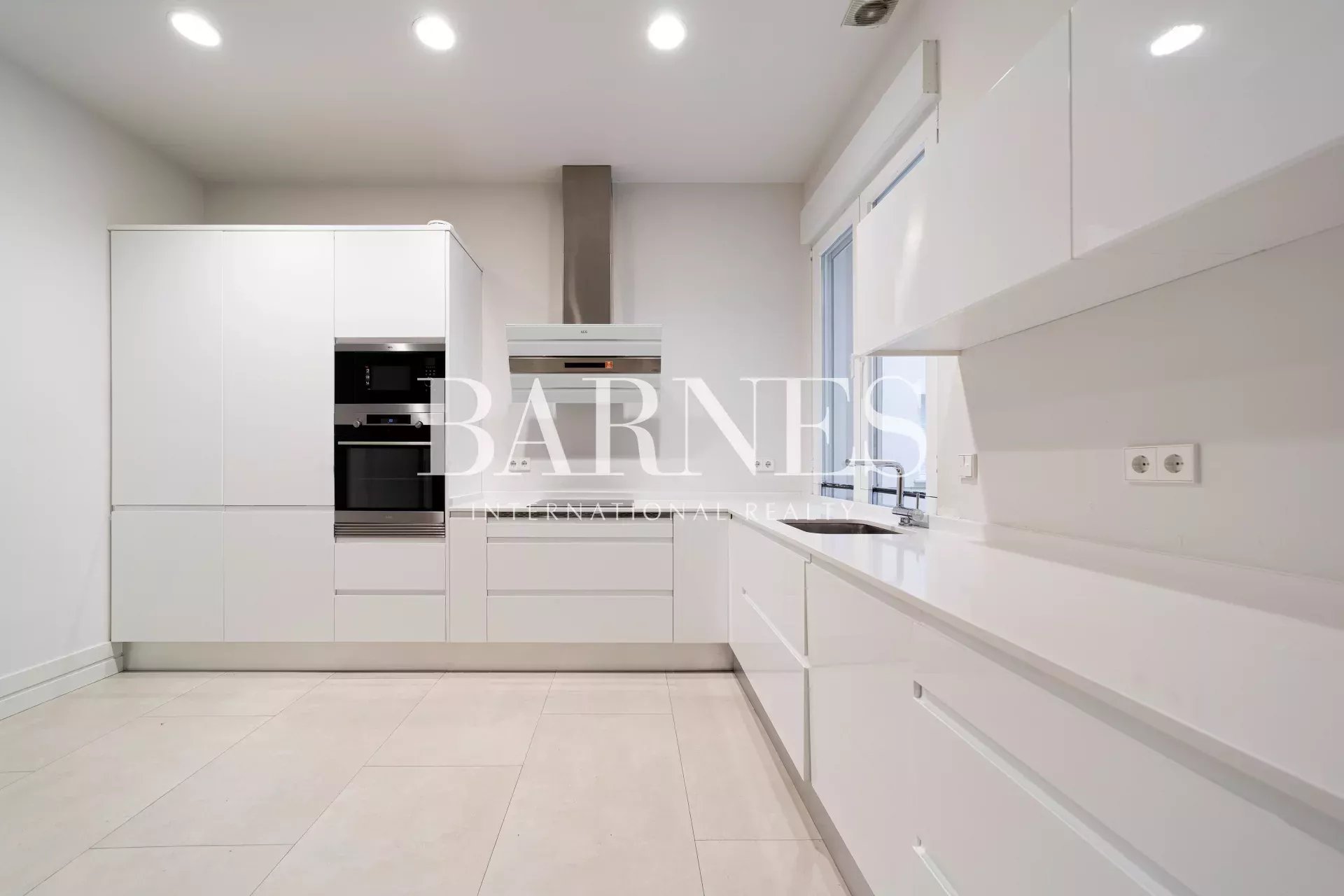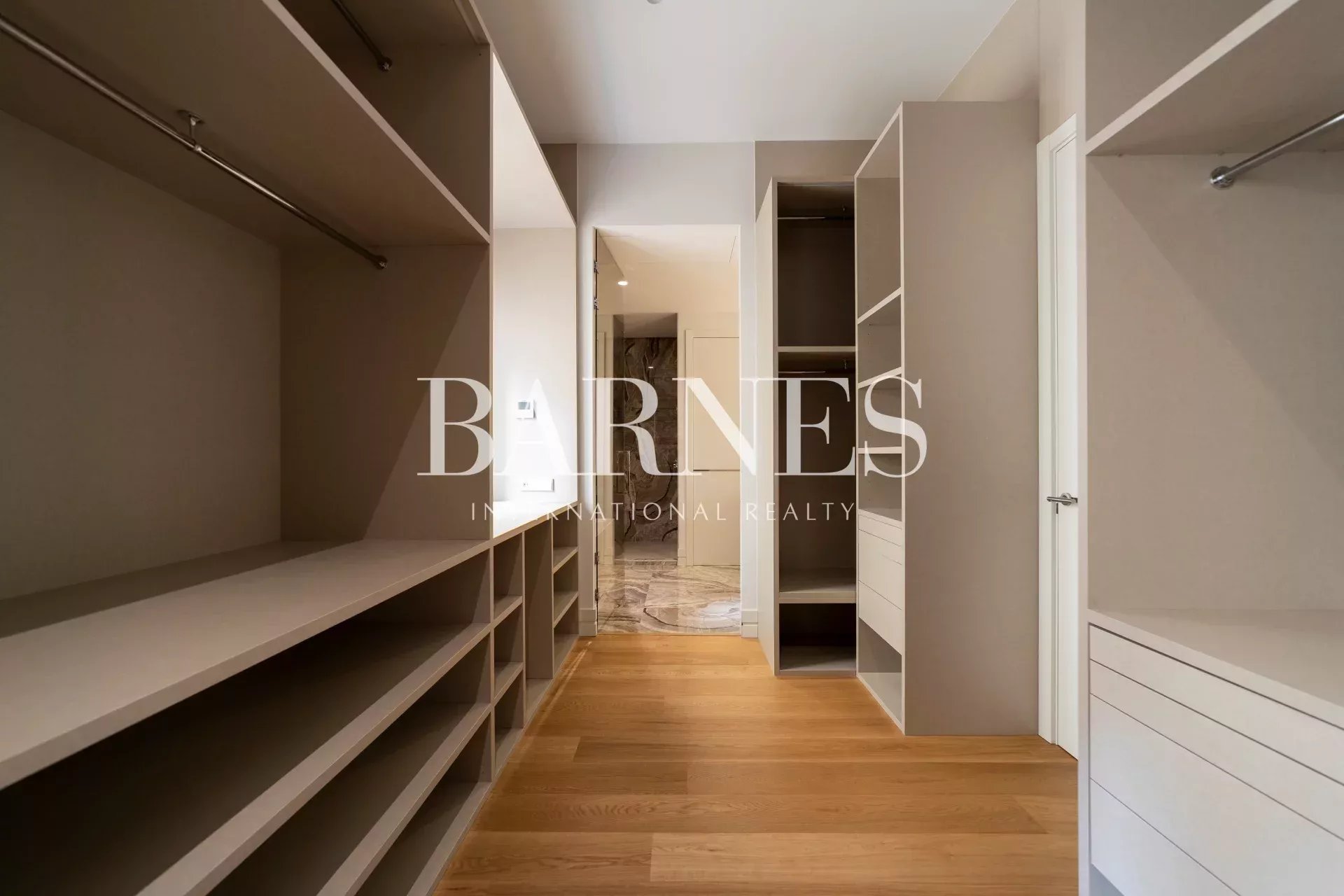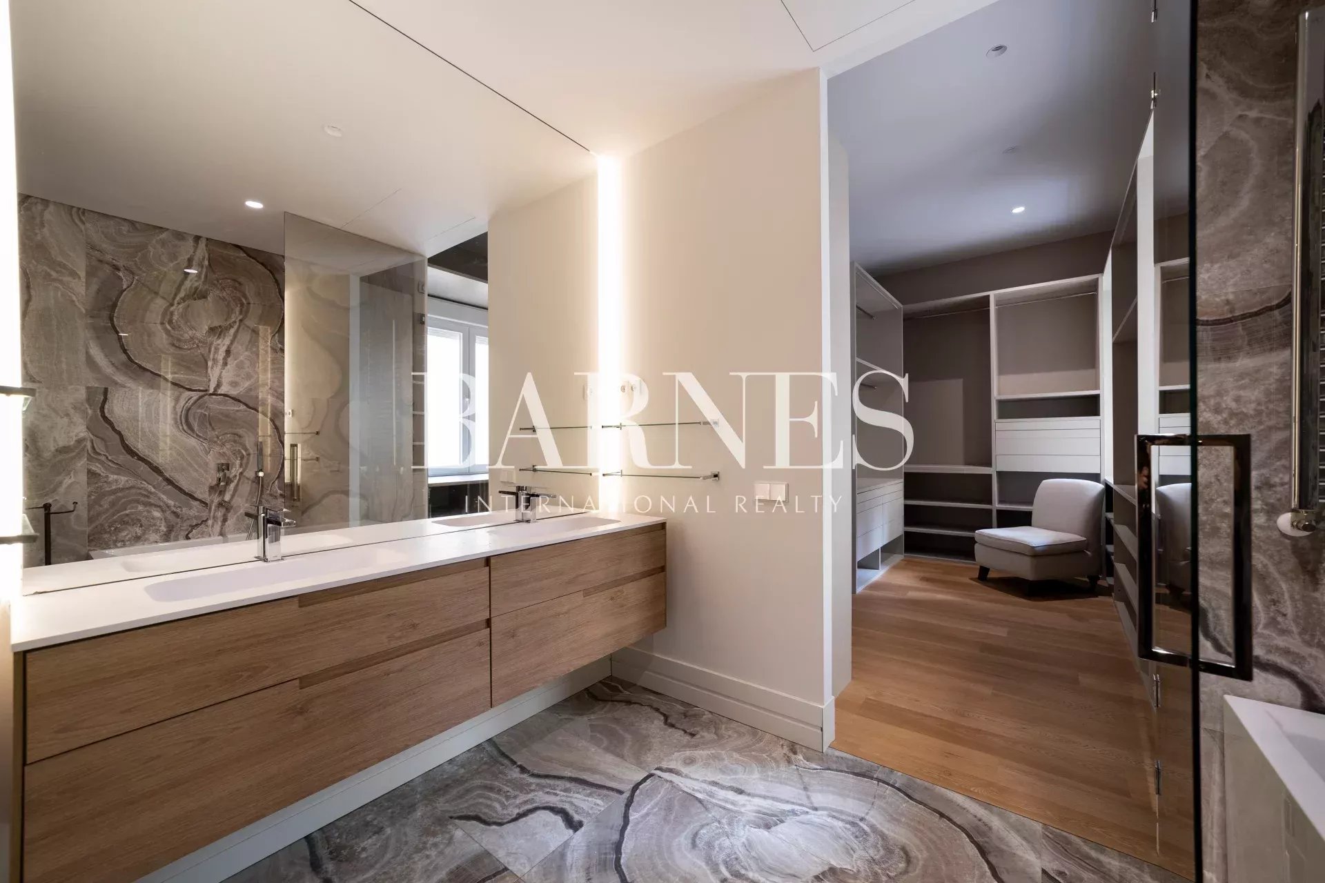 The property features three double bedrooms with en-suite bathrooms, all newly renovated and exquisitely equipped. The master bedroom also boasts a spectacular walk-in closet. The residence includes electric blinds, LED lighting, and top-quality finishes.
