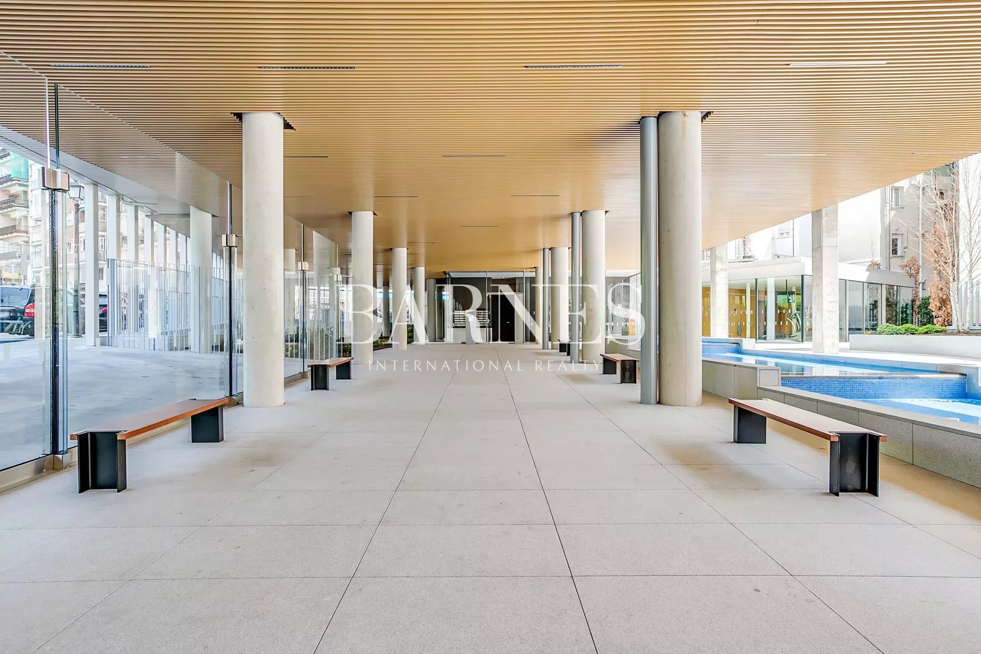 The building redefines urban living with first-class amenities: panoramic rooftop pool with solarium and 360º views, glass-walled gym with Life Fitness equipment, gardens, smart parcel room, bicycle storage, concierge and 24h security.
