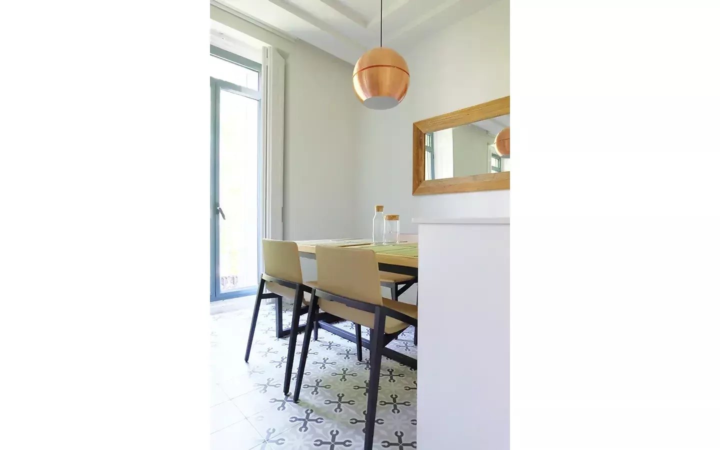 The living room is furnished with a comfortable sofa and a relaxing armchair, while the modern-style kitchen is fully equipped with state-of-the-art appliances. The floors are made of natural oak wood, and the kitchen and bathroom feature distinctive hydraulic tiles with geometric patterns.