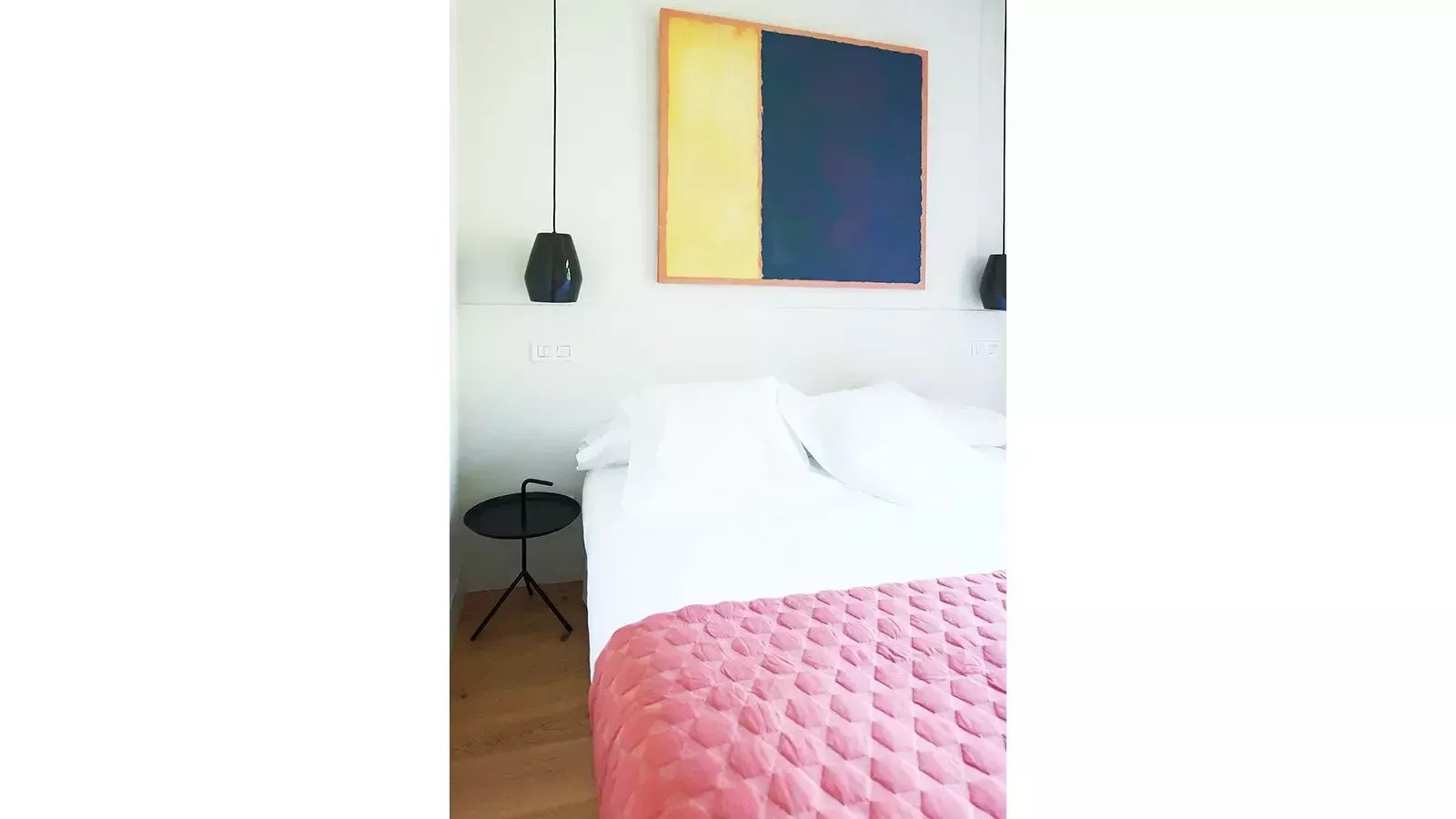 This elegant exterior residence, with three balconies facing the street, features contemporary interior design and is fully furnished and equipped for medium-term stays.