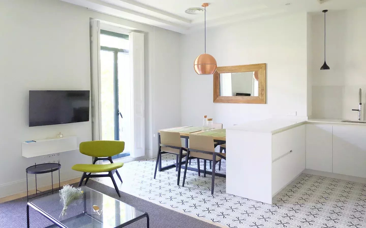 The space includes a living-dining room with an open-plan kitchen, fully equipped with appliances, complete kitchenware, and high-quality finishes. Two balconies facing the street fill the room with natural light, enhancing the warmth of the natural oak floors and contemporary furnishings. A solid wood dining table and a comfortable lounge area complete this open-concept space.