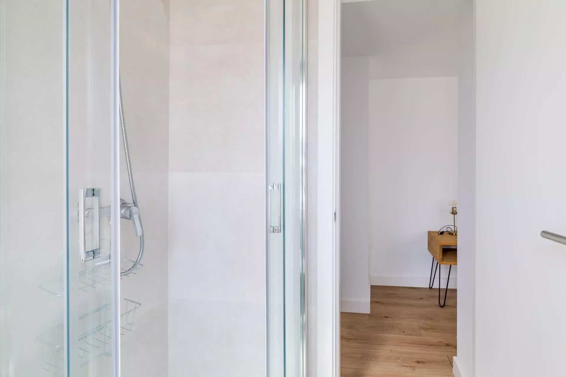 The apartment features a guest toilet and a spacious master suite with an en-suite bathroom and a comfortable study area, ideal for those working from home. The bathroom, with a modern design, has quality finishes that enhance the comfort and elegance of the space.