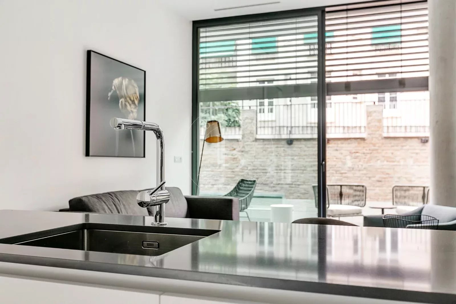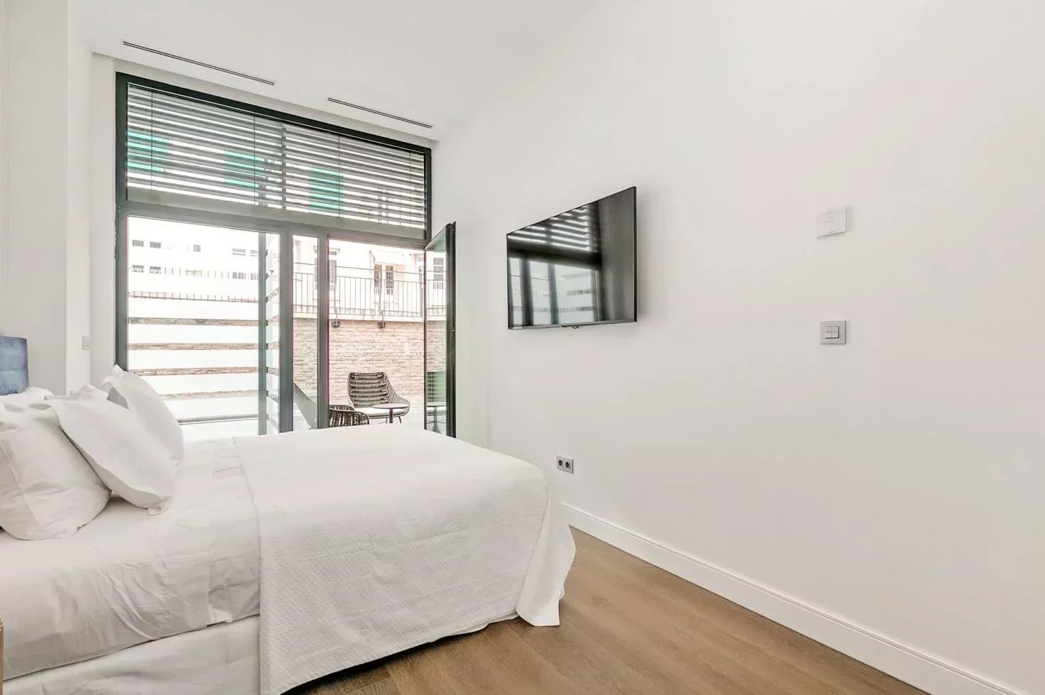 The bright living-dining room opens onto a spacious furnished private terrace, perfect for enjoying the outdoors with total privacy. It also includes a sofa bed, adding versatility for guests without compromising style or comfort.