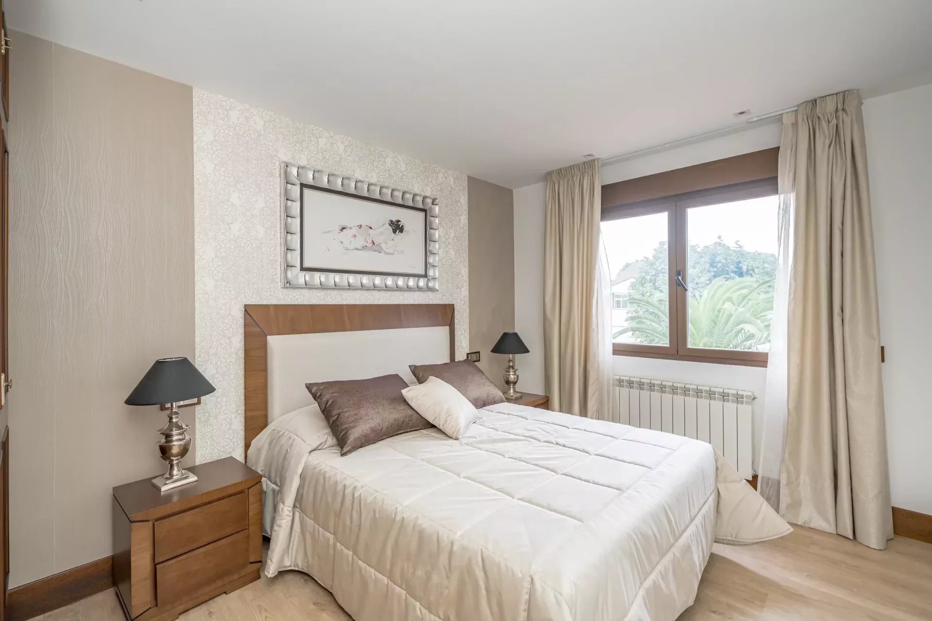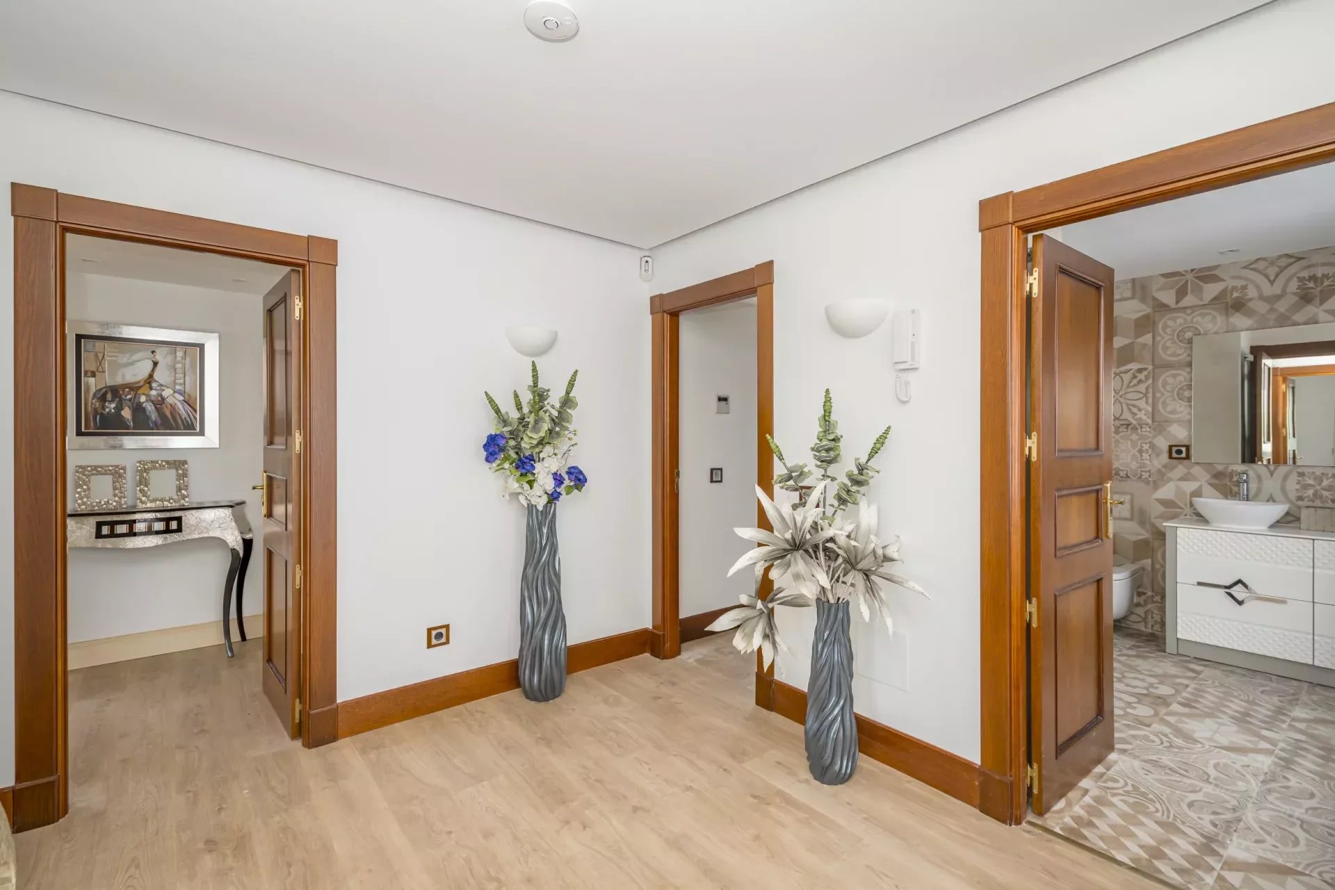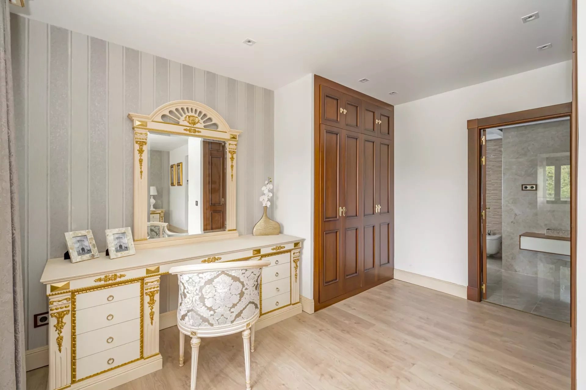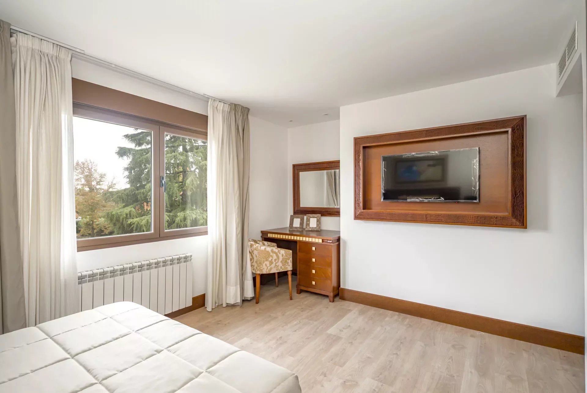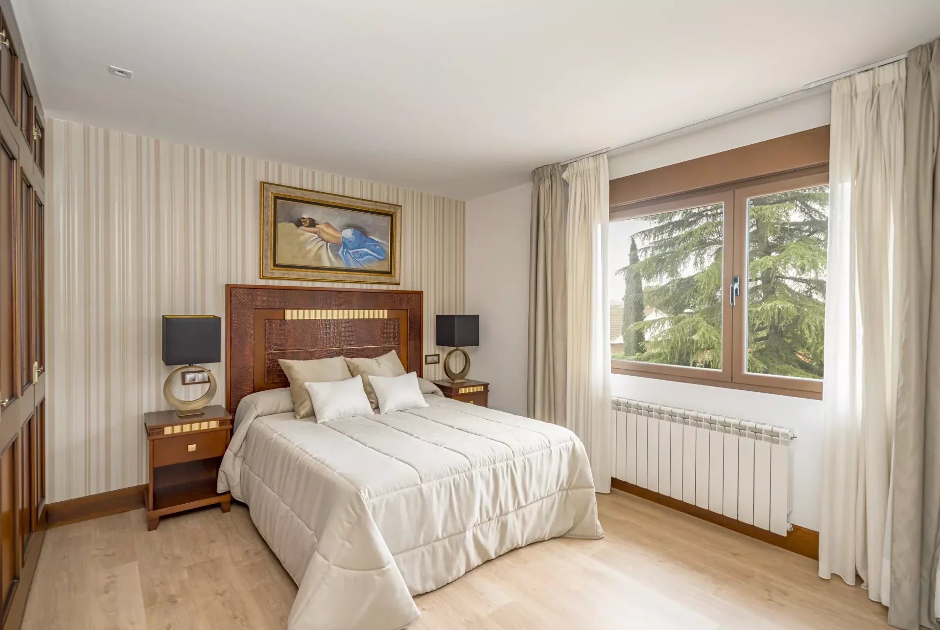 On the upper floor, going up the stairs, bright thanks to its large windows, we find a hall that distributes 3 bedrooms. The master bedroom, with dressing room, vanity area and bathroom with jacuzzi bath, as well as double washbasin and a shower tray.