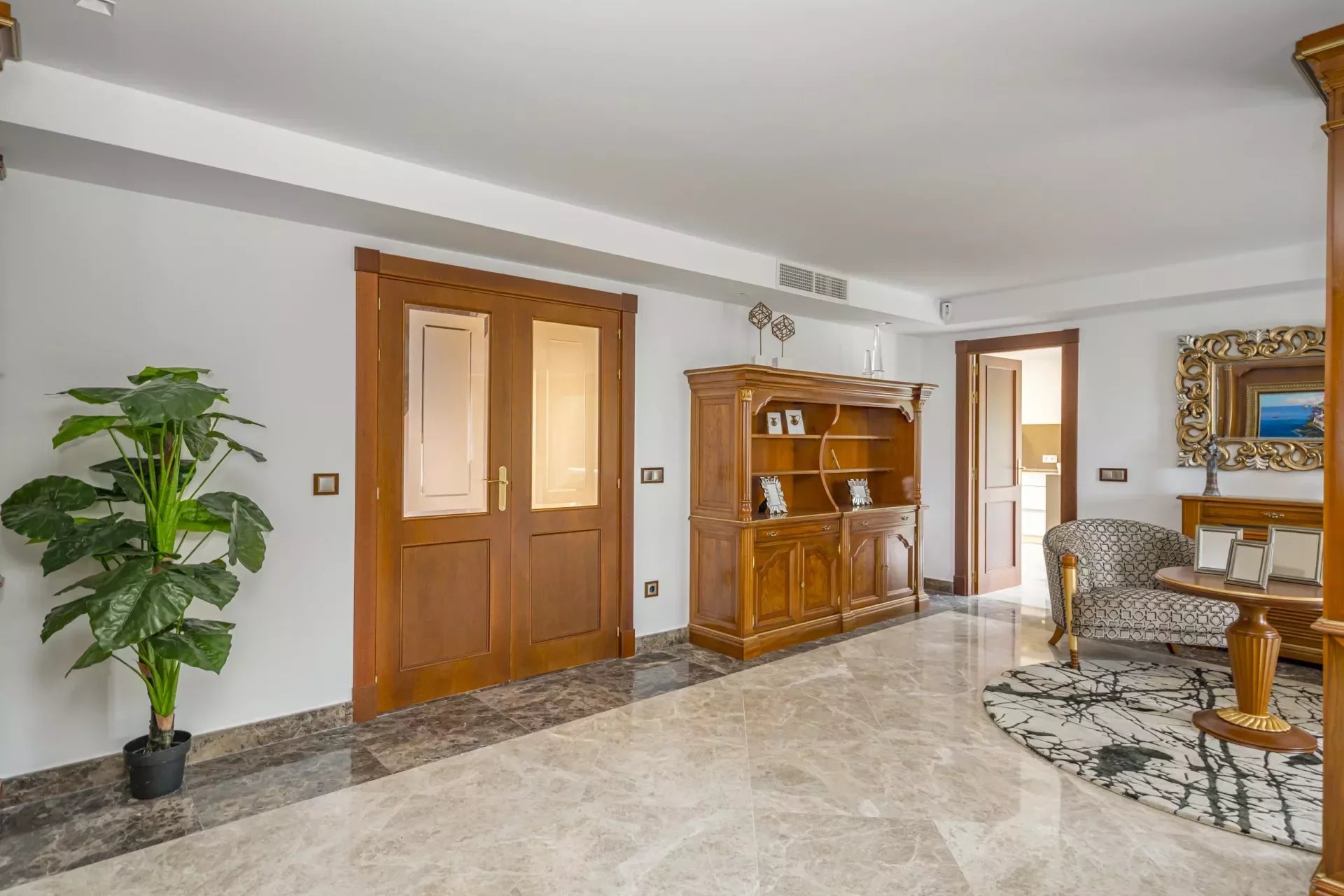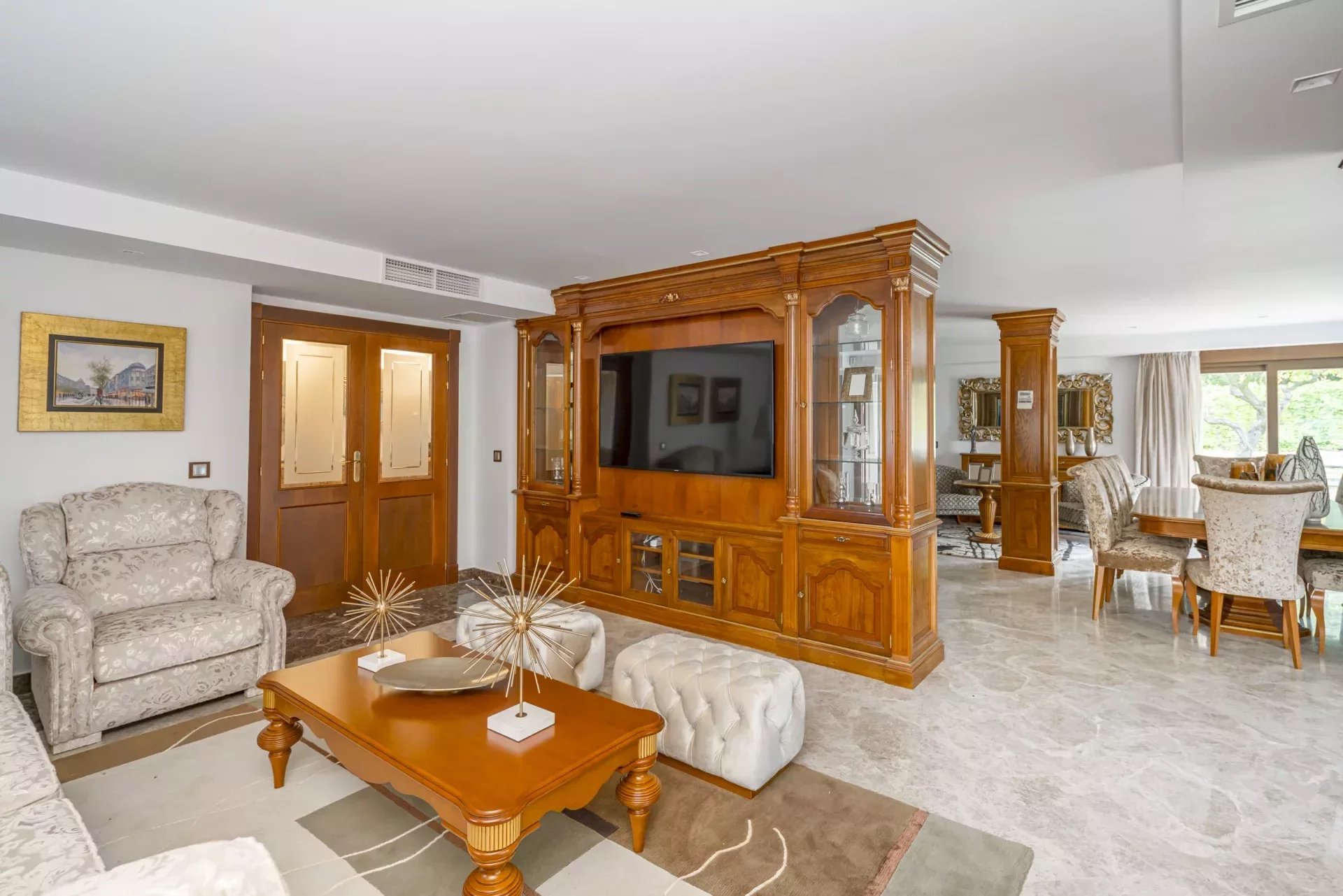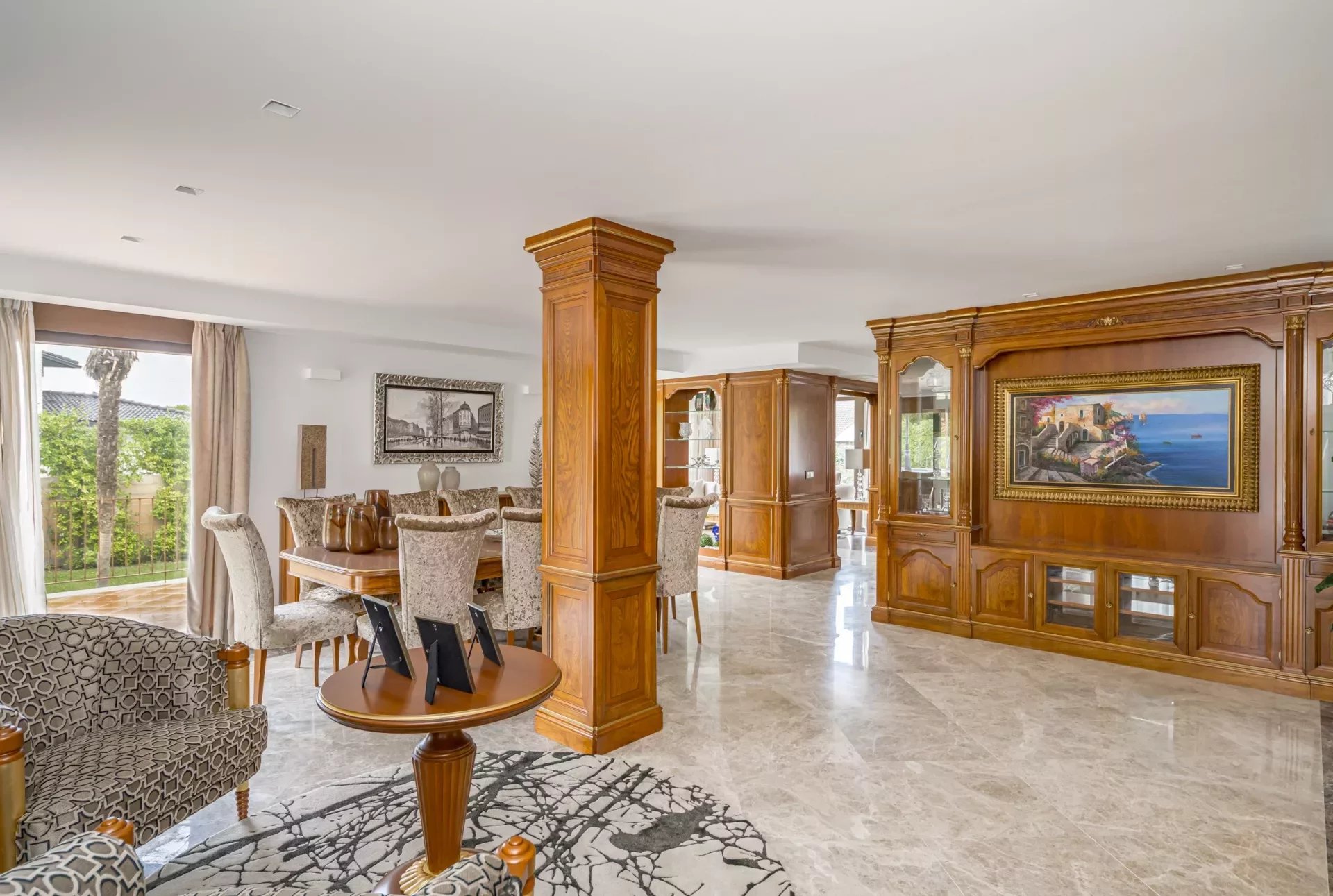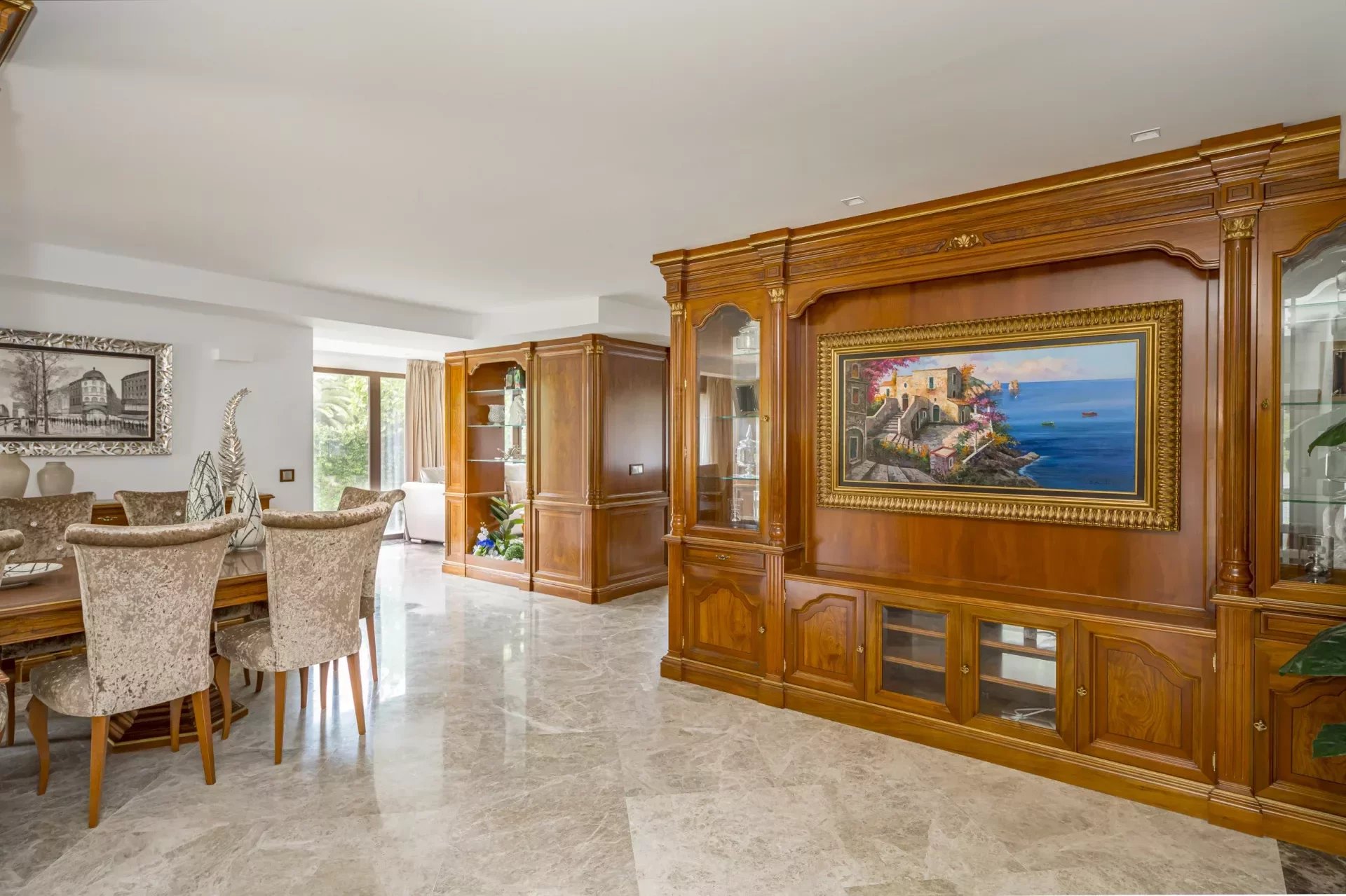 Upon entering, you will be greeted by large spaces, a good size entrance hall, double living room and a dining room, with access to the terrace, decorated with exquisite walnut woodwork and Italian design furniture. There is also a guest toilet.