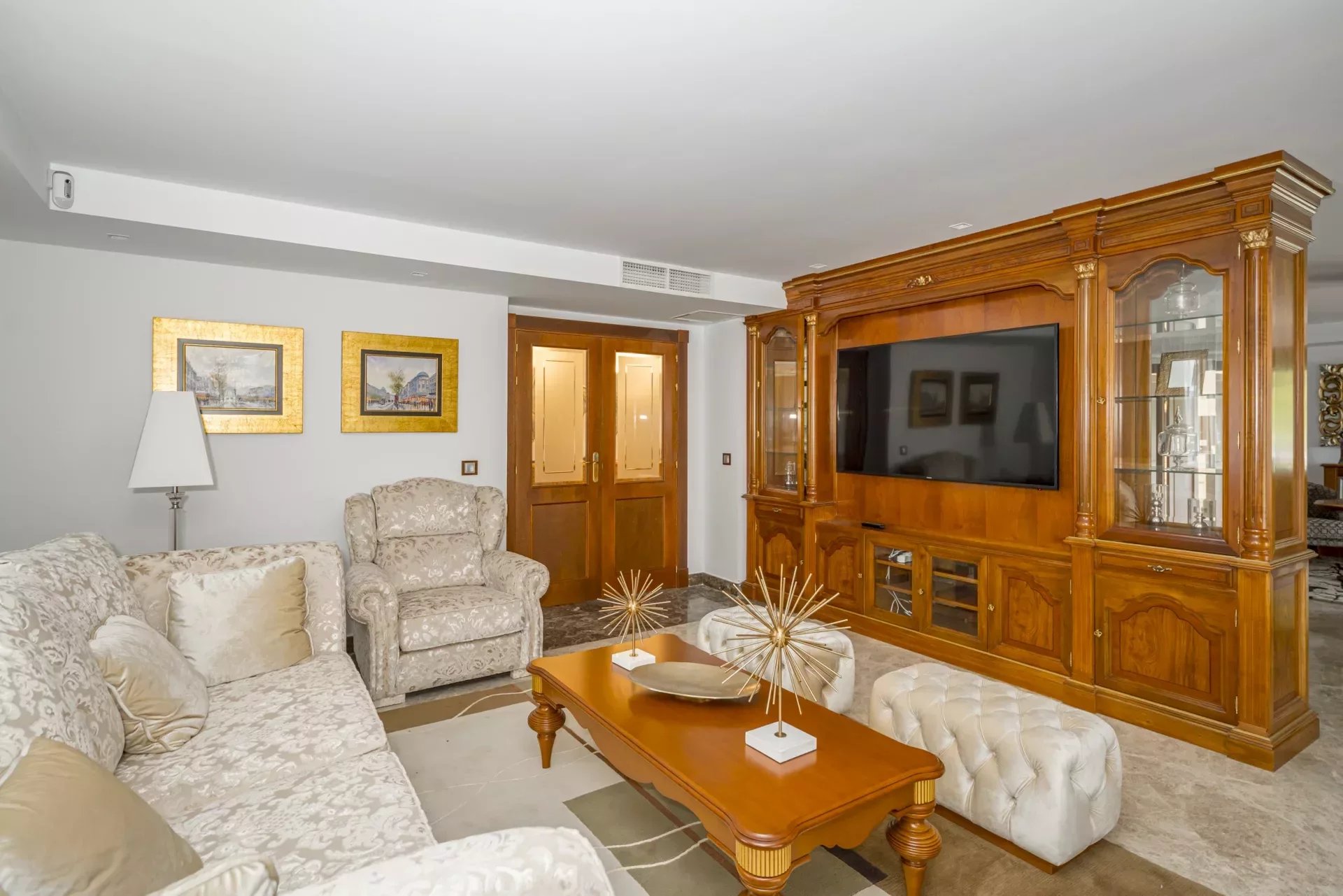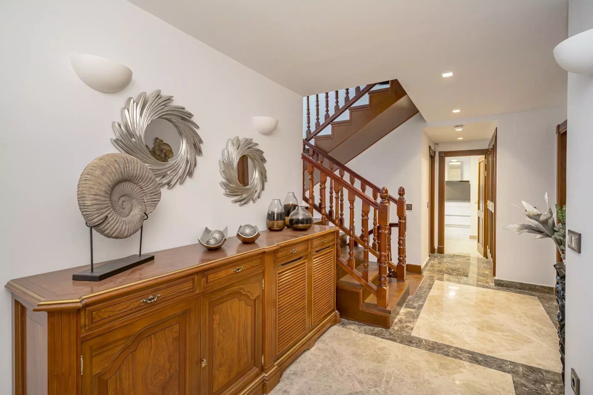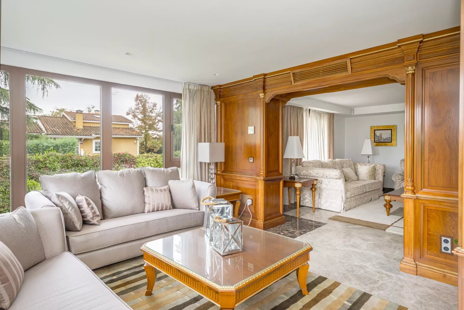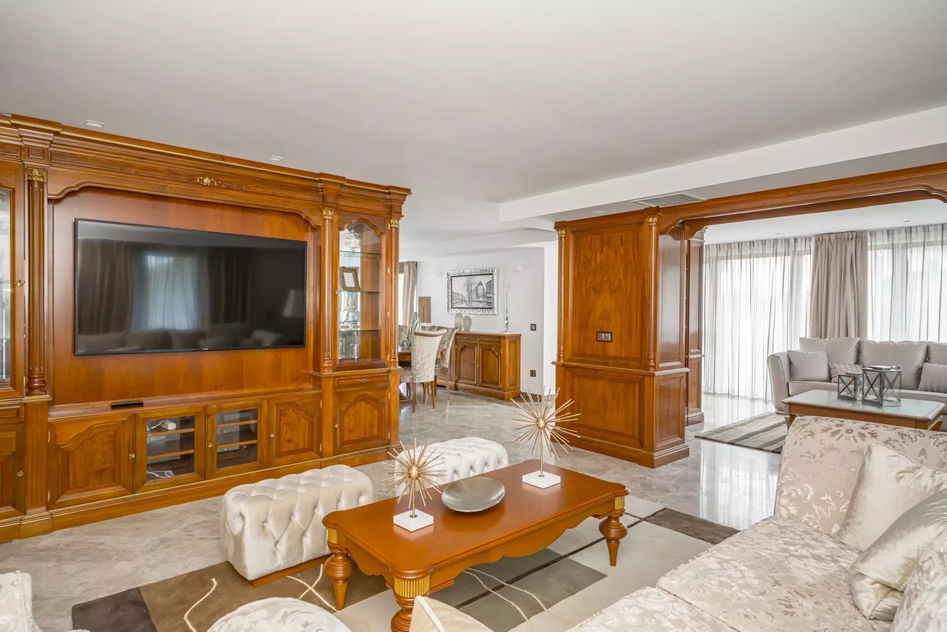 Upon entering, you will be greeted by large spaces, a good size entrance hall, double living room and a dining room, with access to the terrace, decorated with exquisite walnut woodwork and Italian design furniture. There is also a guest toilet.