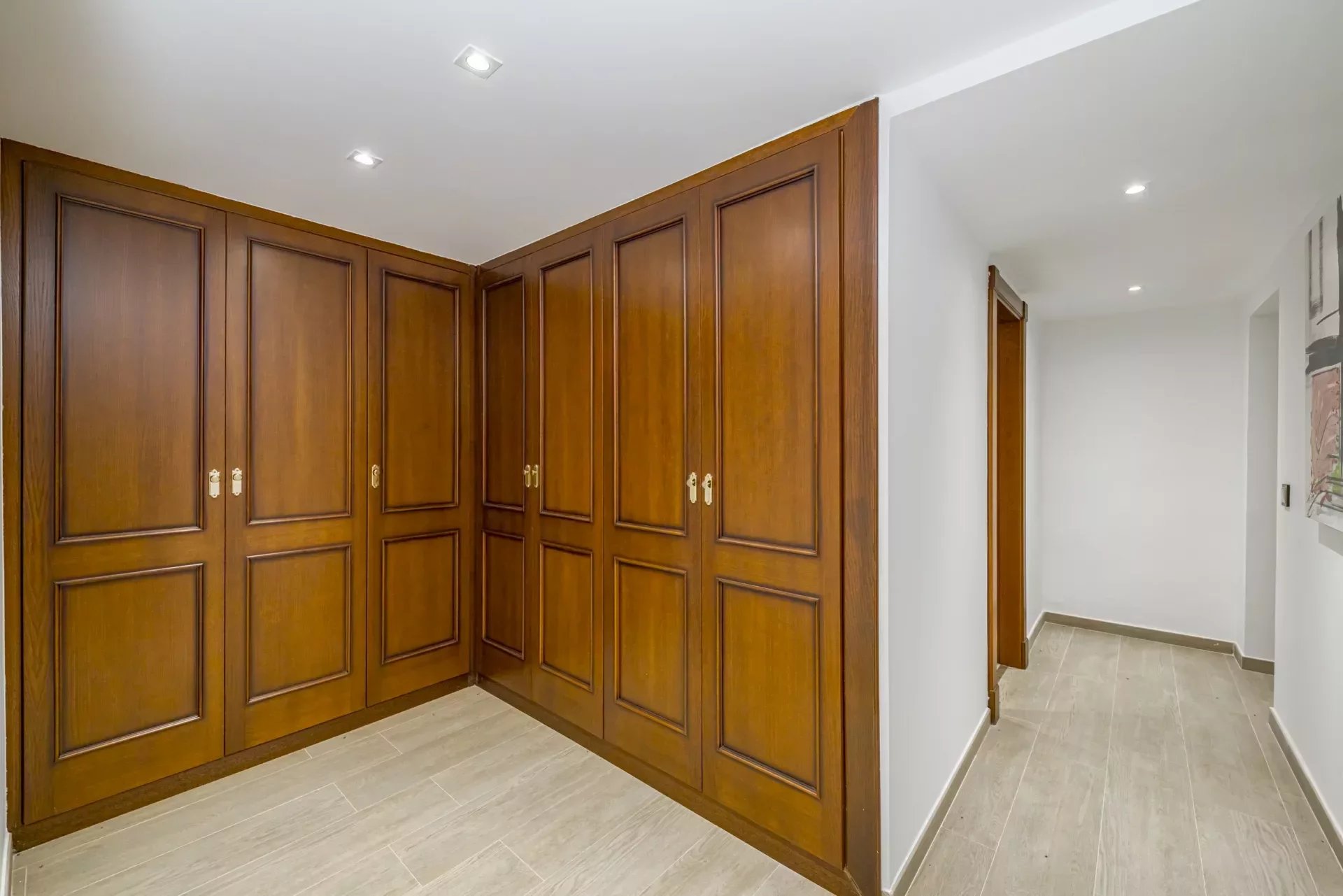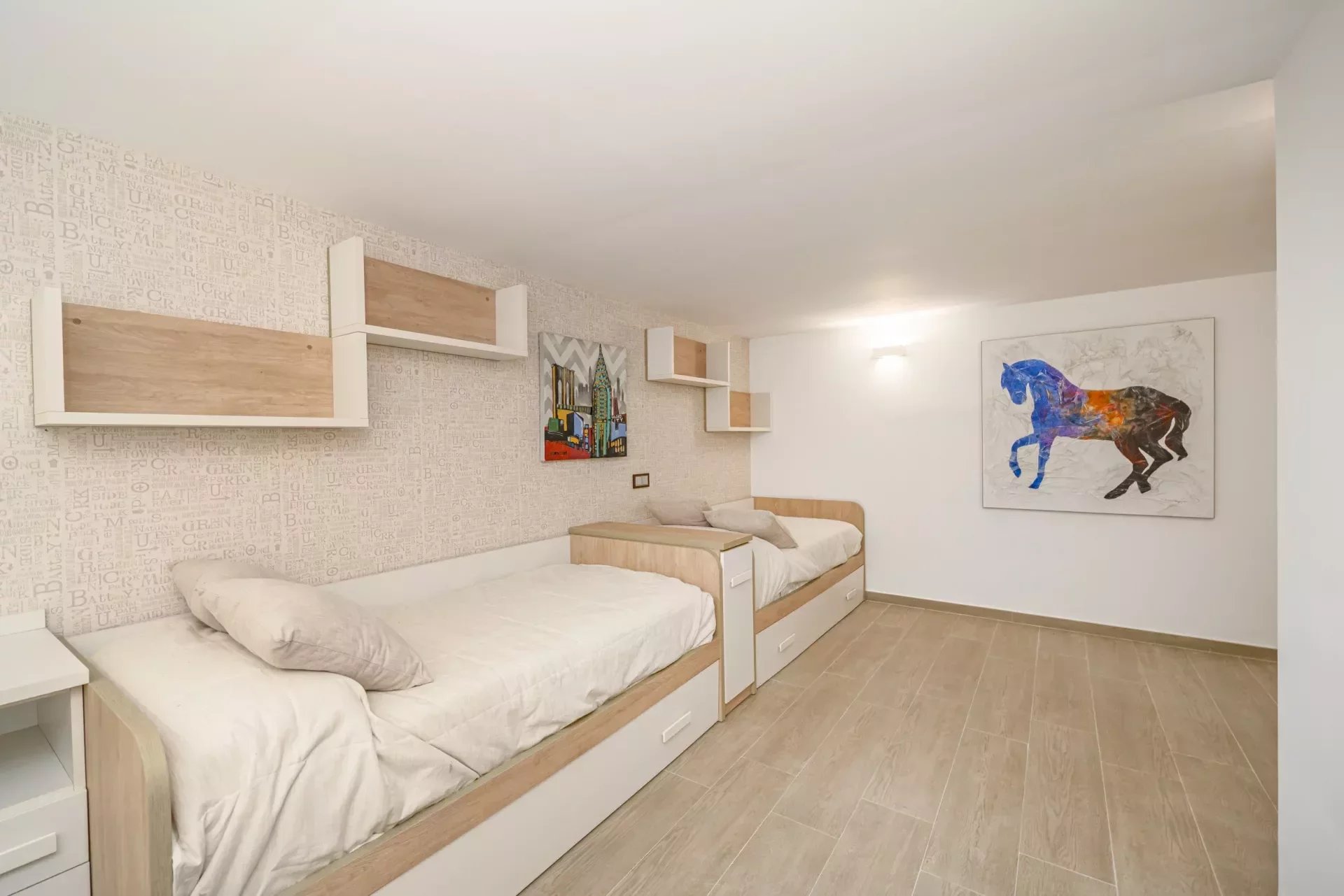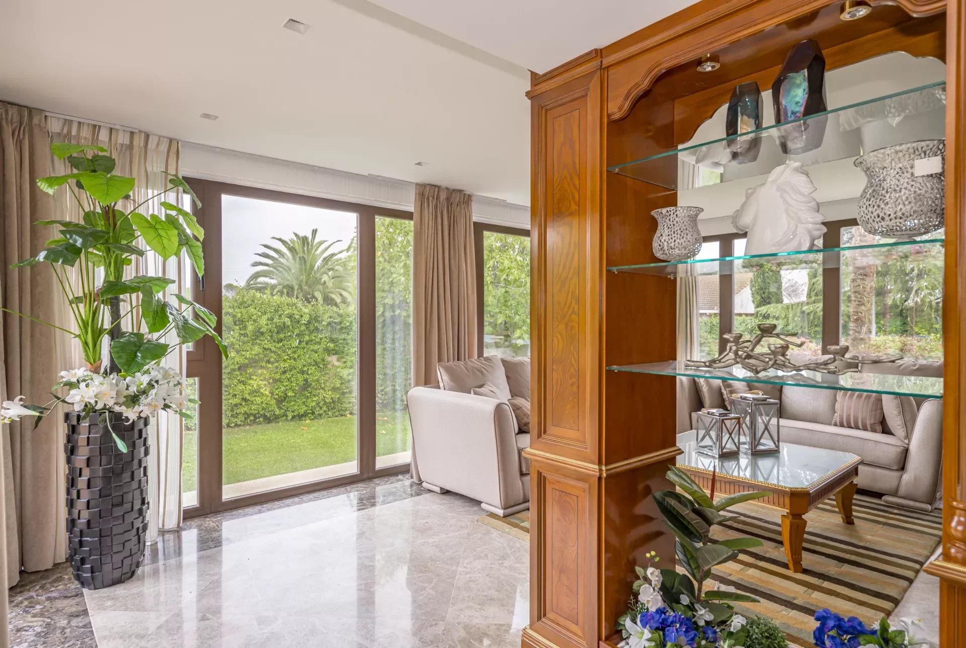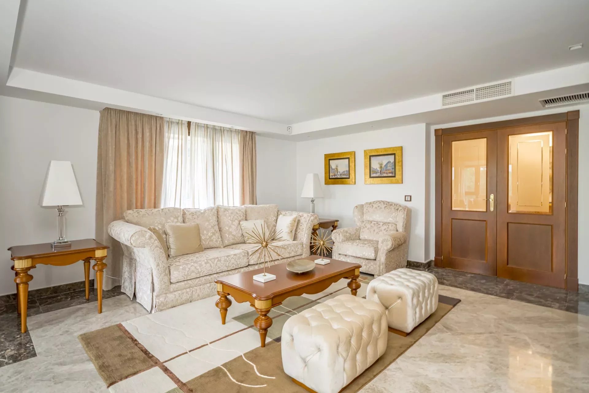 Upon entering, you will be greeted by large spaces, a good size entrance hall, double living room and a dining room, with access to the terrace, decorated with exquisite walnut woodwork and Italian design furniture. There is also a guest toilet.