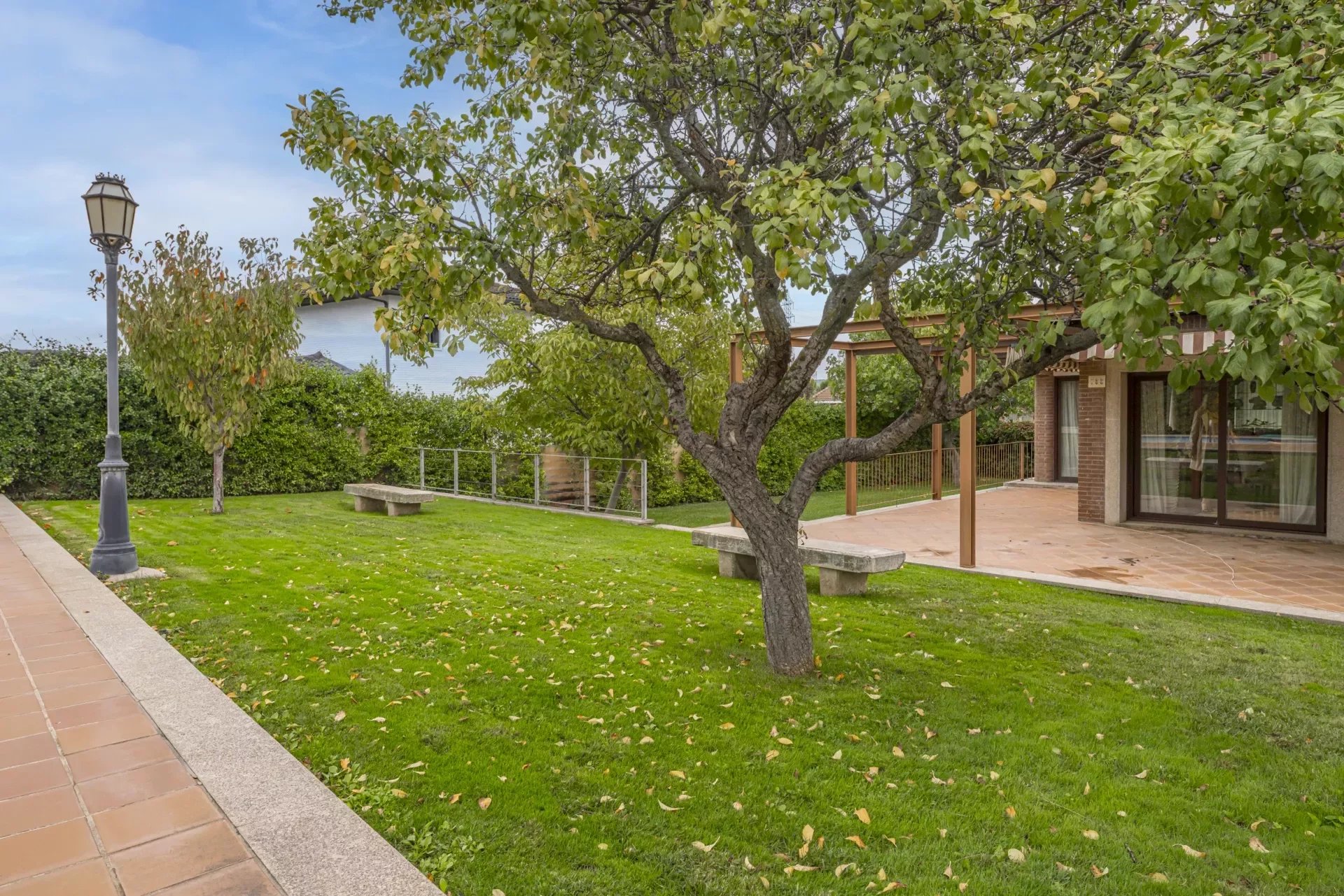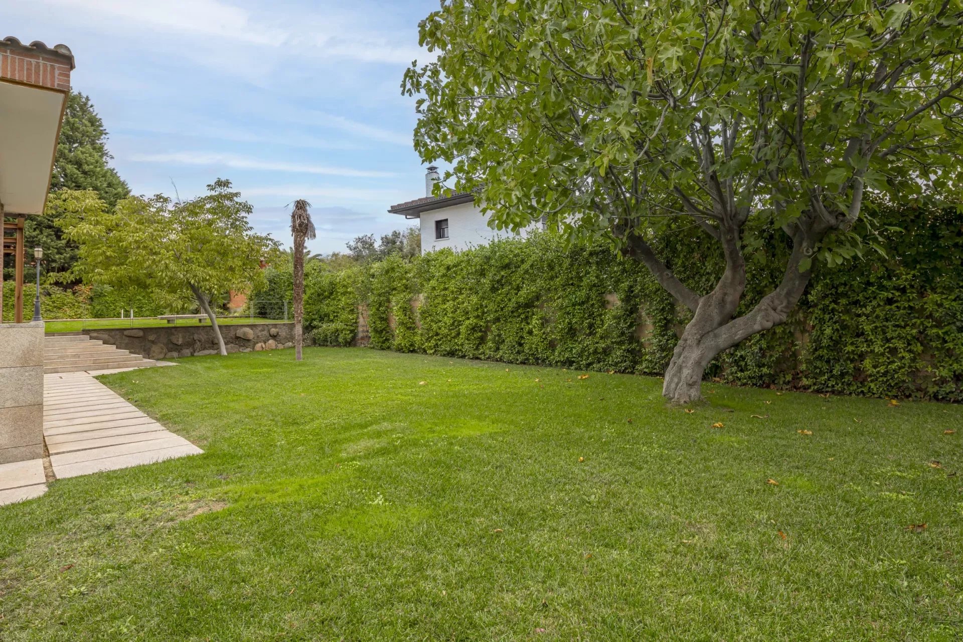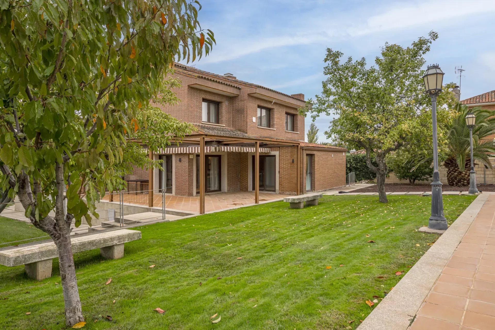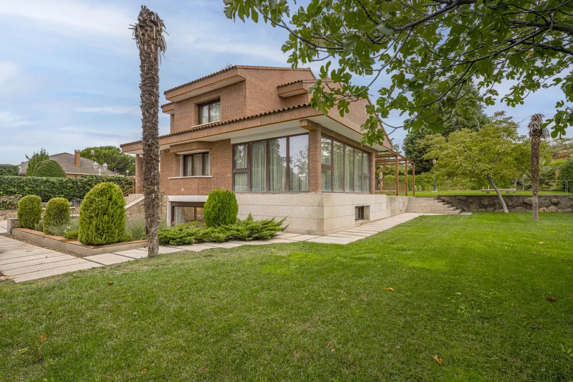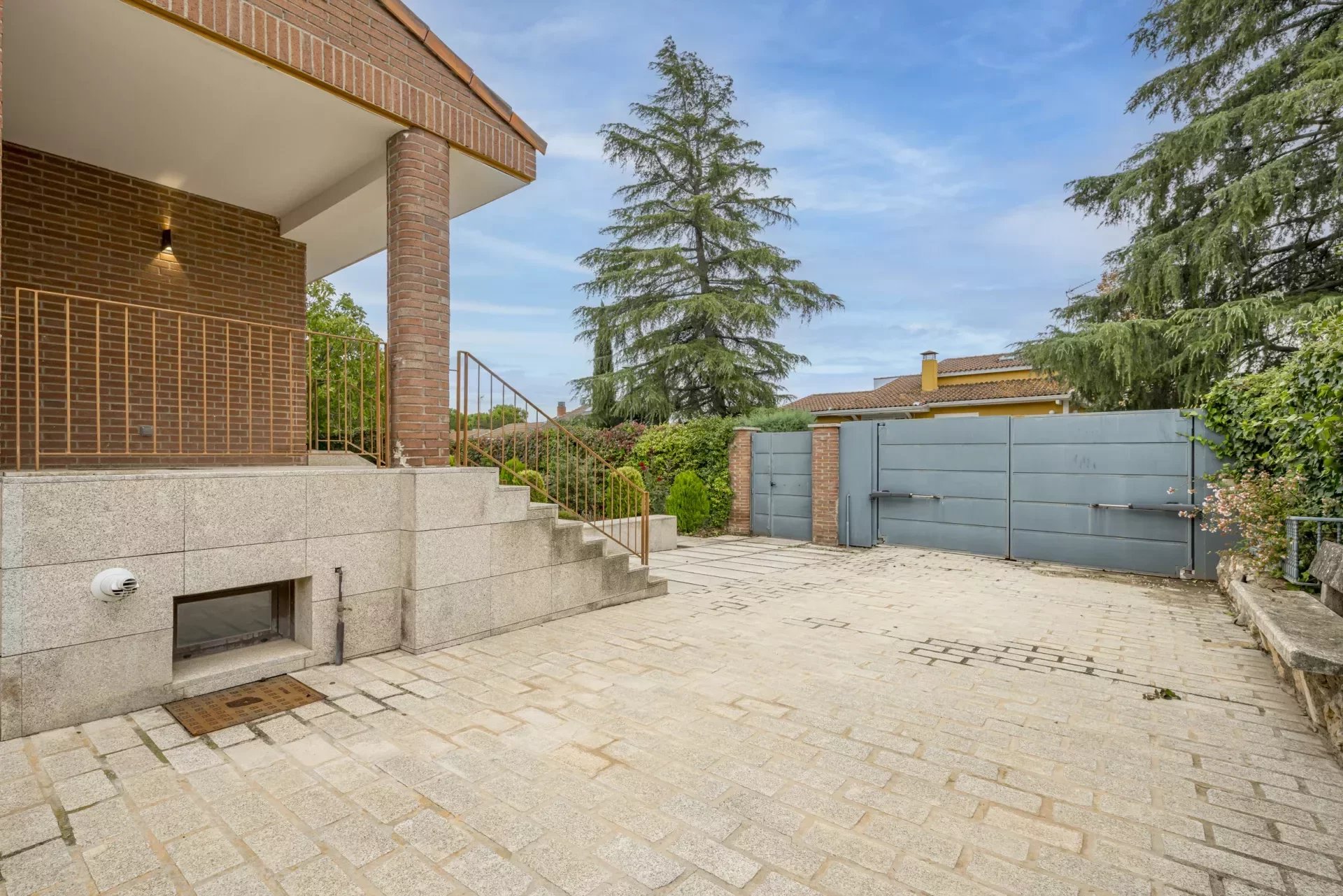 Barnes Madrid, presents this impressive property with a large entrance surrounded by outdoor gardens and ample parking for two cars.
