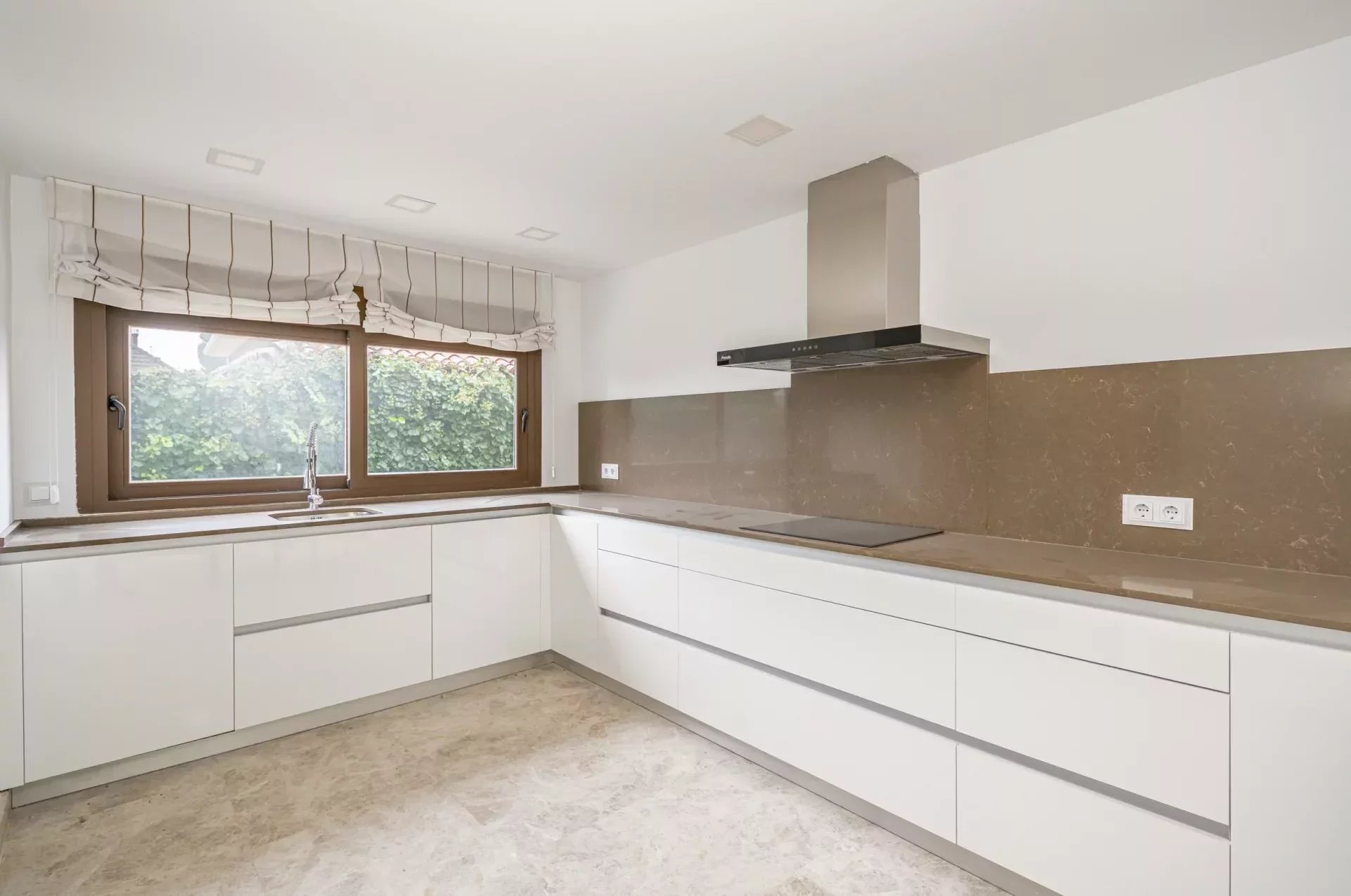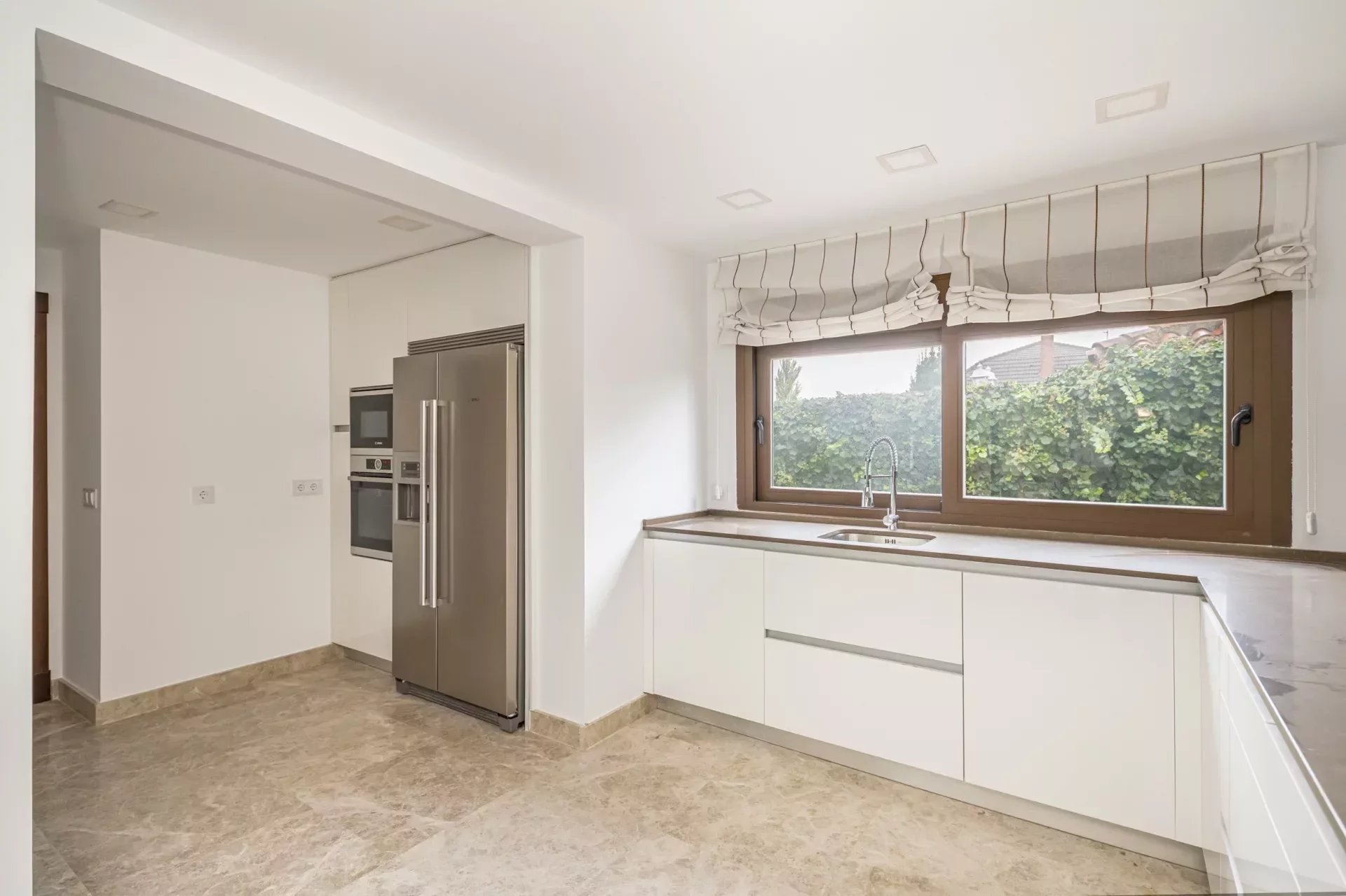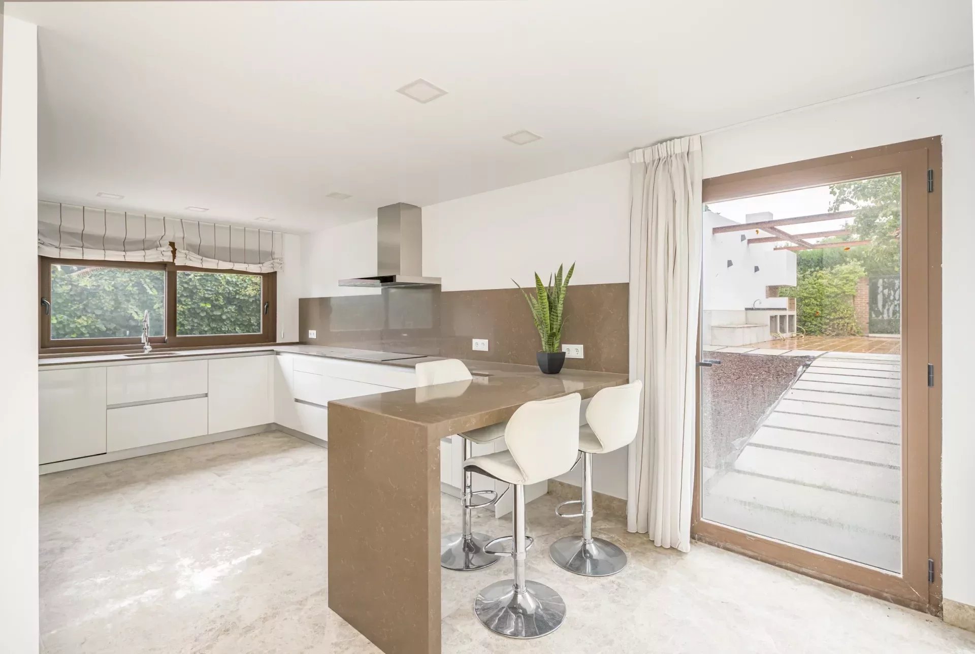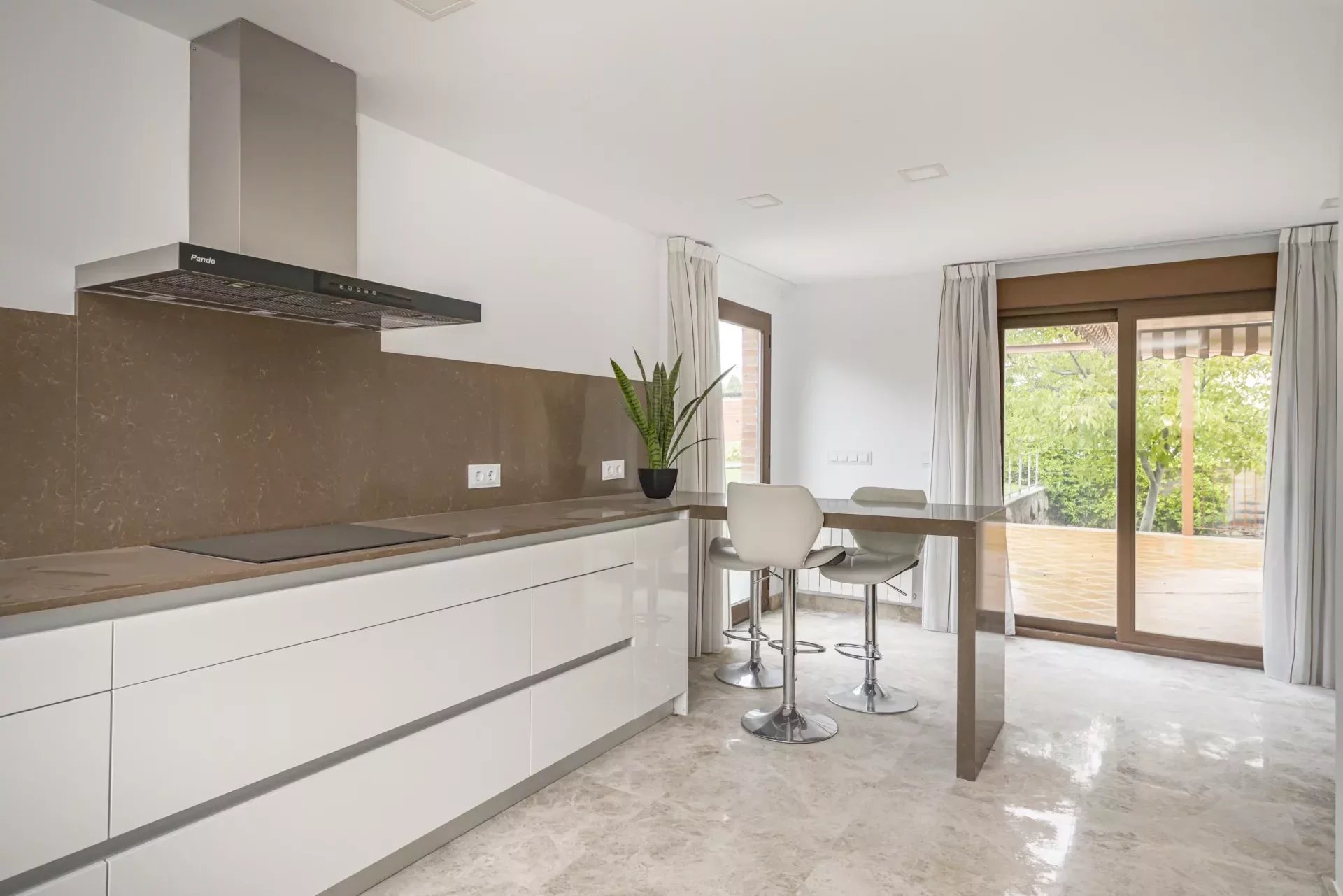 The large kitchen, with large windows and access to the terrace and swimming pool, is equipped with top of the range appliances.