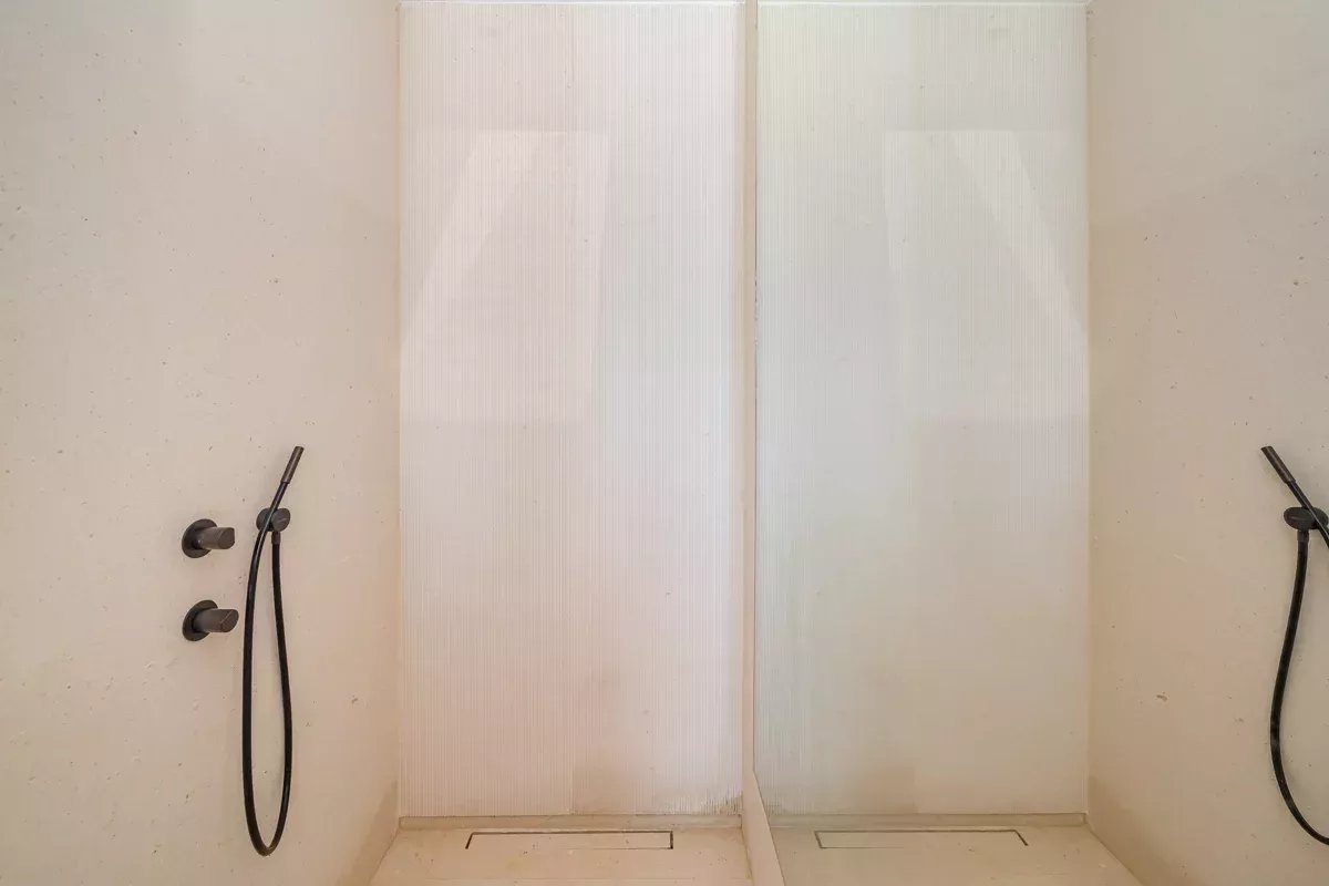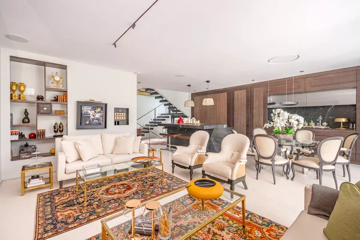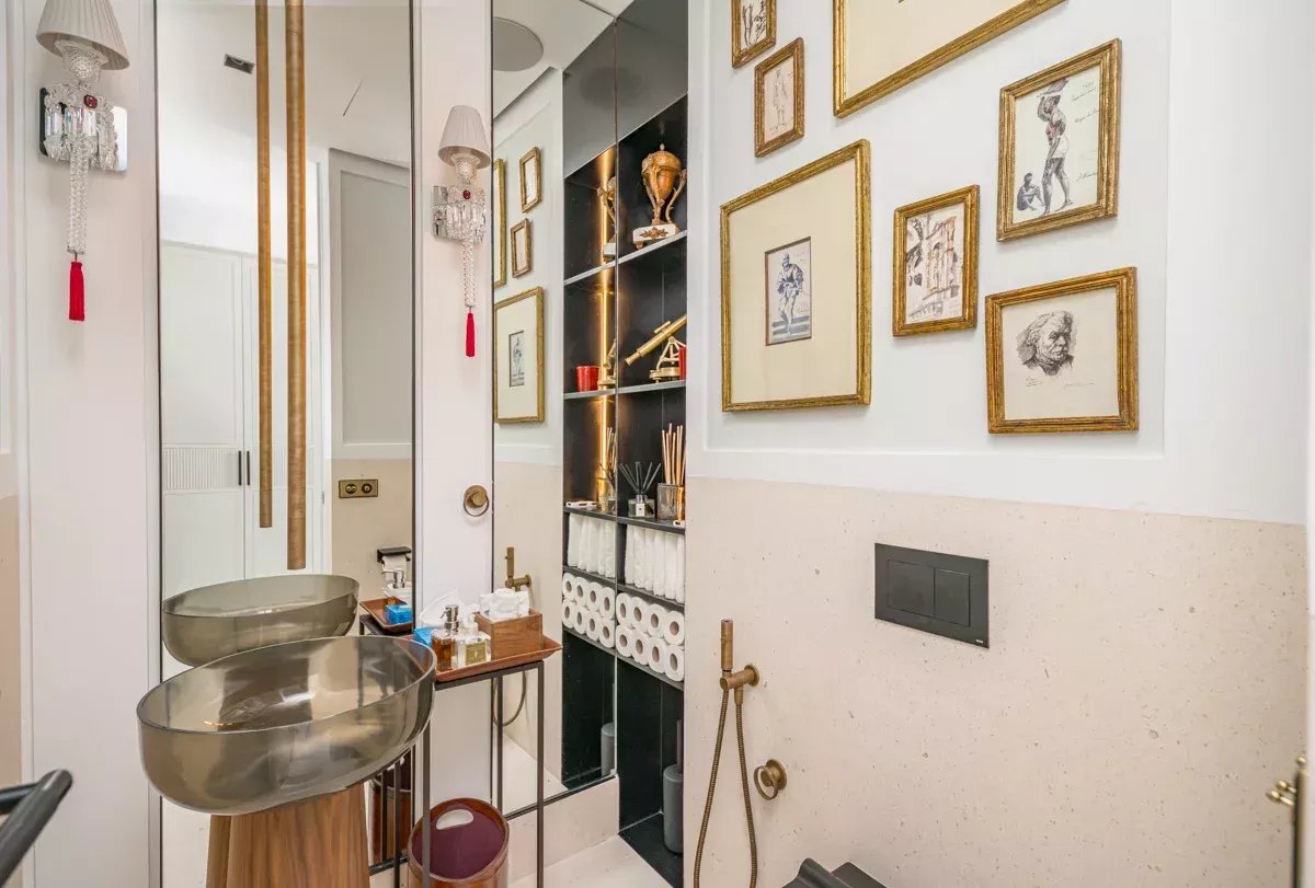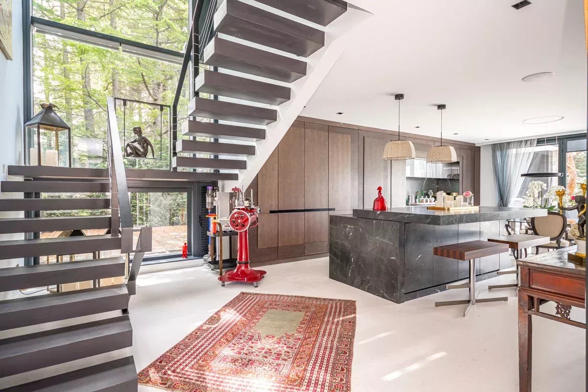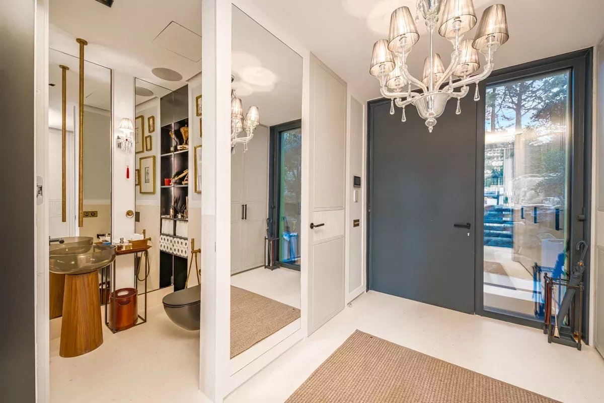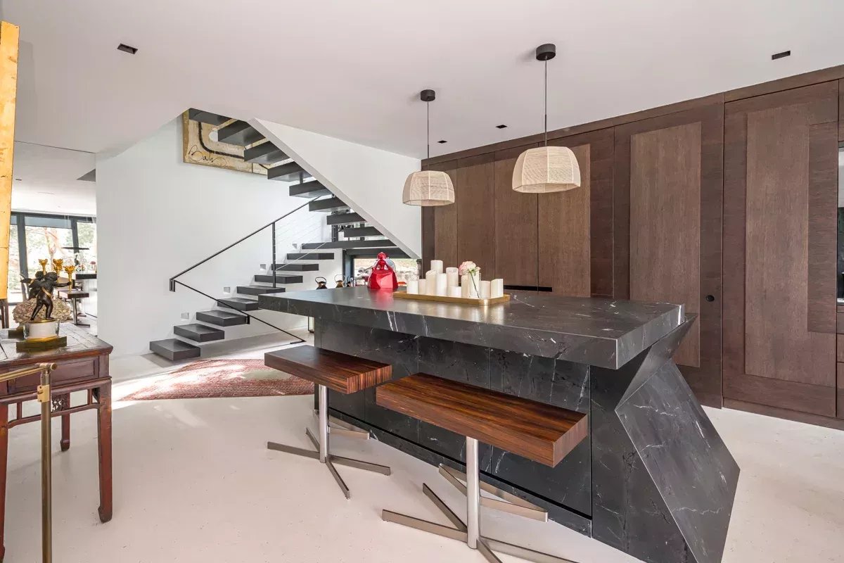 Natural marble flooring, a suspended staircase finished in Dekton, and bathrooms designed by Antonio Lupi create an atmosphere of refined elegance. Custom wardrobes and doors by renowned brands such as Gunni & Trentino and Boffi further elevate the home’s exclusivity.