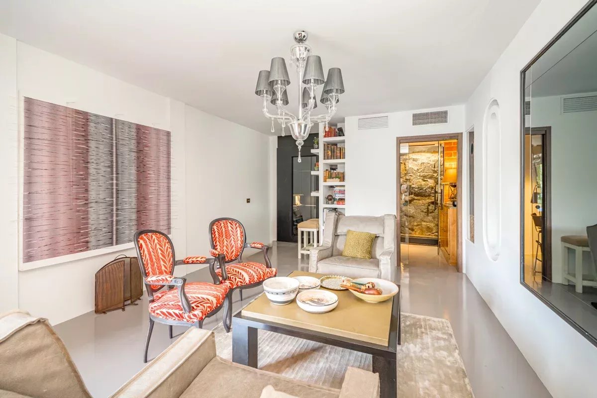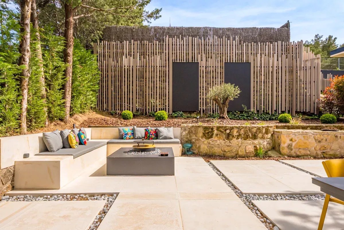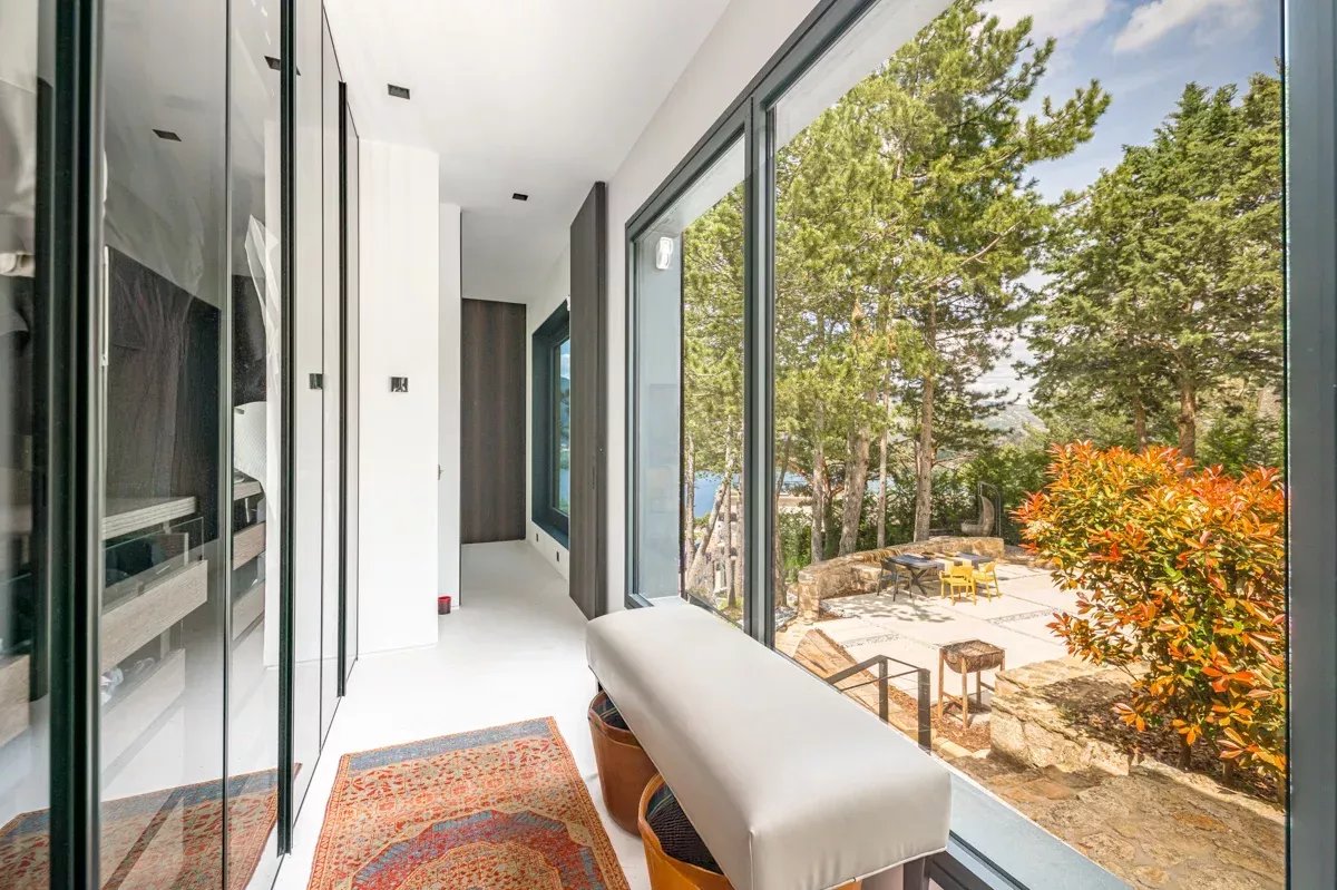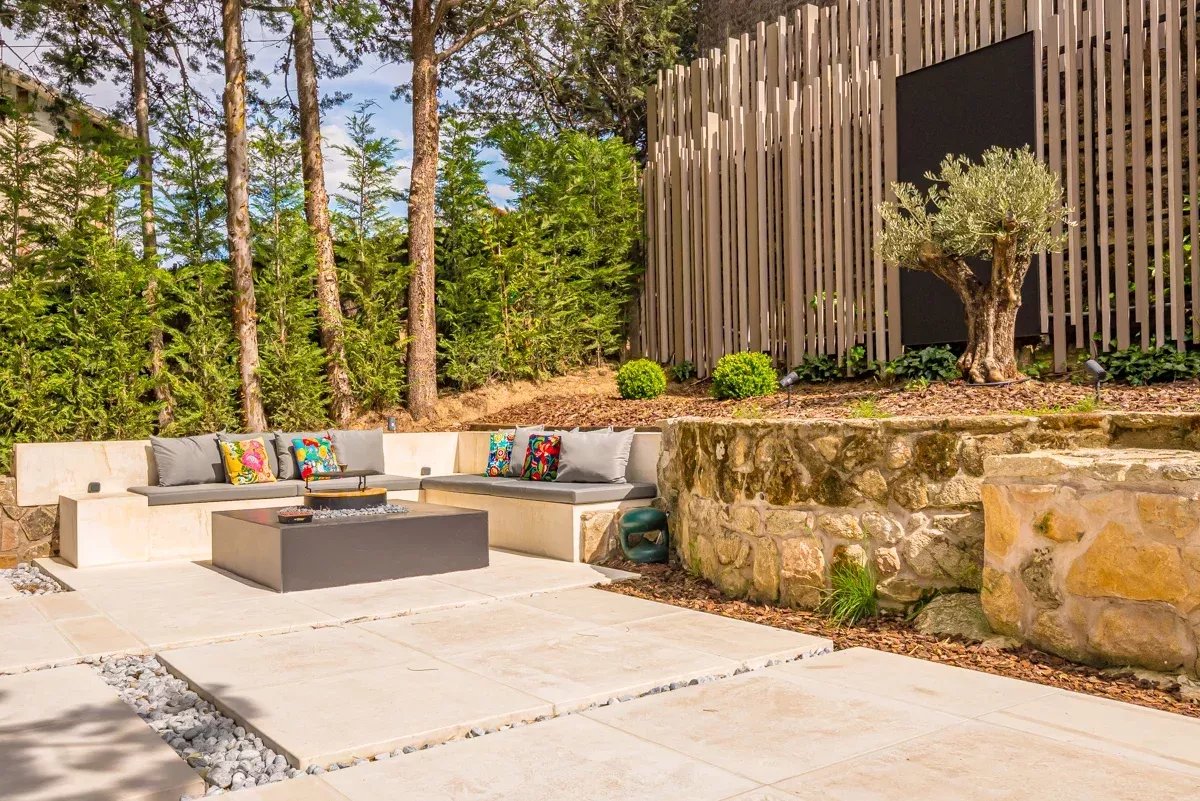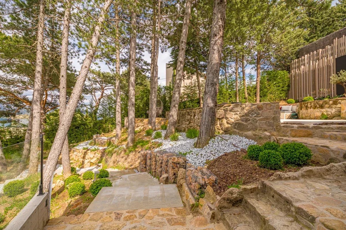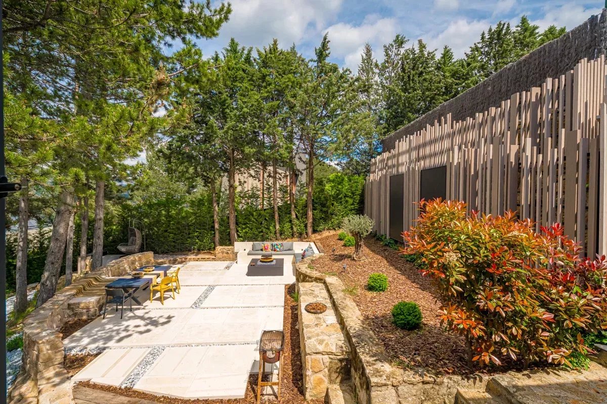 Enjoy a pool with jacuzzi, a lounge area with a nautically inspired outdoor kitchen, gas fireplaces, a professional B&W/Sonos sound system, and a landscaped garden with century-old olive trees, bespoke lighting, and an automatic irrigation system.