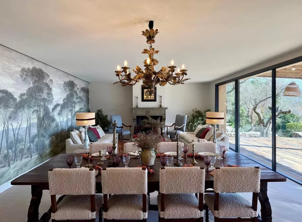 The fully equipped kitchen with central island opens directly onto a panoramic terrace with direct access to the pool, overlooking the forest and valley.