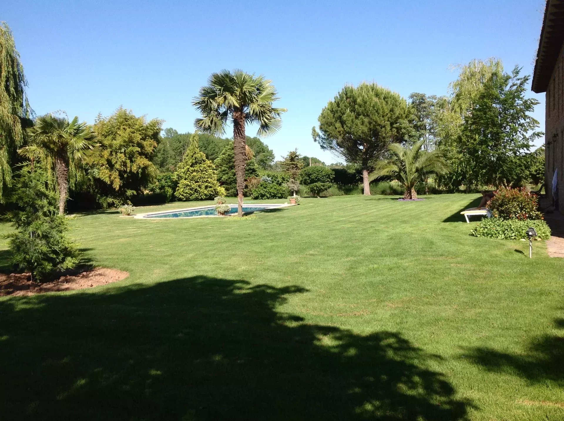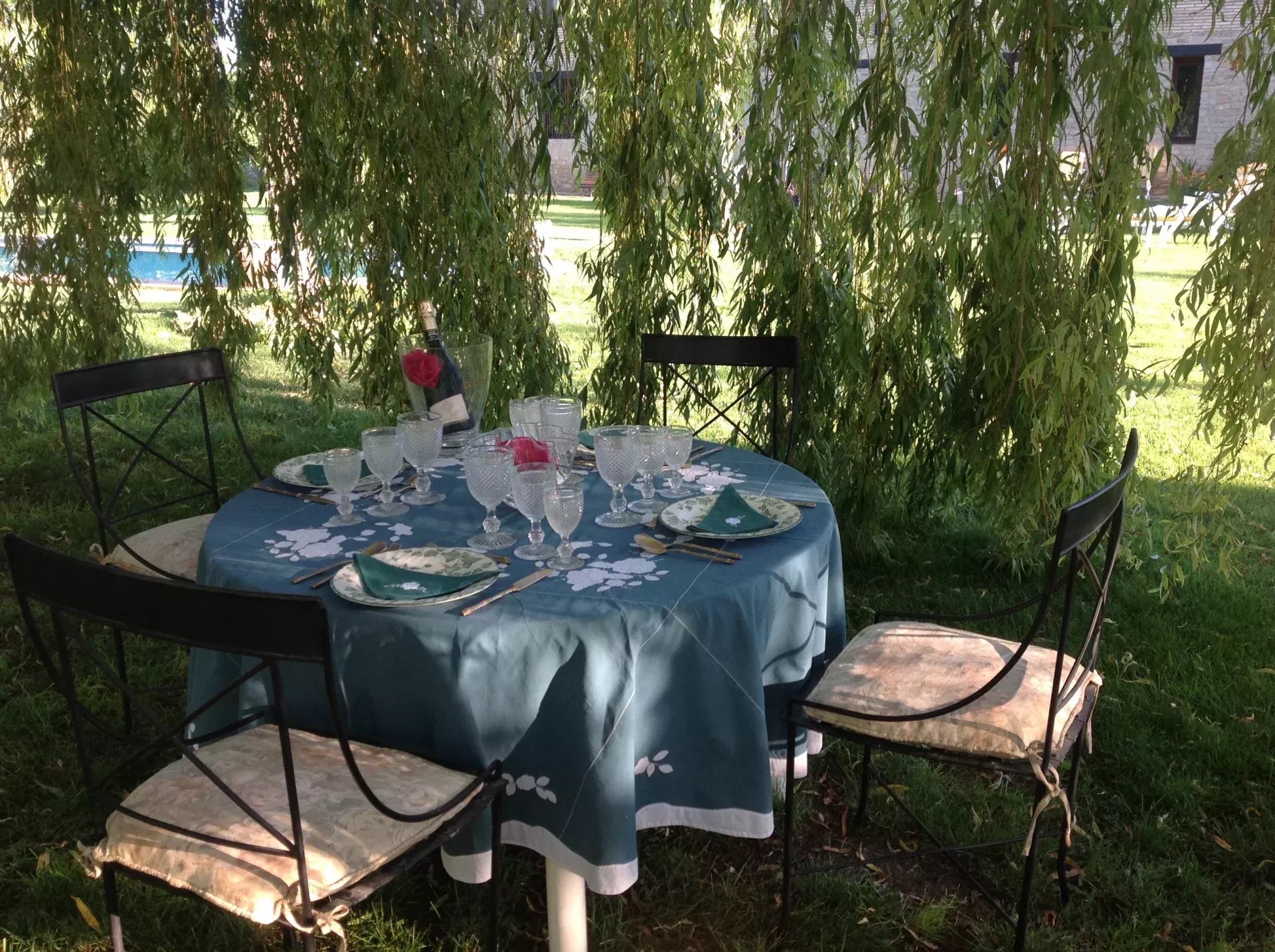 The outdoor area is carefully designed for enjoyment and events, with lush gardens, a swimming pool, outdoor bathrooms, and resting areas with Roman stone tables and benches, perfect for family and corporate events.