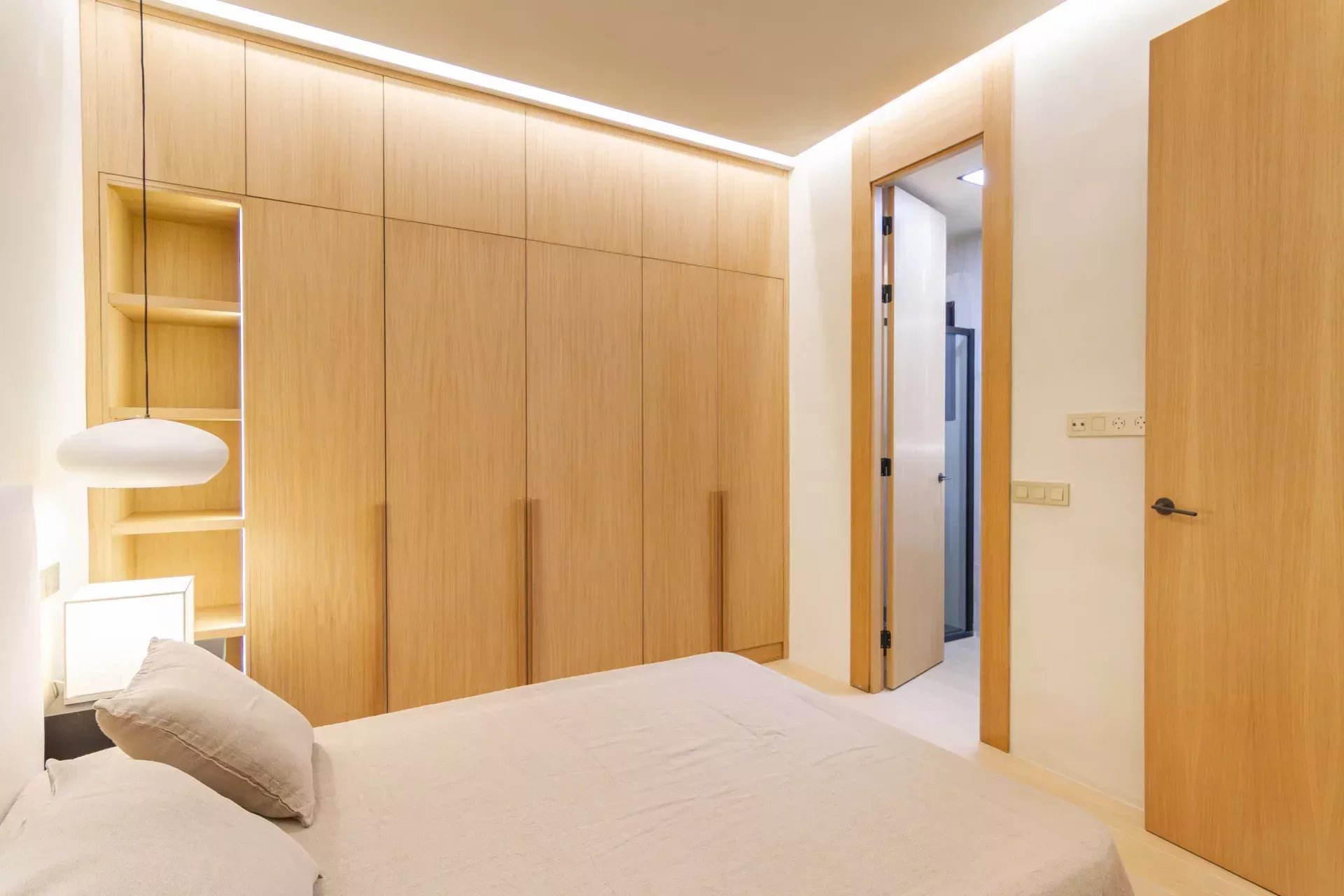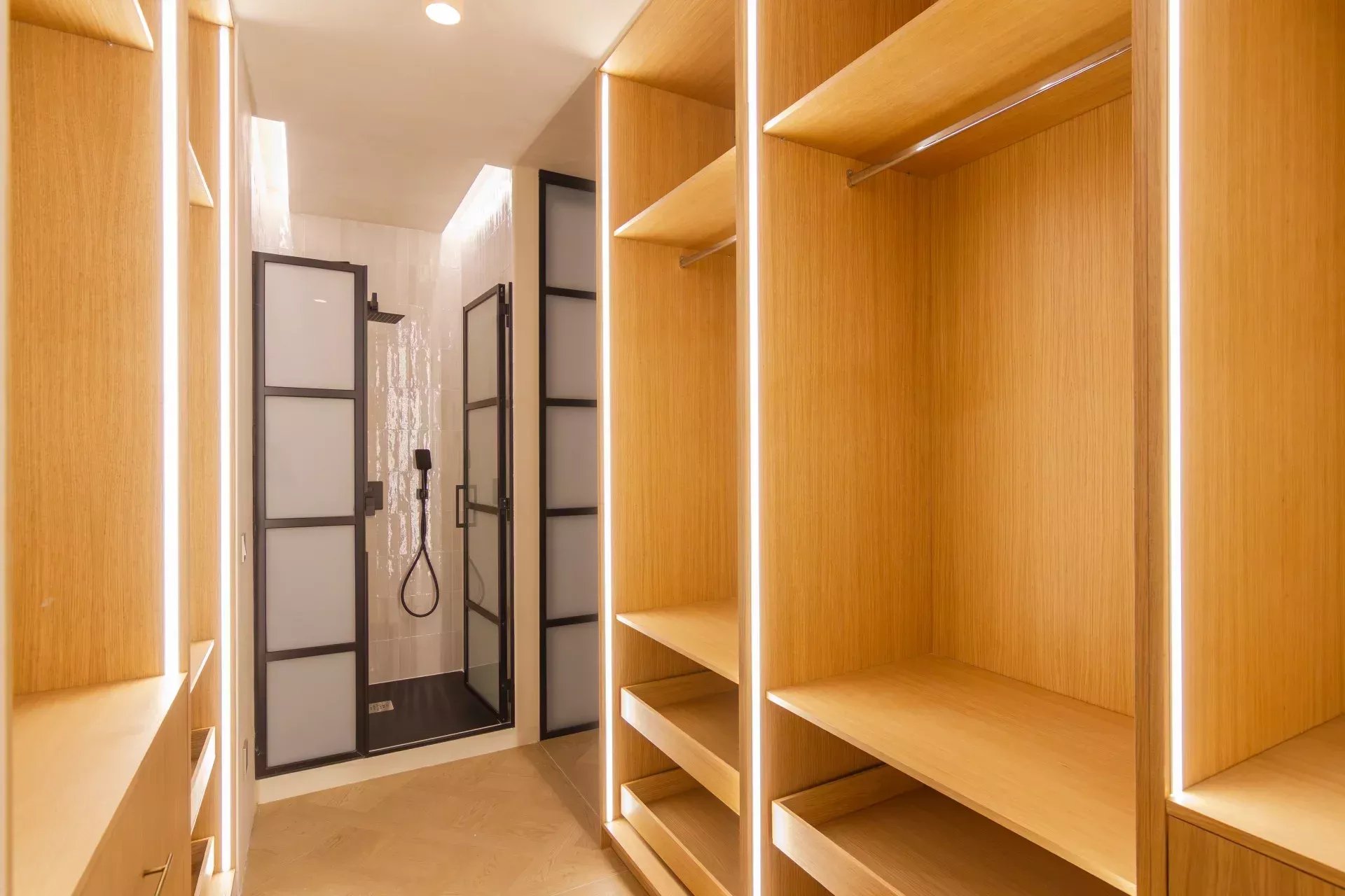 The bedrooms follow the same warm, minimal tone. The main suite features a walk-in wardrobe and a bathroom with double stone basins. The second bedroom, also en suite, offers ample storage and a quiet, restful atmosphere. There's also a guest WC and a small entrance hall that sets the rhythm of the space.