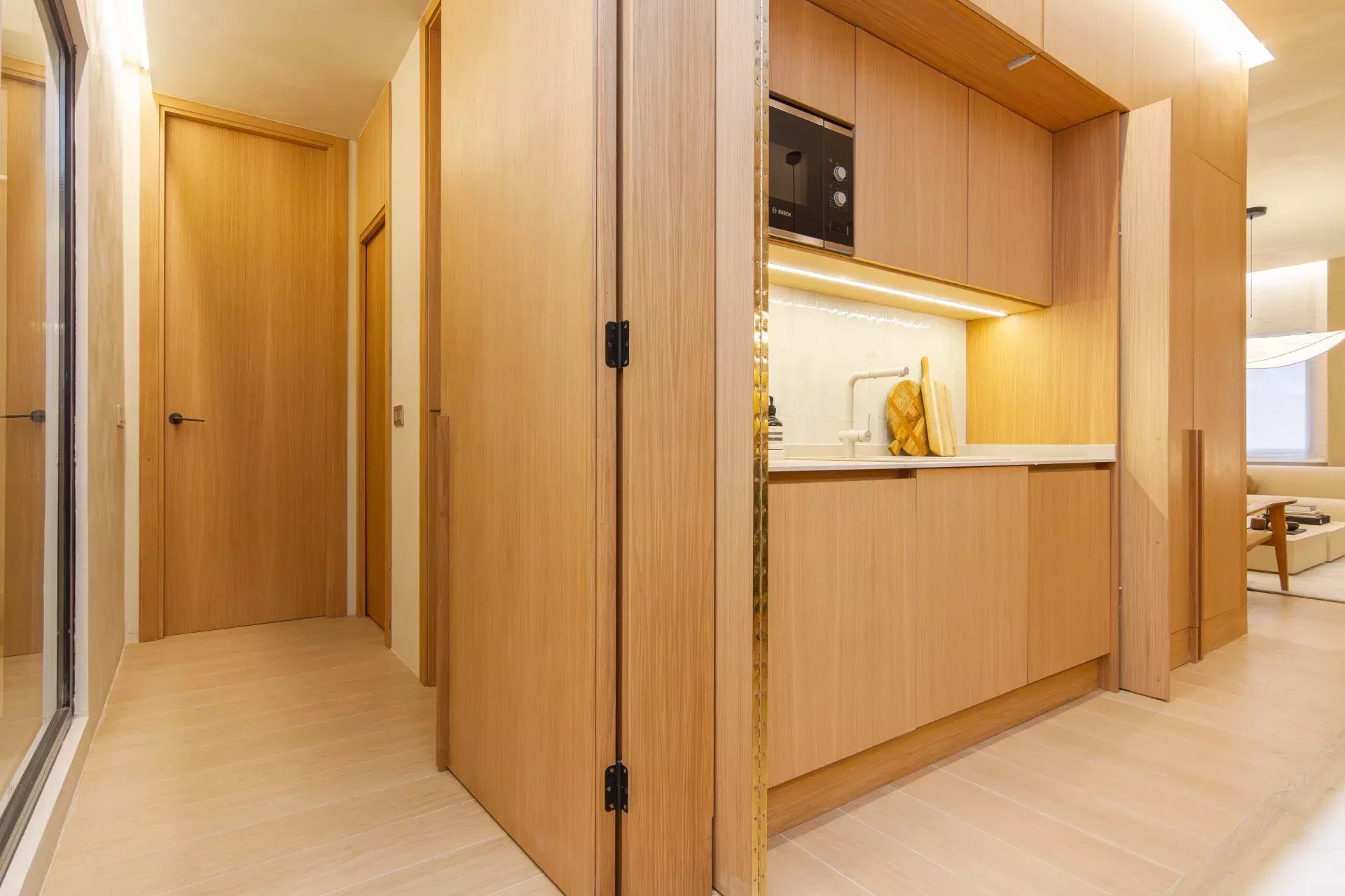 The kitchen is designed as the social heart of the home. A large central island invites both slow breakfasts and long dinners. Everything is discreetly integrated: appliances, pantry, even the wine cooler, all hidden behind oak cabinetry. It connects smoothly with a semi-open living room—enough separation to give privacy, yet still part of the whole.