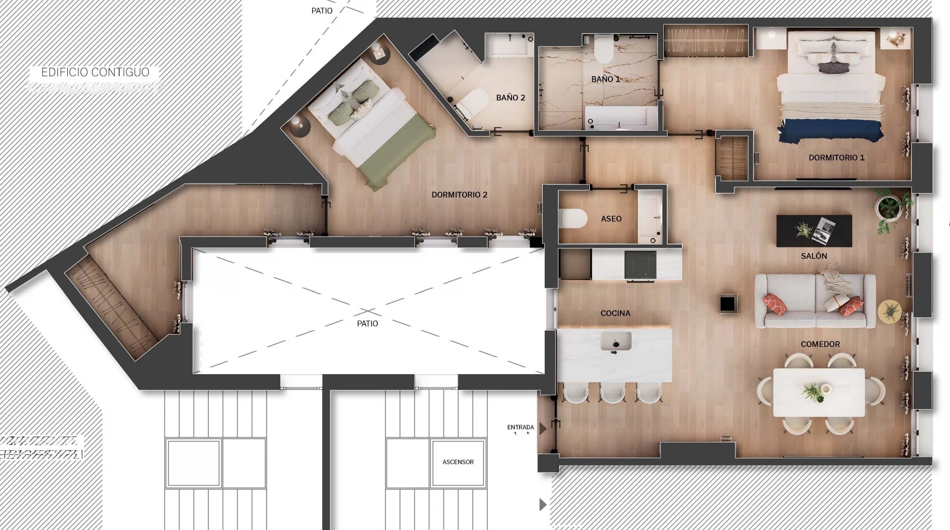 The private area has two double bedrooms, both with en-suite bathrooms, as well as an additional guest toilet. Each room has been designed with top-quality materials and integrated storage solutions, excellent circulation between spaces, and a practical and balanced layout.