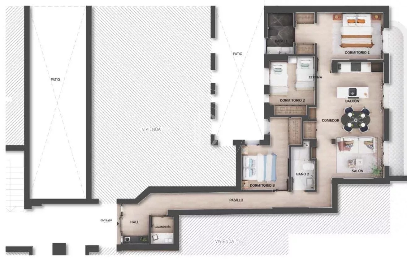 The property has three spacious and bright bedrooms, designed for functionality and comfort. It has two full bathrooms with modern finishes and high-quality materials, as well as a bright living-dining room that opens onto the exterior balcony, facing a large courtyard, which provides natural light and a feeling of tranquillity throughout the home.