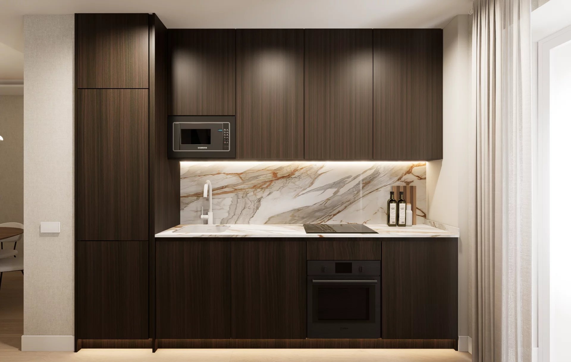 The day area is located towards the exterior façade. The living-dining room is spacious and regular in shape, allowing for a comfortable furniture layout and a clear distinction between the sitting and dining areas. The fully integrated and equipped kitchen is located next to the living room, creating a functional and comfortable space for everyday use.