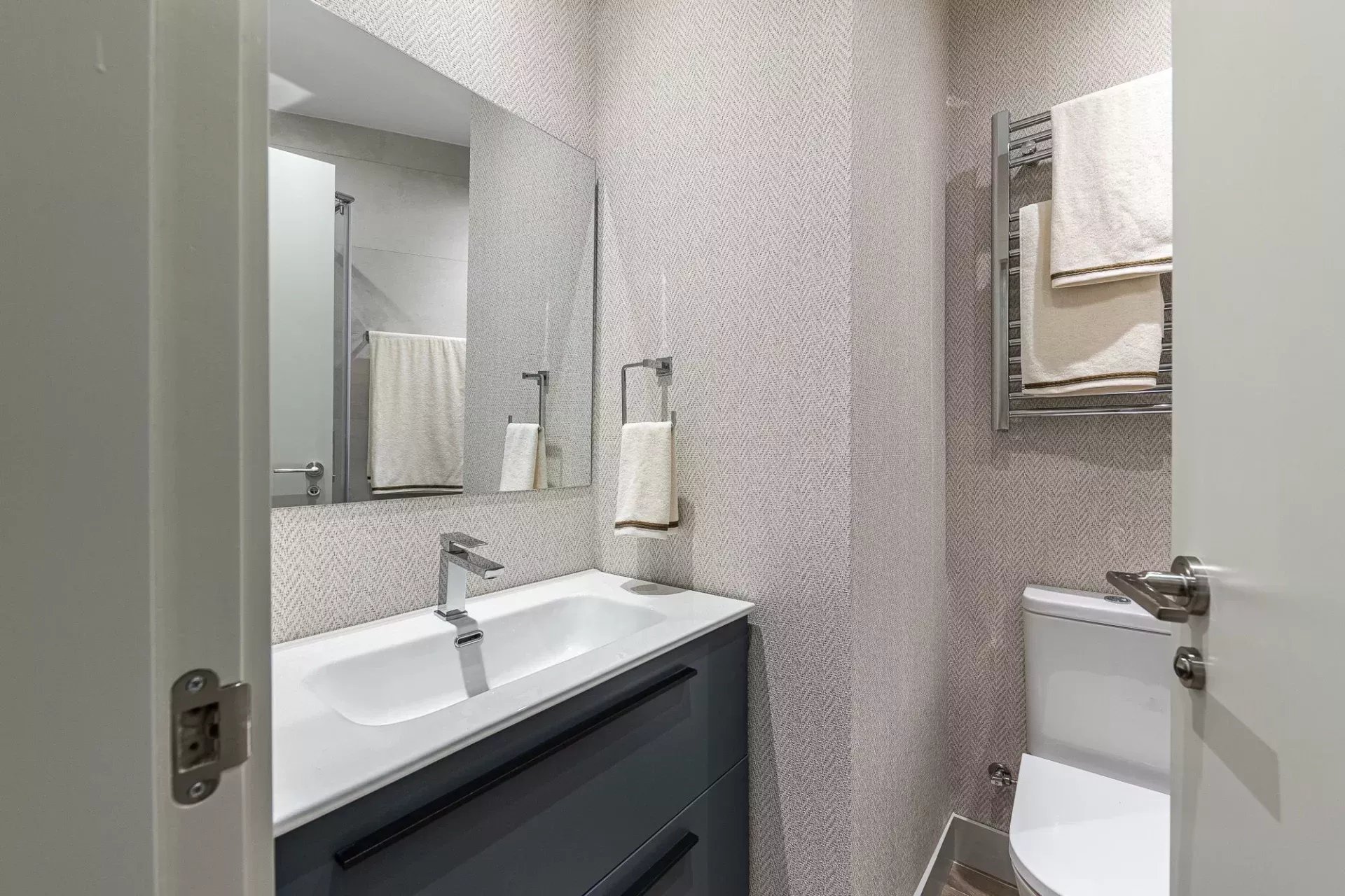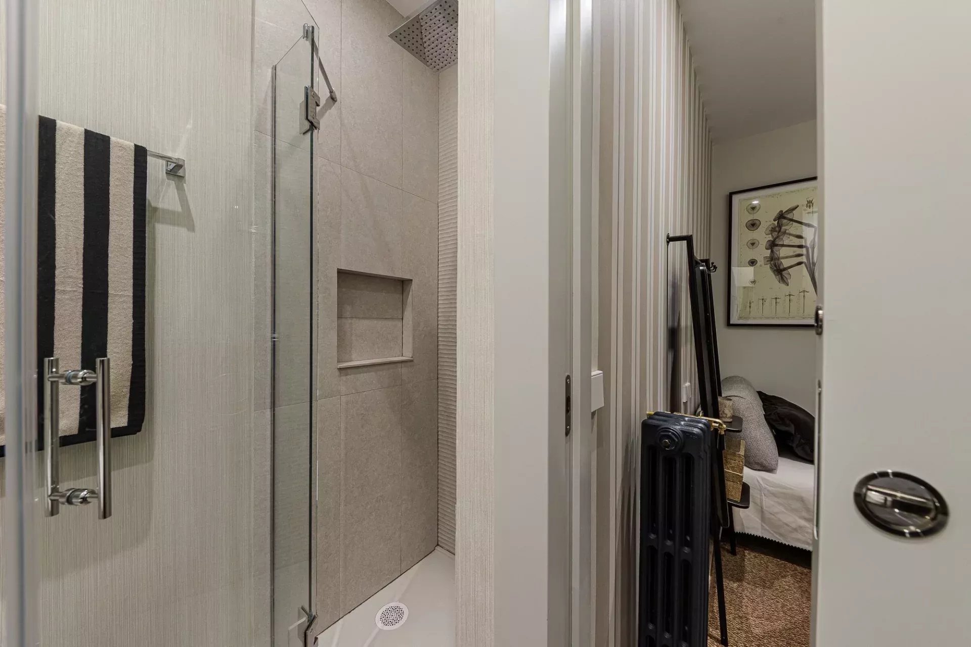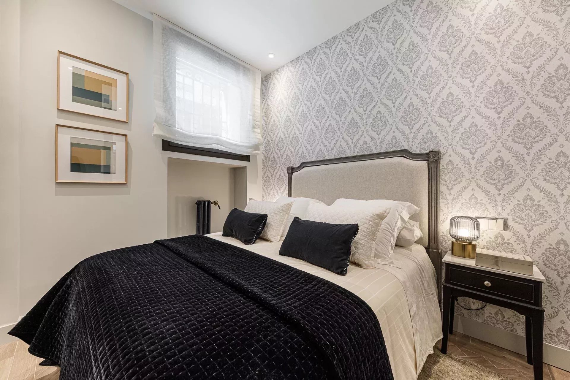 It comprises three well-appointed bedrooms and three exquisitely finished bathrooms. Every detail has been thoughtfully curated, from the elegant wallpaper to the premium fixtures, creating an atmosphere of understated luxury. High ceilings enhance the sense of space throughout the home.
