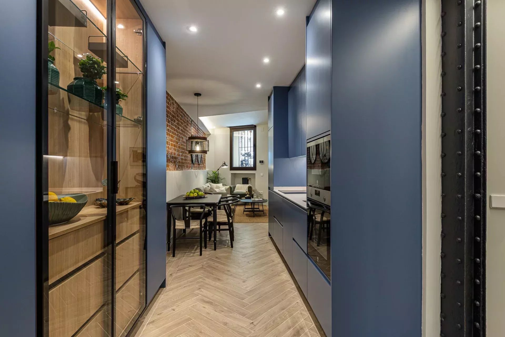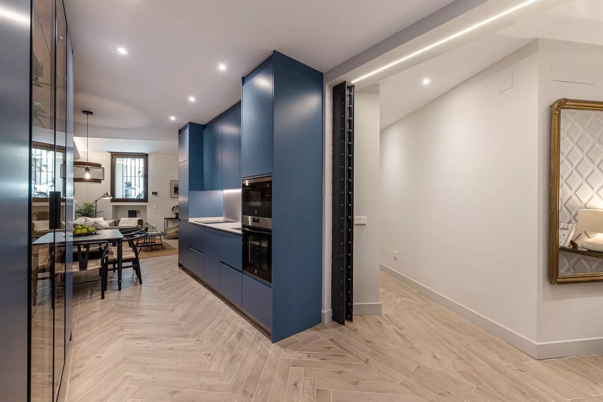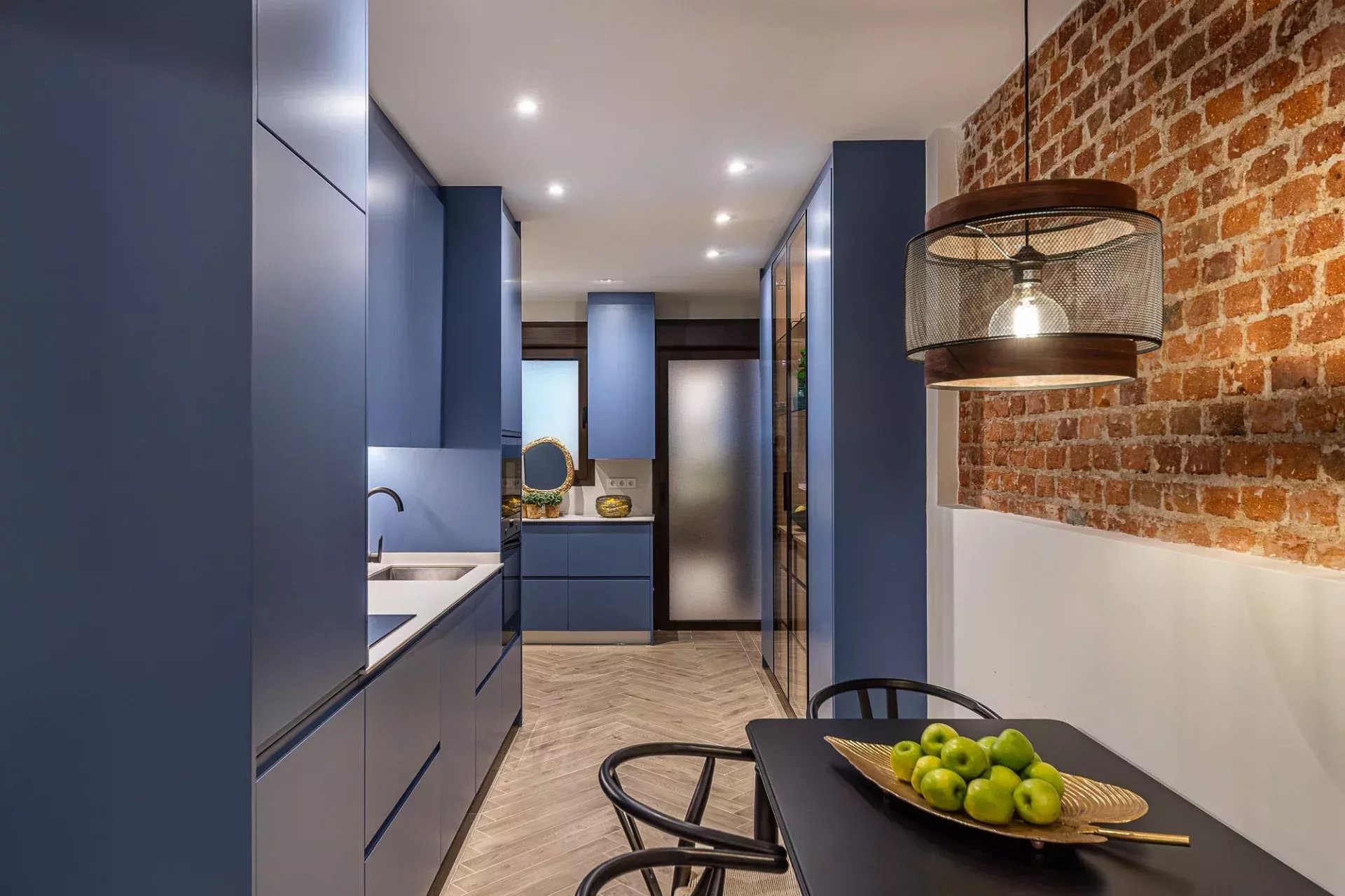 Located on the ground floor with a North-Northeast orientation, the open-plan layout flows seamlessly into a stylish, modern kitchen featuring striking blue cabinetry and top-of-the-line appliances.