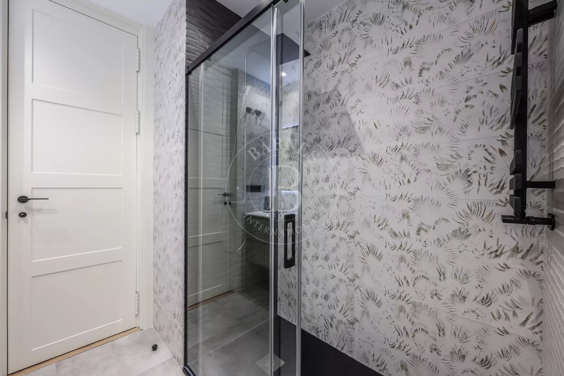 The sleeping area features three bedrooms and two full en-suite bathrooms, each with built-in wardrobes and a meticulous selection of fine materials such as natural wood, marble, and designer fixtures.