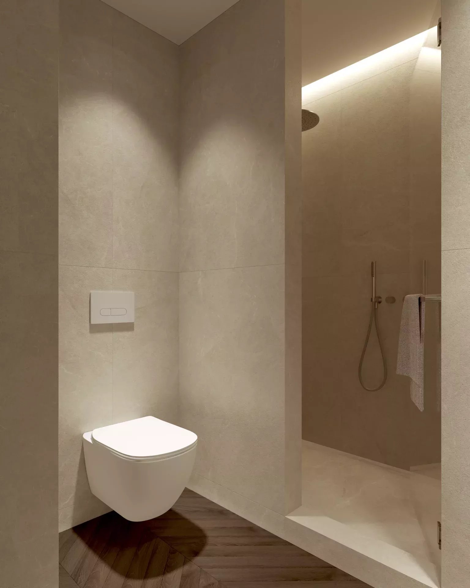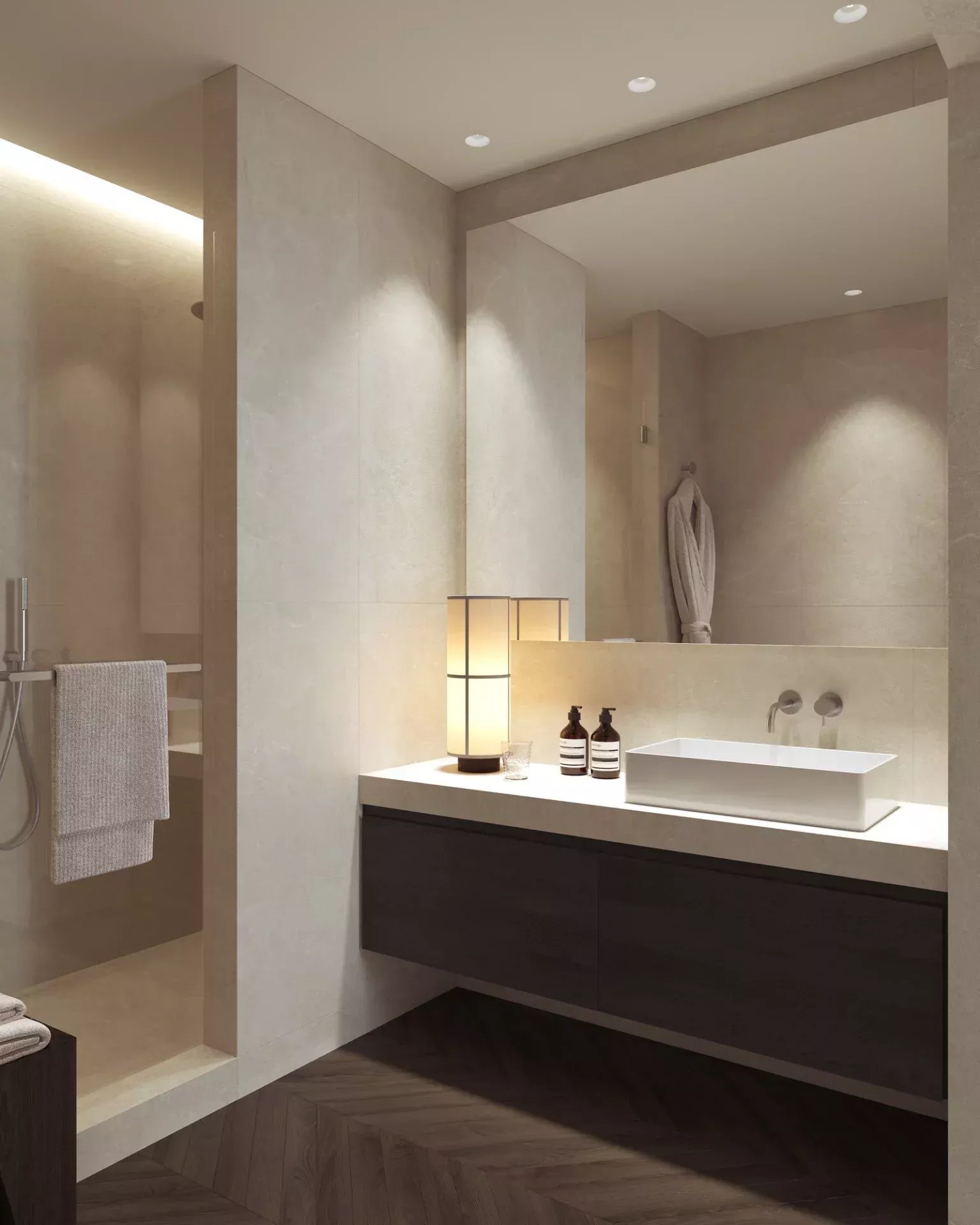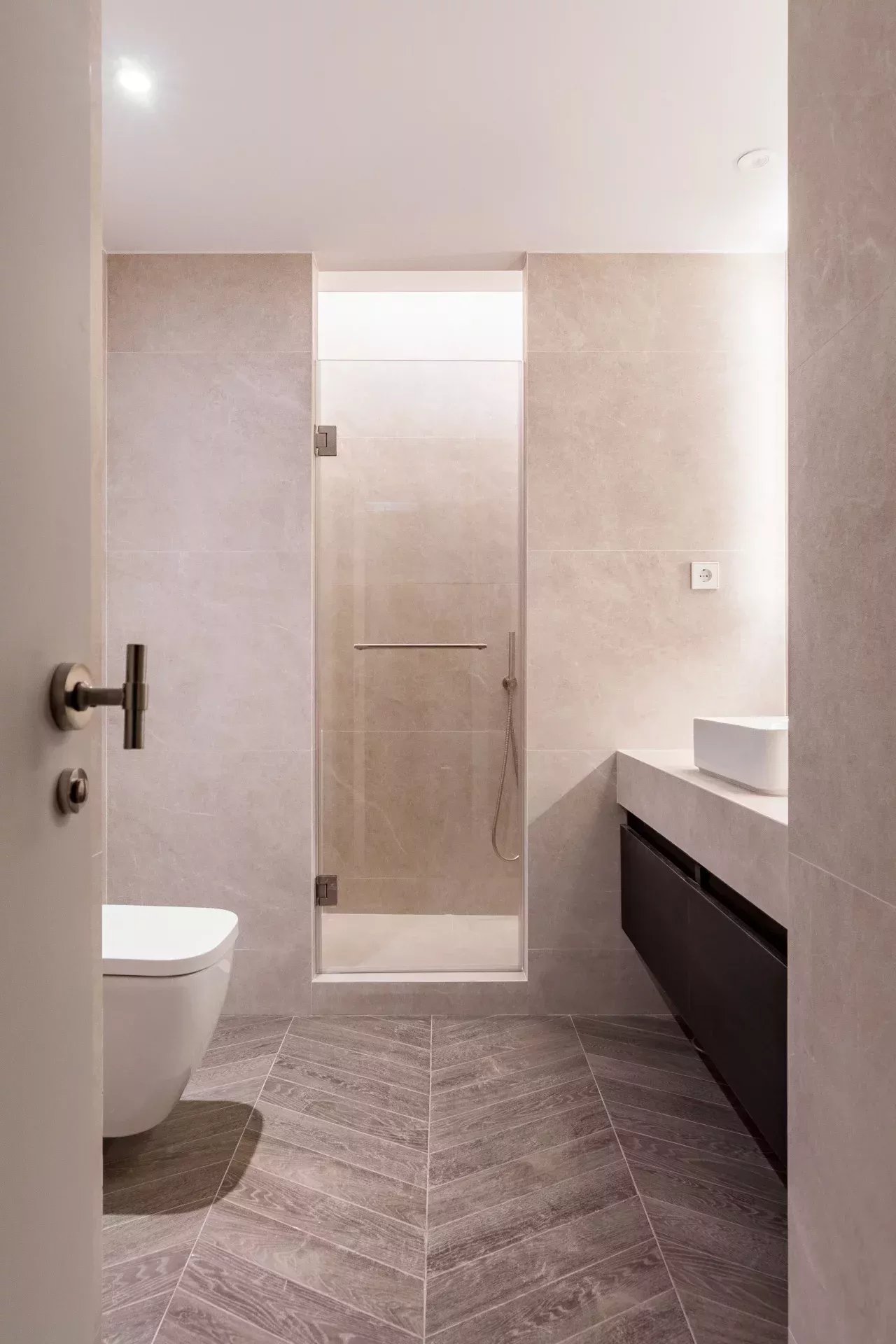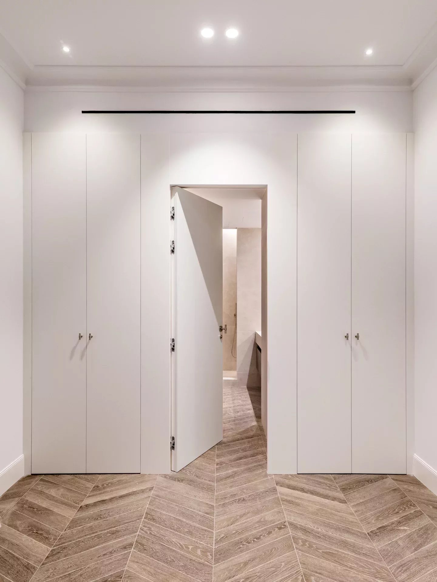 The master bedroom, facing the exterior, is a serene retreat complete with an en-suite bathroom and views of the surrounding historic streetscape. Two additional bedrooms, one of which is also en suite, are located in a private section of the apartment, offering comfort and privacy for guests or family members. The property features three luxurious bathrooms, all with high-end finishes and sleek, modern designs.
