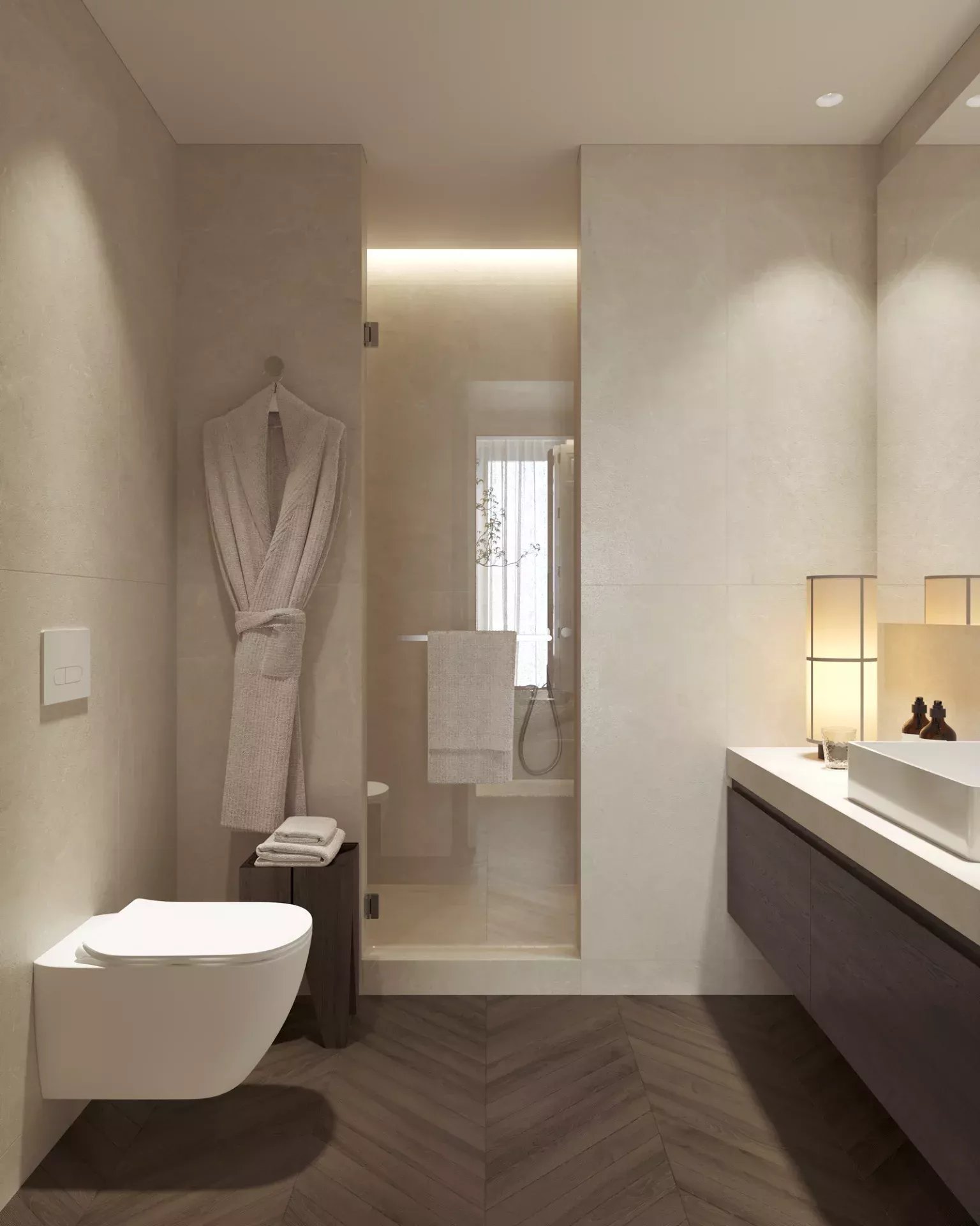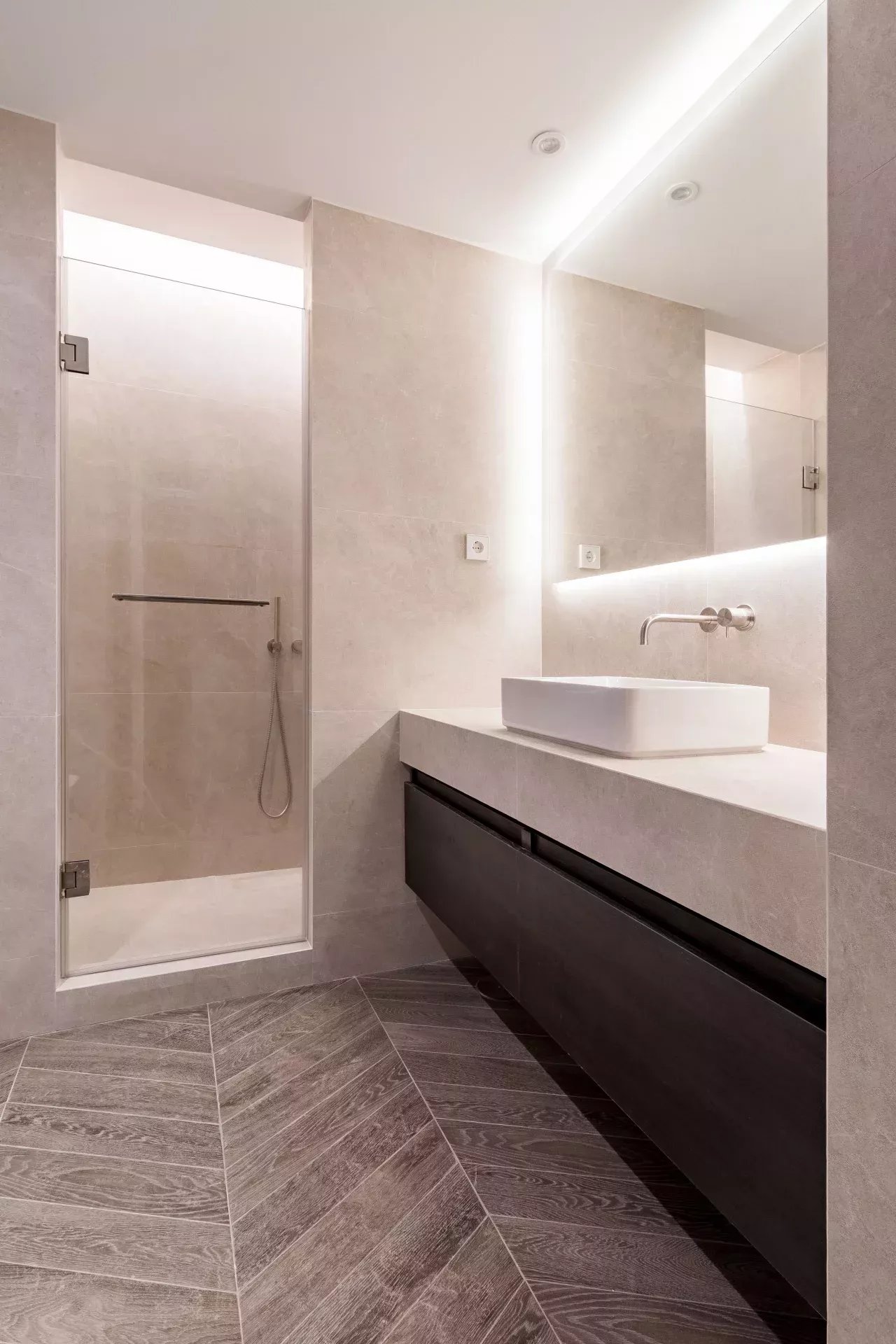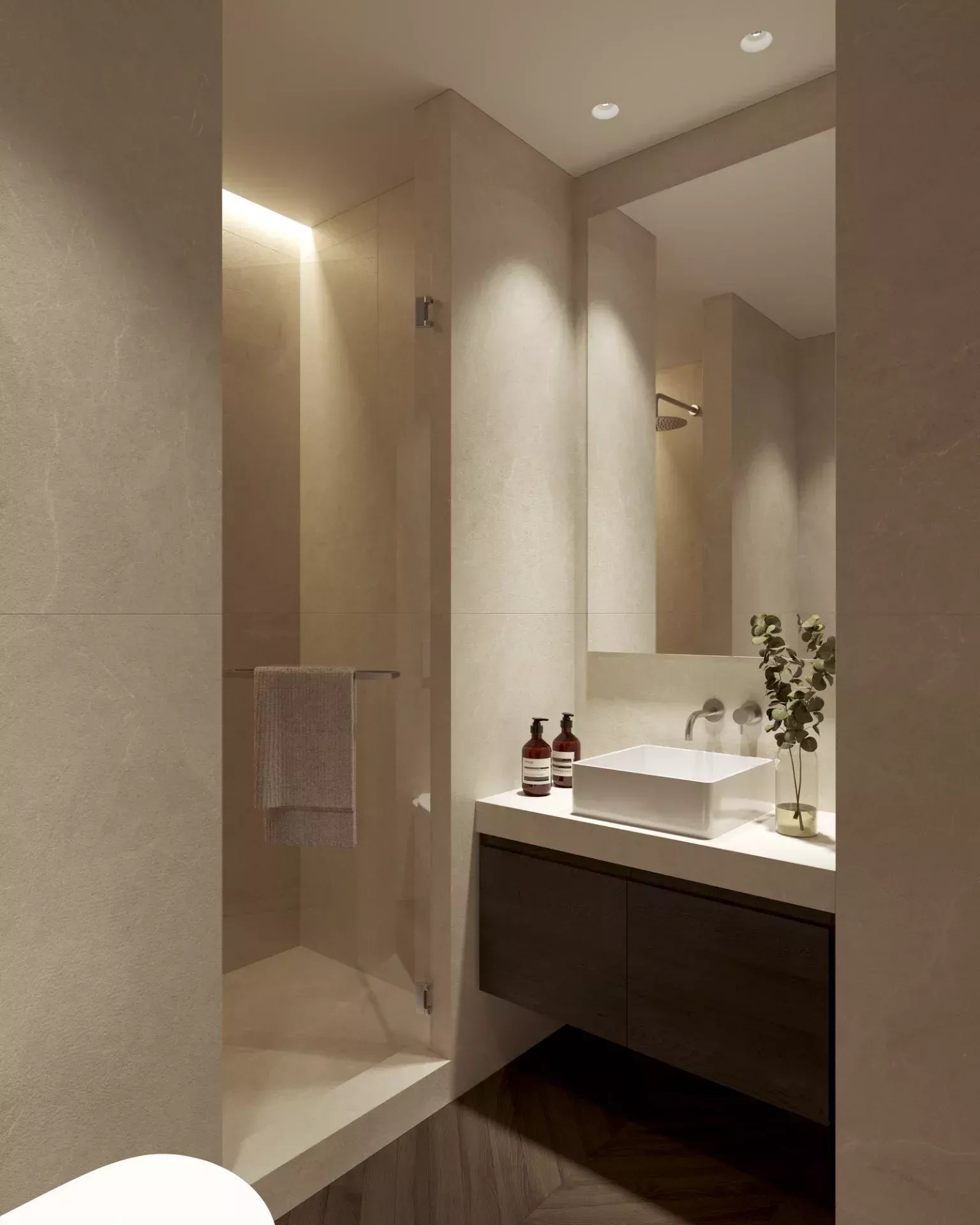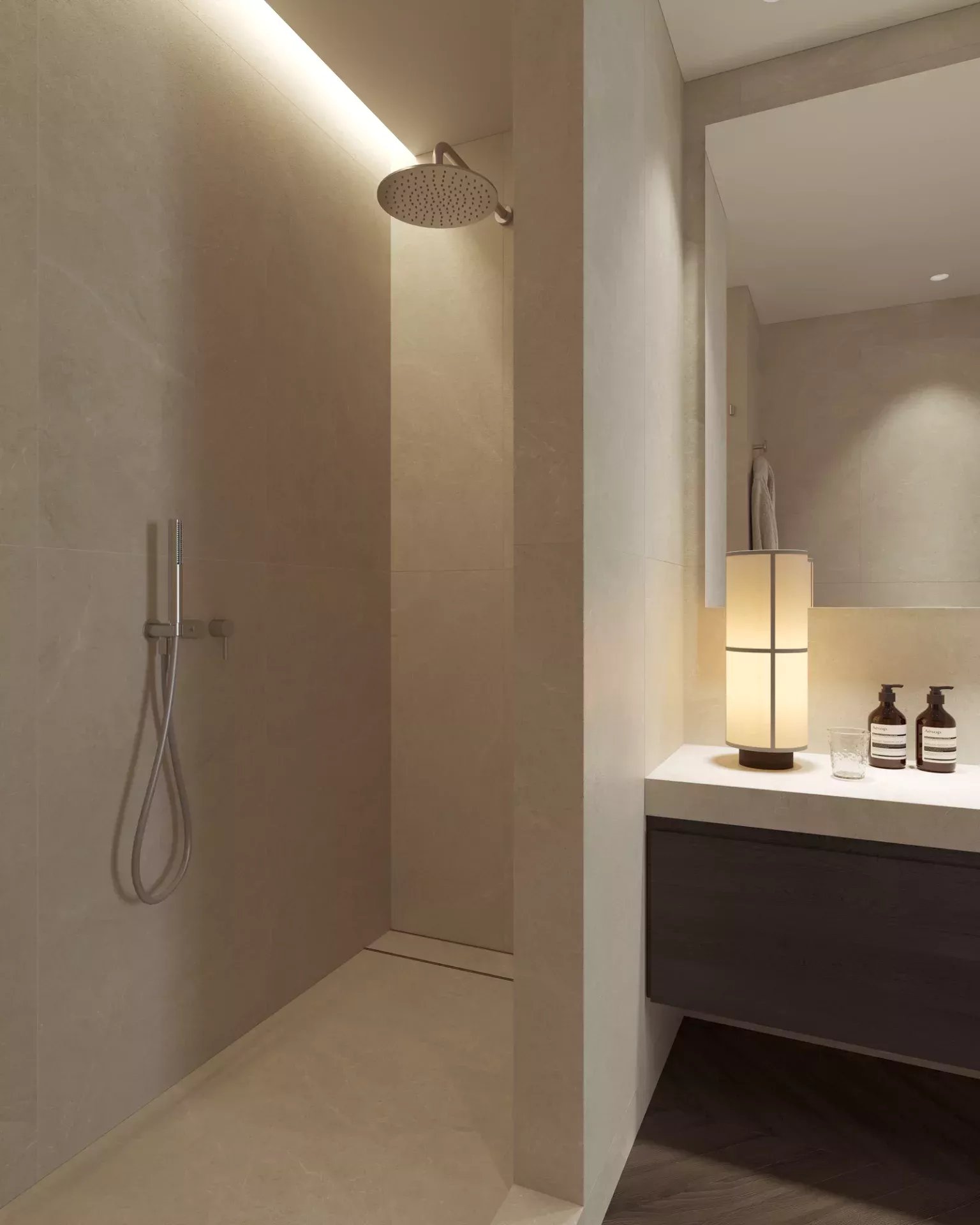 The master bedroom, facing the exterior, is a serene retreat complete with an en-suite bathroom and views of the surrounding historic streetscape. Two additional bedrooms, one of which is also en suite, are located in a private section of the apartment, offering comfort and privacy for guests or family members. The property features three luxurious bathrooms, all with high-end finishes and sleek, modern designs.