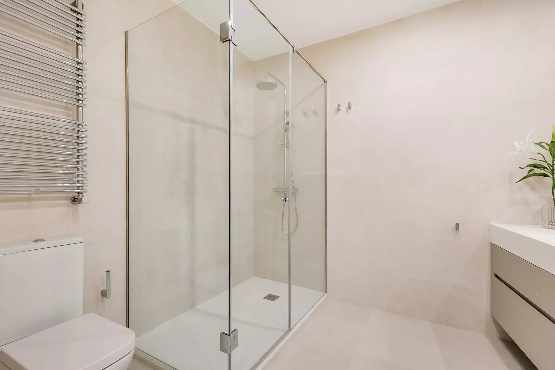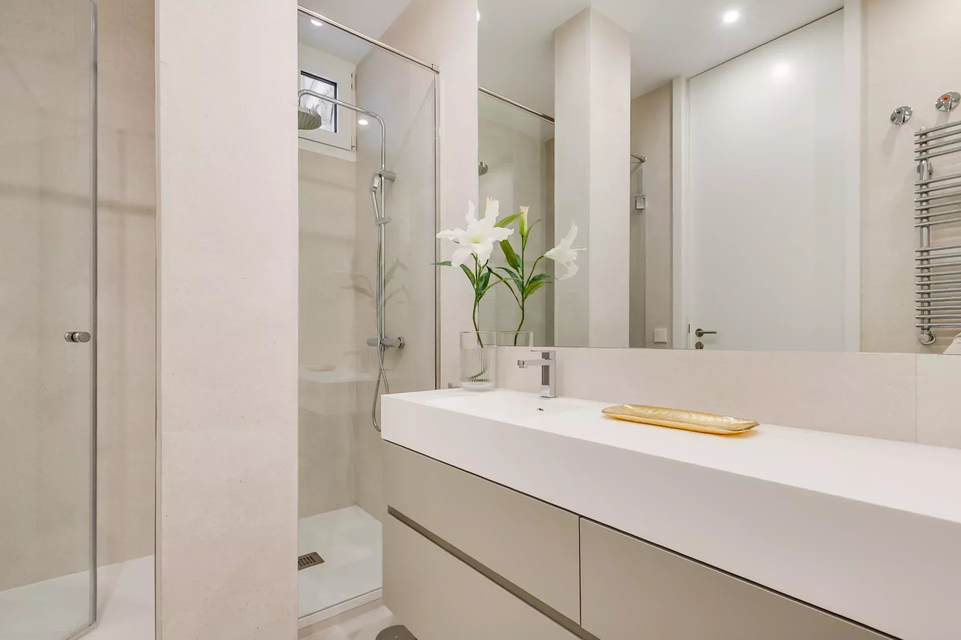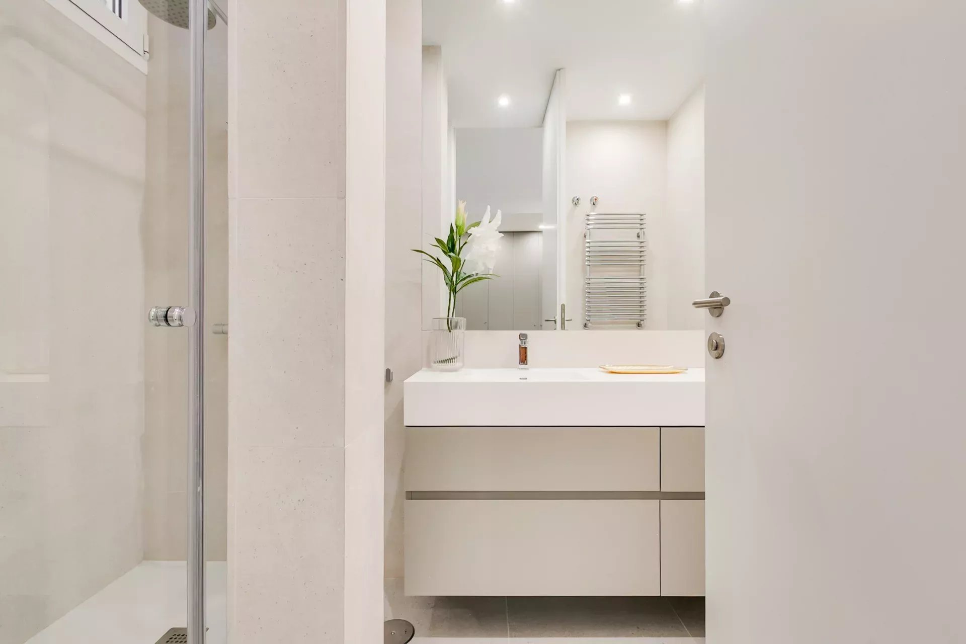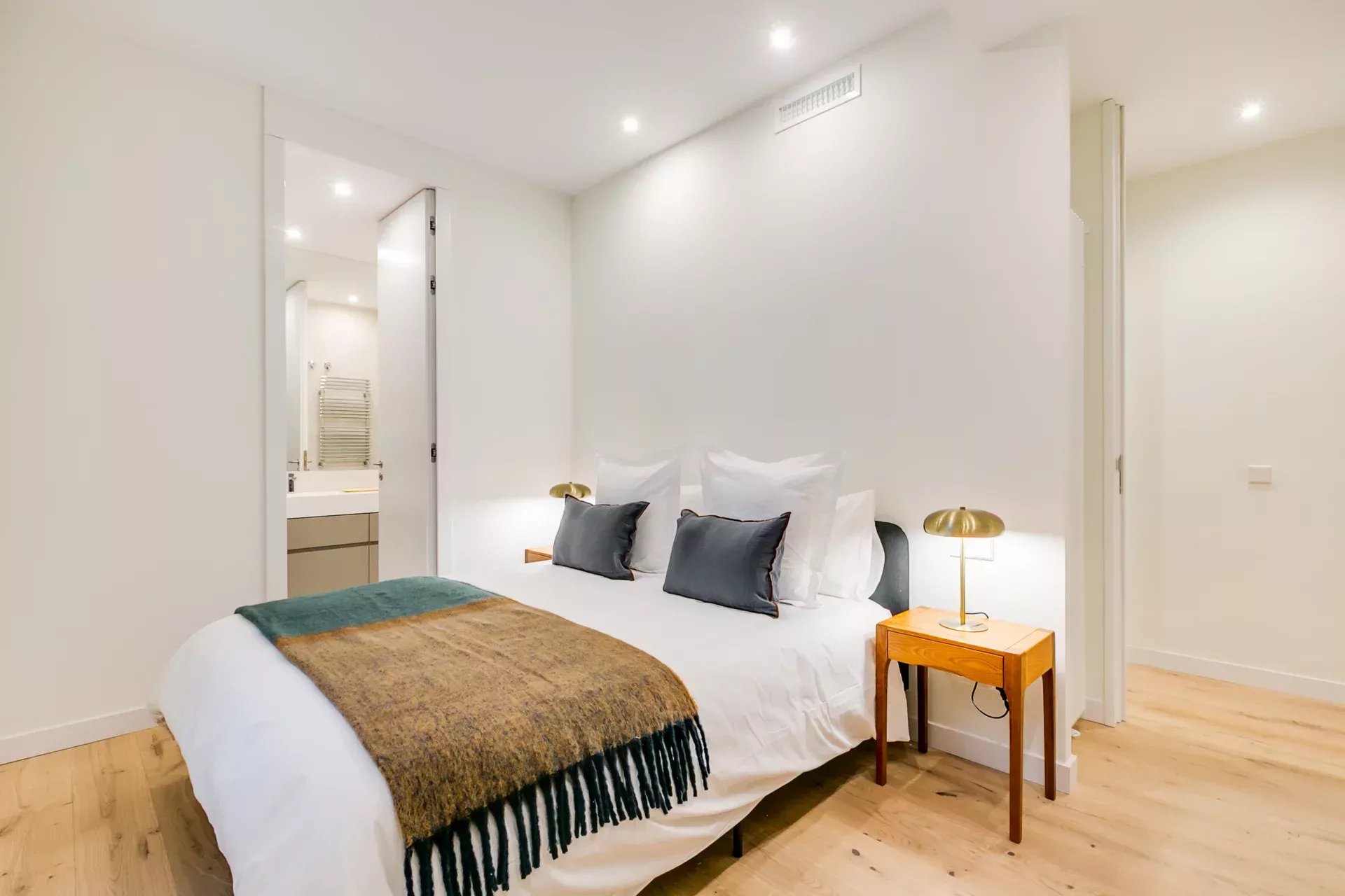 The renovation has preserved the property’s original character while enhancing it with modern details: Porcelanosa large-format floors in common areas and natural wood in bedrooms, designer radiators, ducted air conditioning with room-by-room control, and individual gas heating.