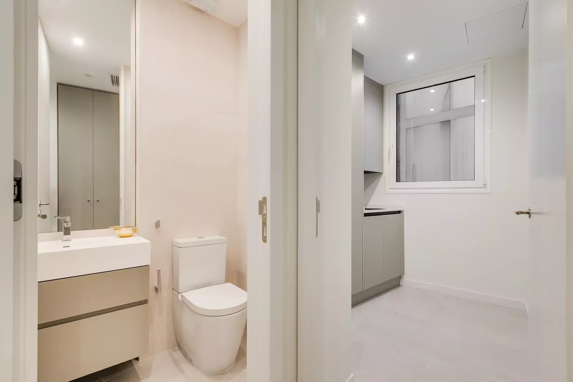 The night area offers two bedroom suites, both with large windows, custom wardrobes, and en-suite bathrooms with spacious showers, bespoke vanities, premium fittings, and Porcelanosa finishes.