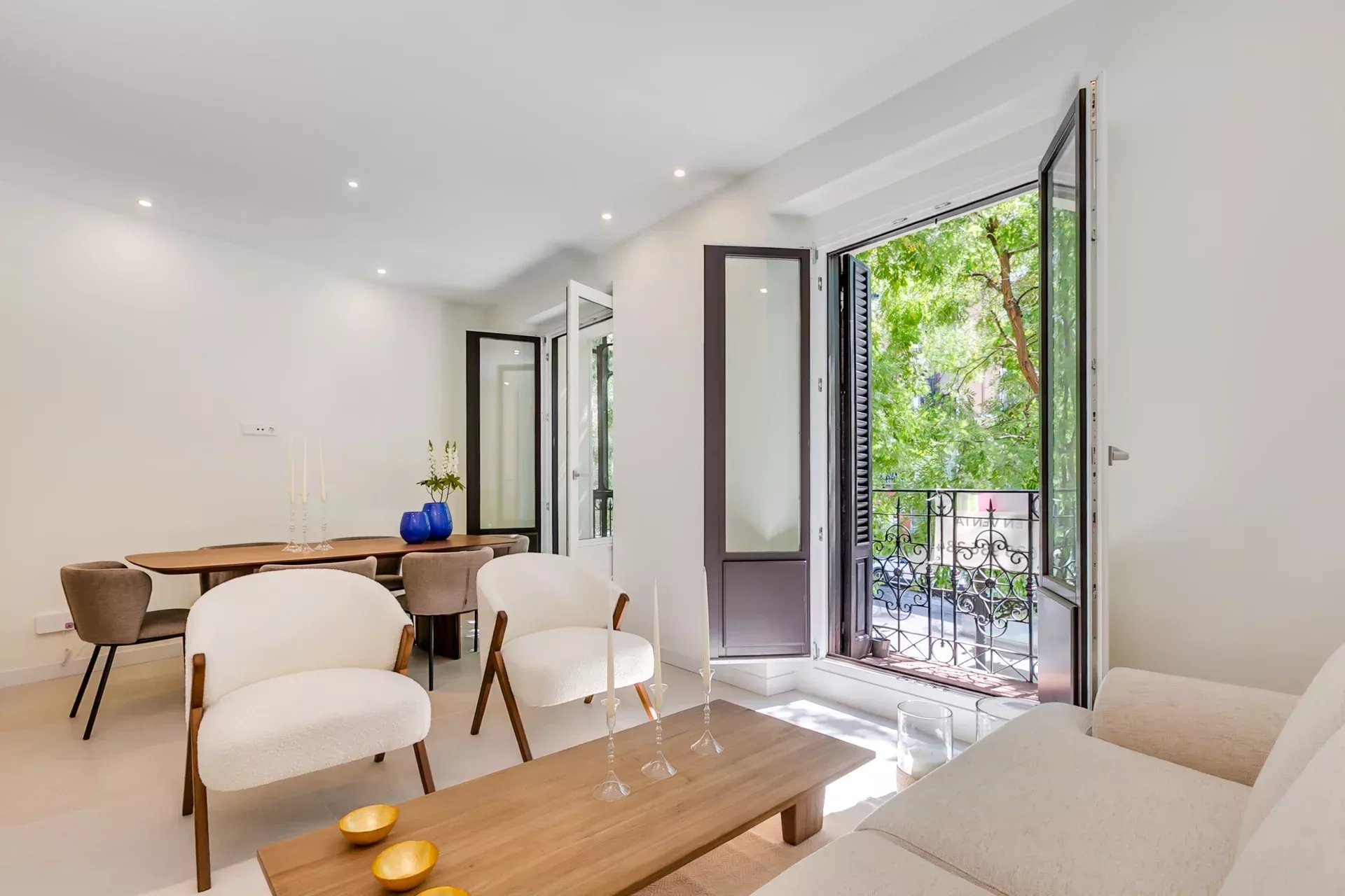 From the entrance, space and natural light take center stage. The living-dining room, warm and elegant, opens to the street through two balconies, one of them enclosed in glass, creating a cozy viewing space with leafy views — a rare sense of calm and privacy in central Madrid.