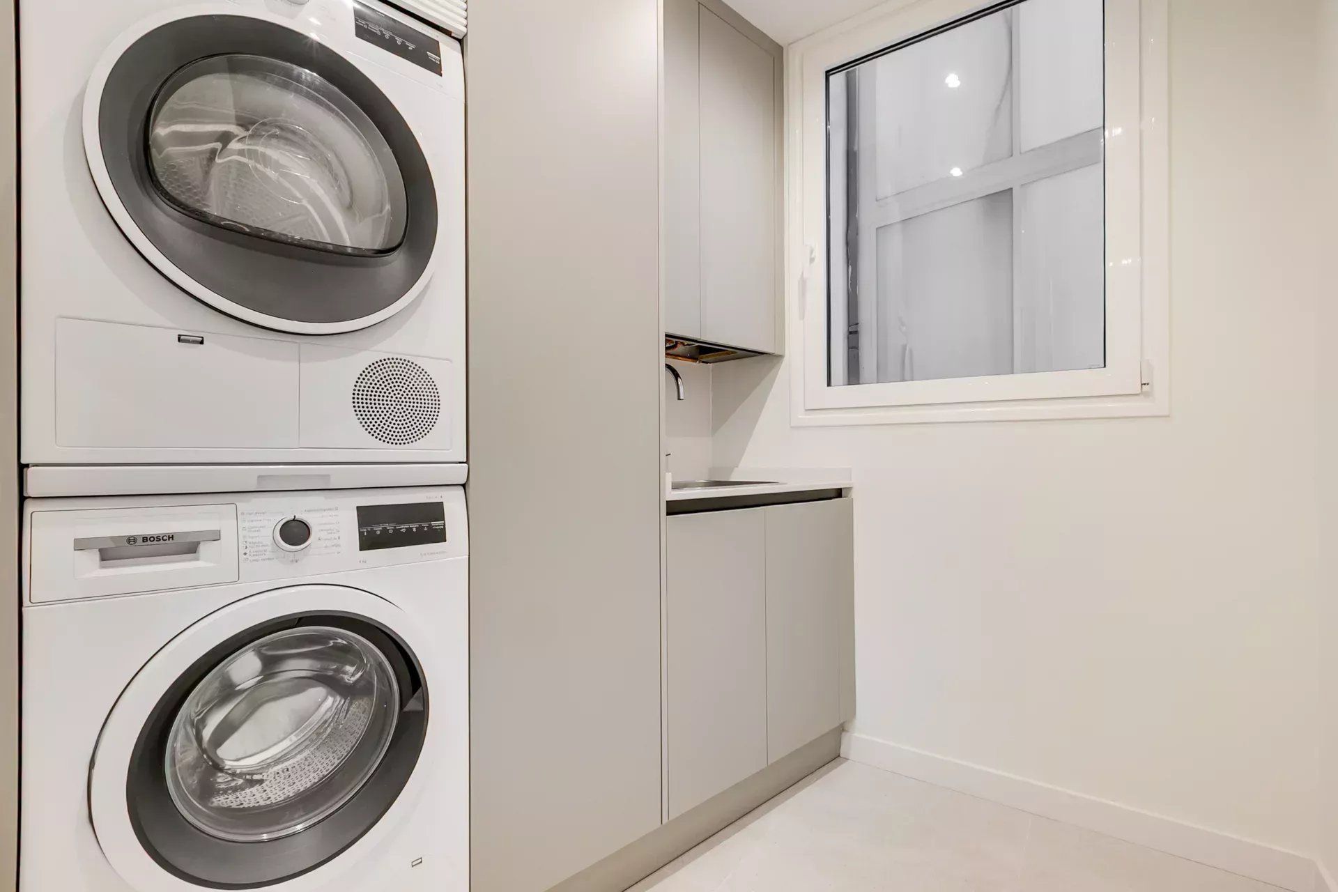 A guest toilet and an independent laundry area complete the social area.