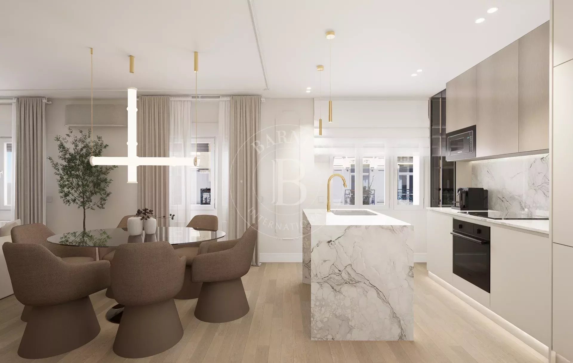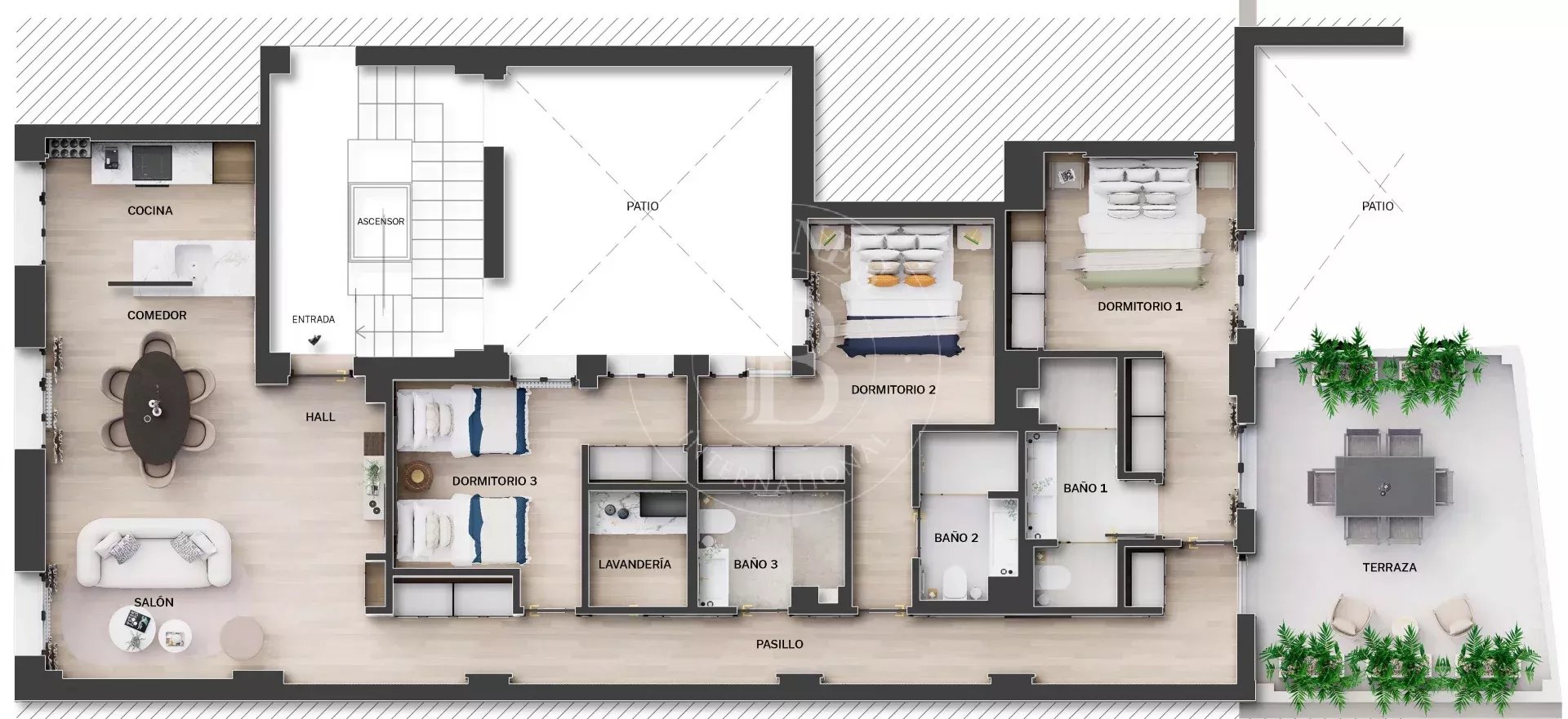 The balanced layout features a spacious living-dining room and a pleasant 20 m² outdoor terrace, creating the perfect space to enjoy both the interior and exterior in the heart of Madrid. The apartment has a fully equipped kitchen with modern designer furniture, three spacious bedrooms, and three full bathrooms, two of which are en suite, as well as a practical laundry room.