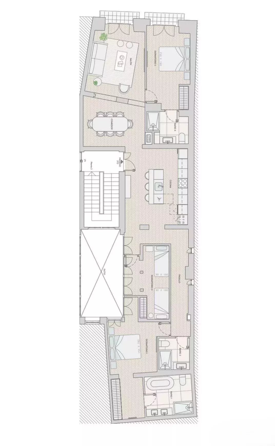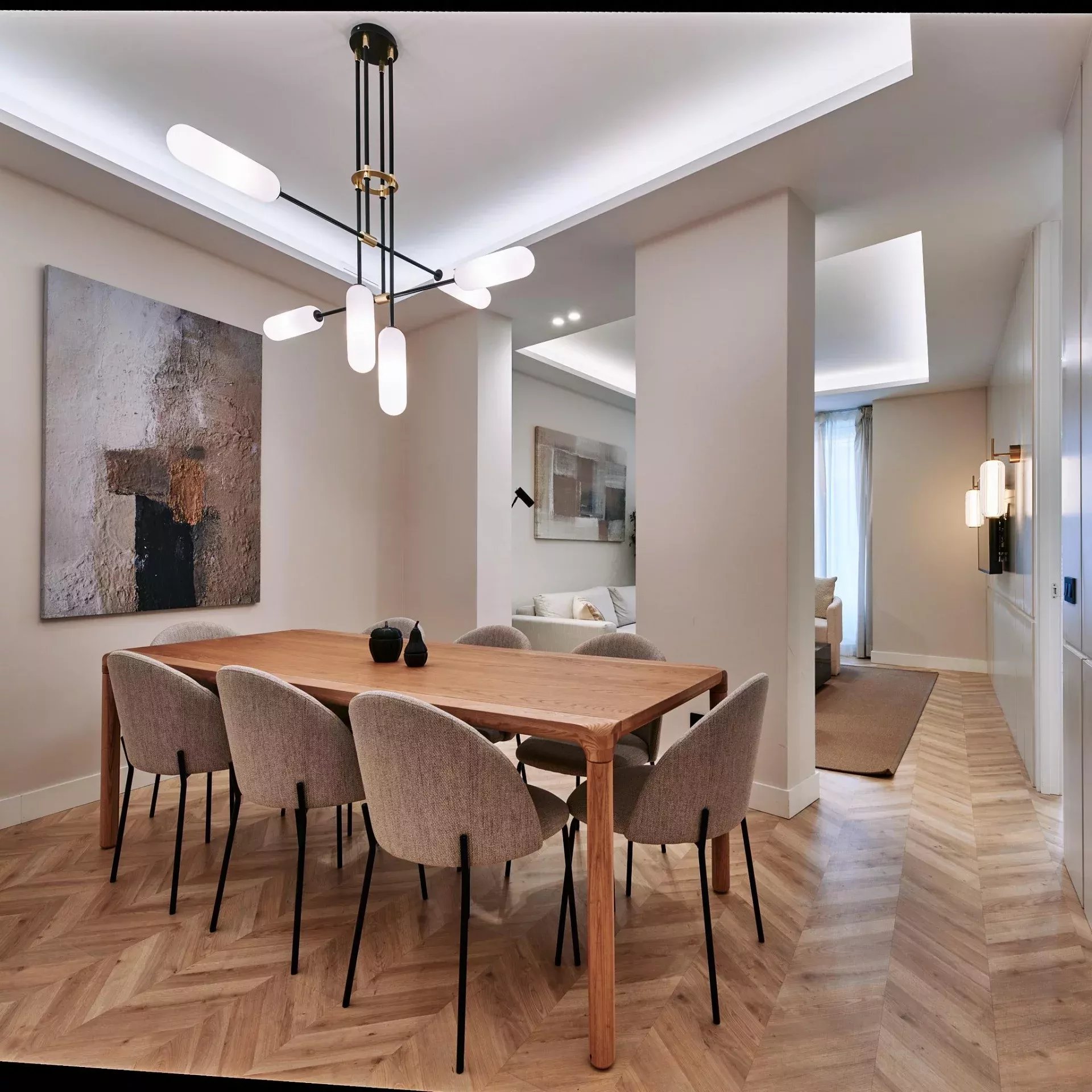 Located on the second floor of a classic building without an elevator, the property has been completely renovated by a renowned architecture studio, which has achieved a perfect balance between modernity and character. With 139 m² of floor space, this property has three bedrooms and three full bathrooms, two of which are en suite. Natural light floods every room, enhanced by careful LED lighting and wooden details that bring great warmth to the rooms. The kitchen is fully equipped with high-end appliances and the apartment is delivered fully furnished and ready to move into. The heating is individual gas, and there is also air conditioning throughout the apartment.