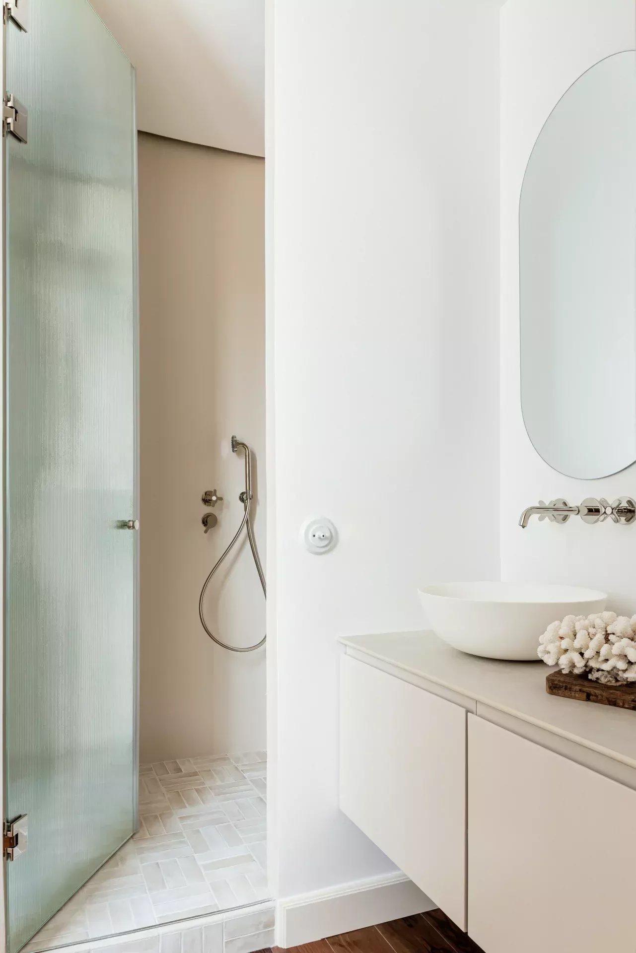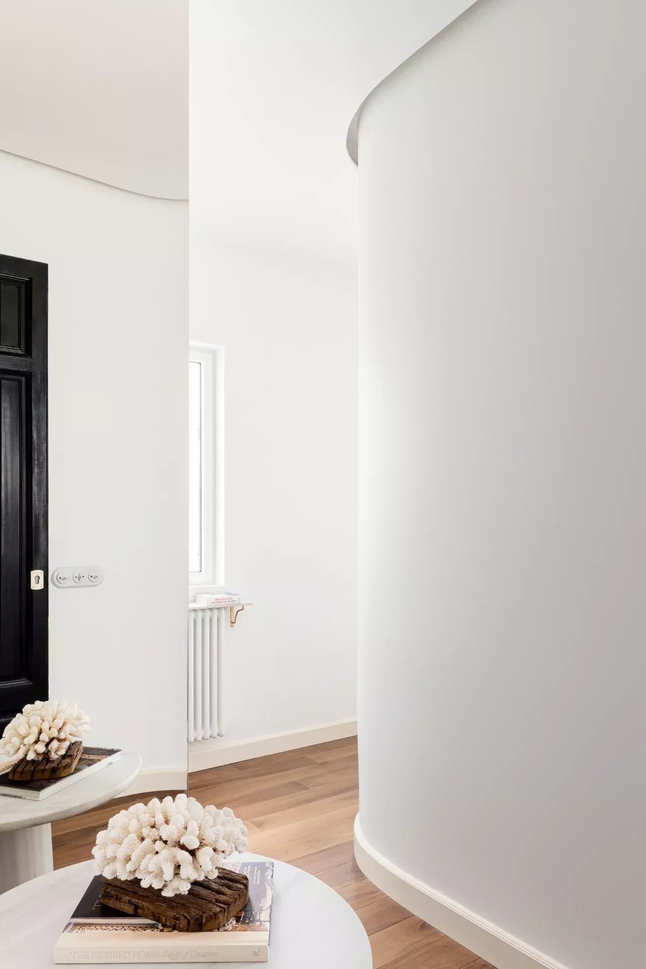 The interior of this luxurious apartment is bathed in natural light, creating a bright and inviting ambiance throughout. Floor-to-ceiling windows frame breathtaking views of the Madrid skyline, enhancing the sense of space. The residence features a neutral color palette, clean lines, and elegant furnishings, evoking the serene sophistication of a Mediterranean villa.