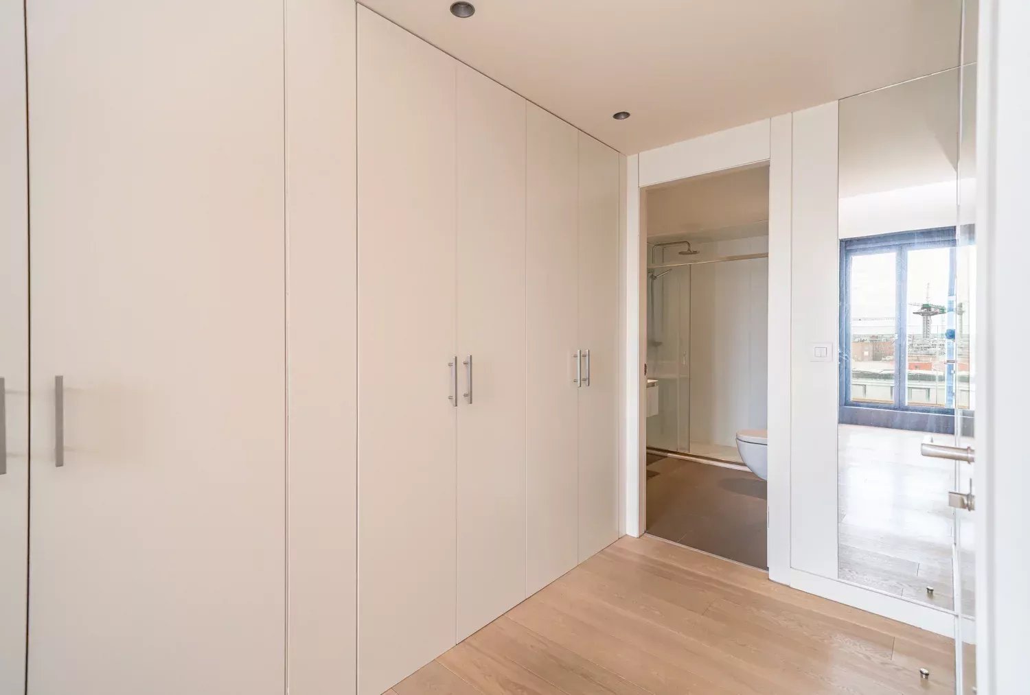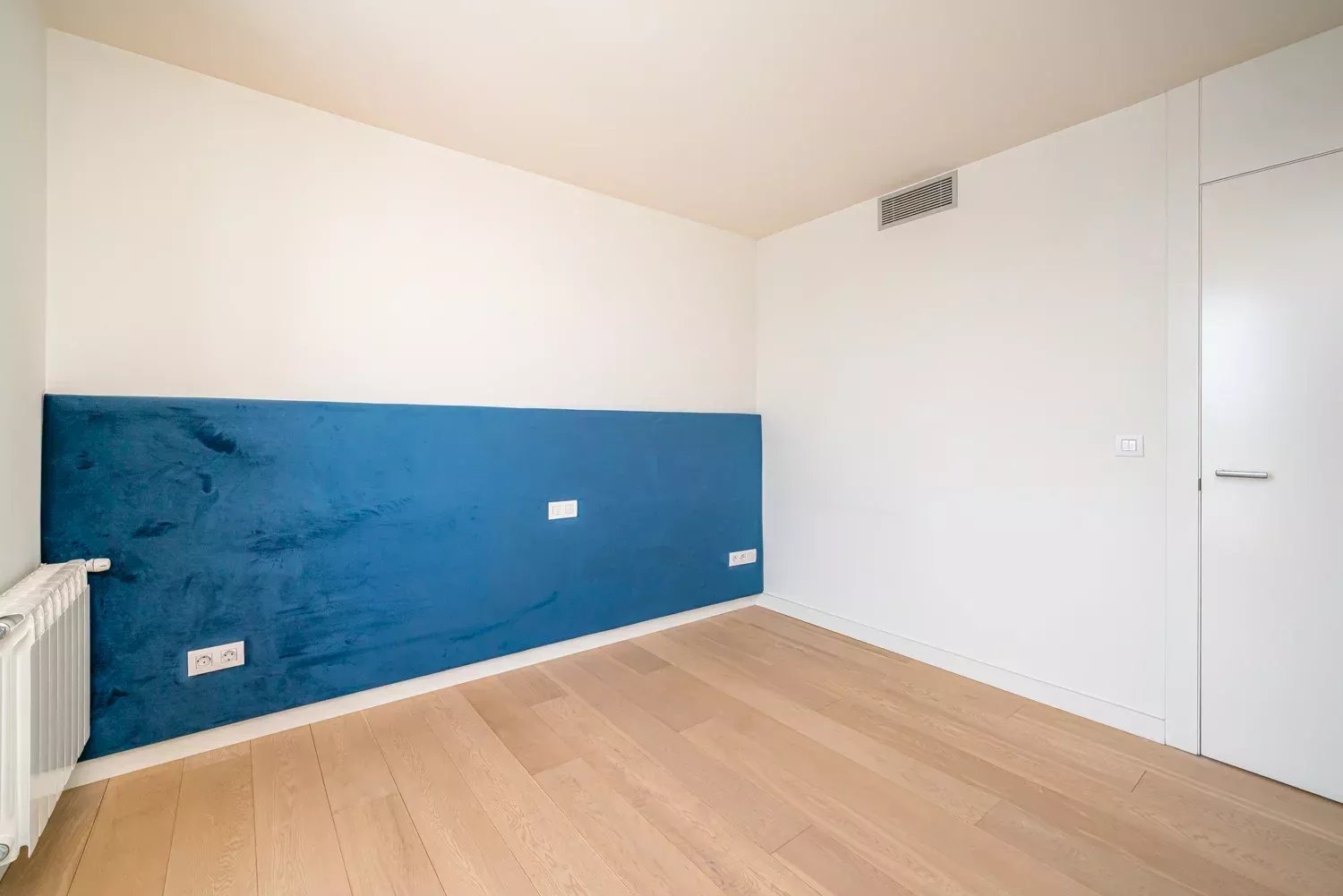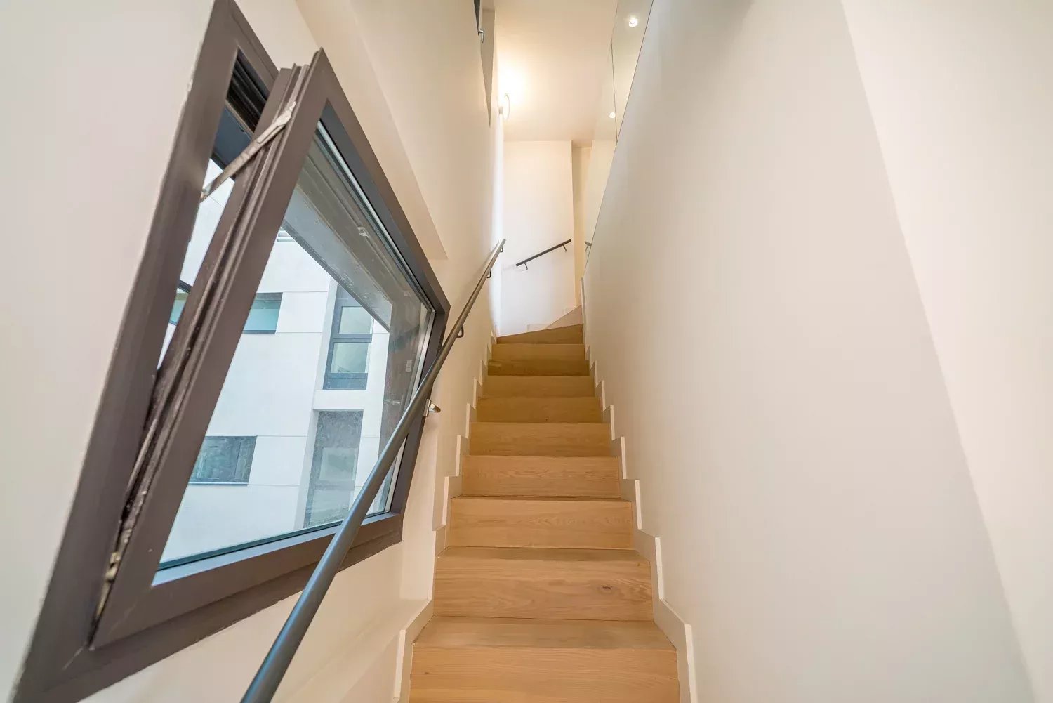 An elegant staircase with a glass balustrade reinforces the modern style of the apartment and leads to the upper floor. Here, you’ll find two double bedrooms. The first features floor-to-ceiling built-in wardrobes and access to the second terrace. A bathroom is conveniently located just opposite. The master suite stands out for its spaciousness, natural light, direct terrace access, and an en-suite bathroom with a bathtub.