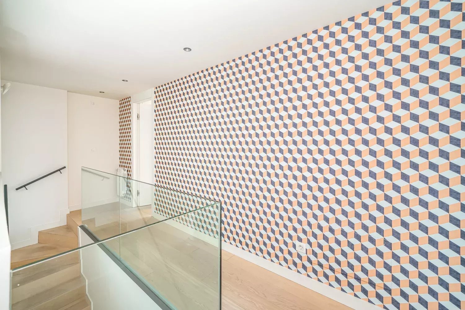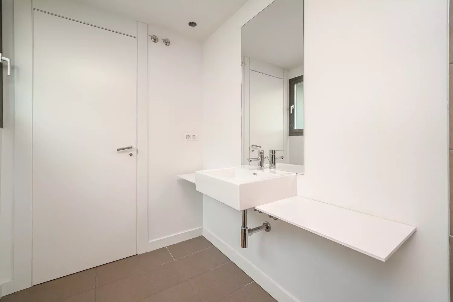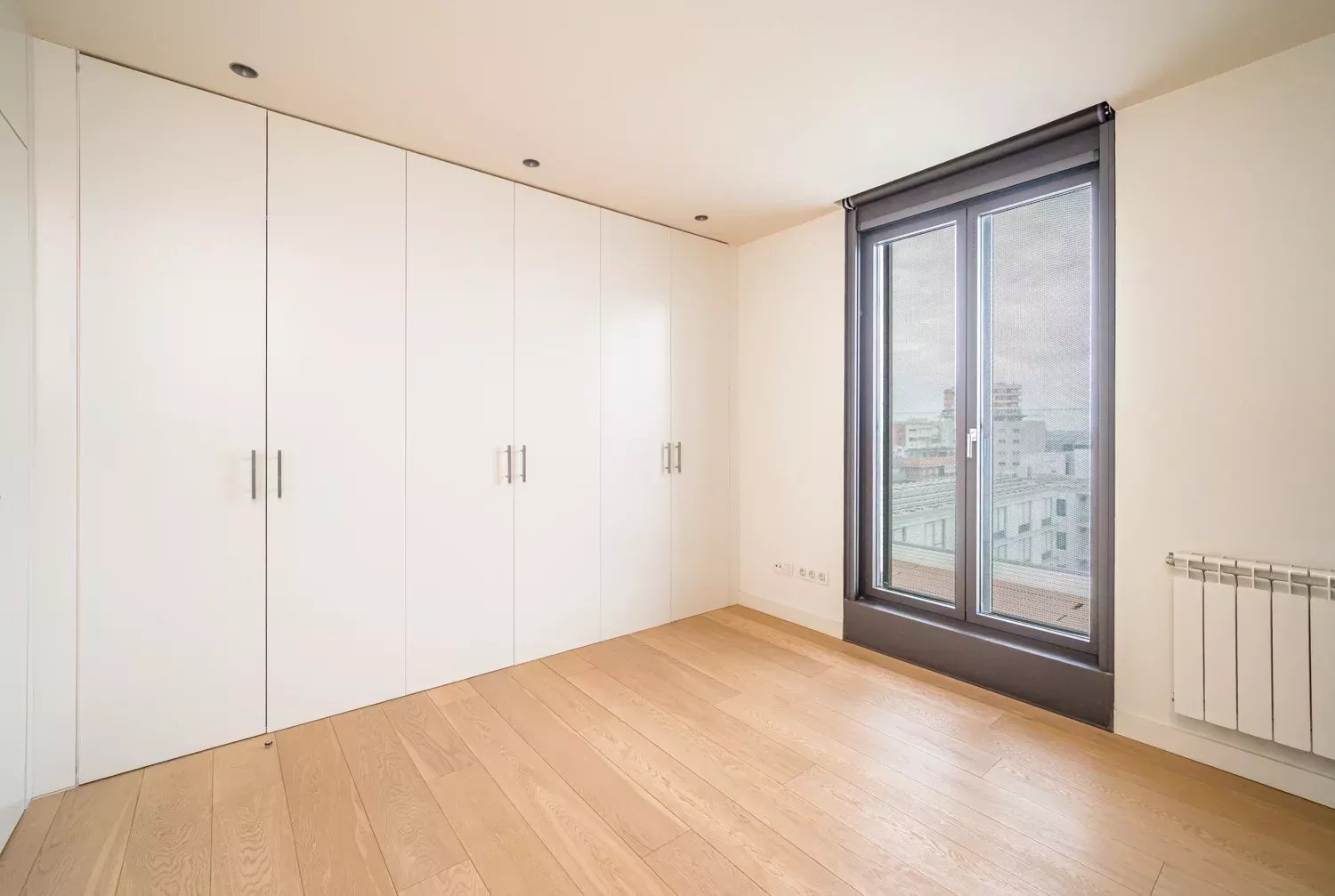 An elegant staircase with a glass balustrade reinforces the modern style of the apartment and leads to the upper floor. Here, you’ll find two double bedrooms. The first features floor-to-ceiling built-in wardrobes and access to the second terrace. A bathroom is conveniently located just opposite. The master suite stands out for its spaciousness, natural light, direct terrace access, and an en-suite bathroom with a bathtub.